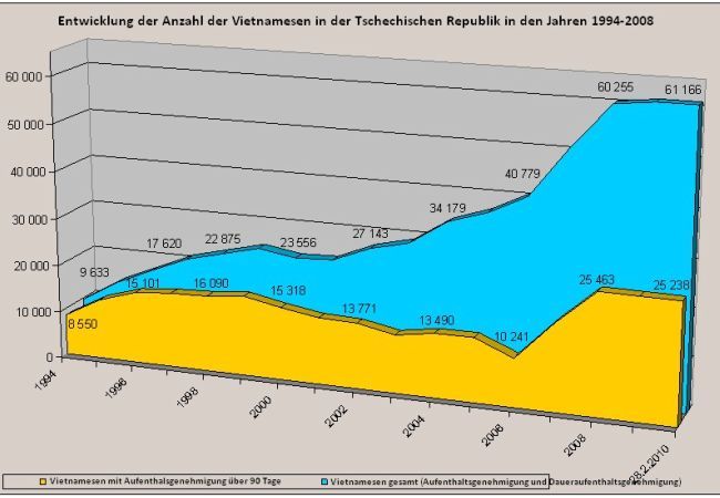 Als wir eine mangelnde Vorbereitung erwähnt haben, dass die Vietnamesen zu einem Teil der tschechischen Gesellschaft werden könnten, war das eine einseitige Aussage, da dies nicht nur für die Tschechen gilt, sondern auch für die Immigranten selbst. Wir begegnen immer wieder der Vorstellung, dass die Vietnamesen mit einem klaren Plan hier herkämen, der nicht nur Geld verdienen, sondern auch eine dauerhafte Ansiedlung beinhaltet. Betrachten wir die zahlenmäßigen Fakten, die uns zur Verfügung stehen, dann scheint es, als ob dem tatsächlich so sei. Fast sechzig Prozent der Vietnamesen haben in Tschechien bereits den so genannten unbefristeten Aufenthaltsstatus erhalten, der den Migranten gewisse Vorteile bietet, beziehungsweise die minimale Sicherheit, dass sie nicht Jahr für Jahr bei den Ämtern die Verlängerung ihrer Aufenthaltserlaubnis beantragen müssen. Im Vergleich zu den anderen zahlenmäßig großen Gruppen von Ausländern beantragen die Vietnamese die meisten unbefristeten Aufenthaltsgenehmigungen. Sie sind auch die größte Gruppe, die Aufenthaltsgenehmigungen zum Zweck der Familienzusammenführung erhält.