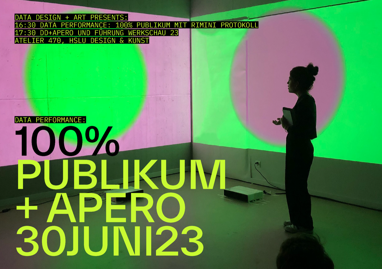 100% Publikum. Ein grosser, leerer Raum mit Schwarz verhüllten Fenstern. Darin 40 Menschen. Aus einem Lautsprecher erklingen Fragen. Die Menge stellen sich nach Grösse auf, nach Alter, und nach Augenfarbe. Dann nach Anzahl Geschwister, nach Anzahl bereister Länder. Nach Suchtverhalten oder Umgang mit Beziehungen. Teilweise anonym und mit verbundenen Augen. Im offenen Fachmodul «Data Performance» entwickelten Studierende aus allen Bachelorbereichen von Design Film Kunst in Zusammenarbeit mit dem Theaterkollektiv Rimini Protokoll die Daten-Performance «100% Publikum». Das Modul verfolgte Ansätze und Ideen wie Daten performativ und körperlich visualisiert werden können. Dabei stand die Frage im Zentrum, wie wir uns als Individuum gegenüber und innerhalb einer Gruppe verhalten. Was geben wir von uns Preis? Wo sind wir zugehörig, wo grenzen wir uns ab? Wann antworten wir wahrheitsgetreu, wann behalten wir die Wahrheit für uns? Durch den körperlichen Ausdruck wurden qualitative Daten quantifiziert und räumlich darstellbar. Dabei wurde das Publikum selbst zu Protagonist:innen. Sie repräsentierten individuelle Datenpunkte im Raum und waren gleichzeitig Teil einer kollektiven Antwort.
