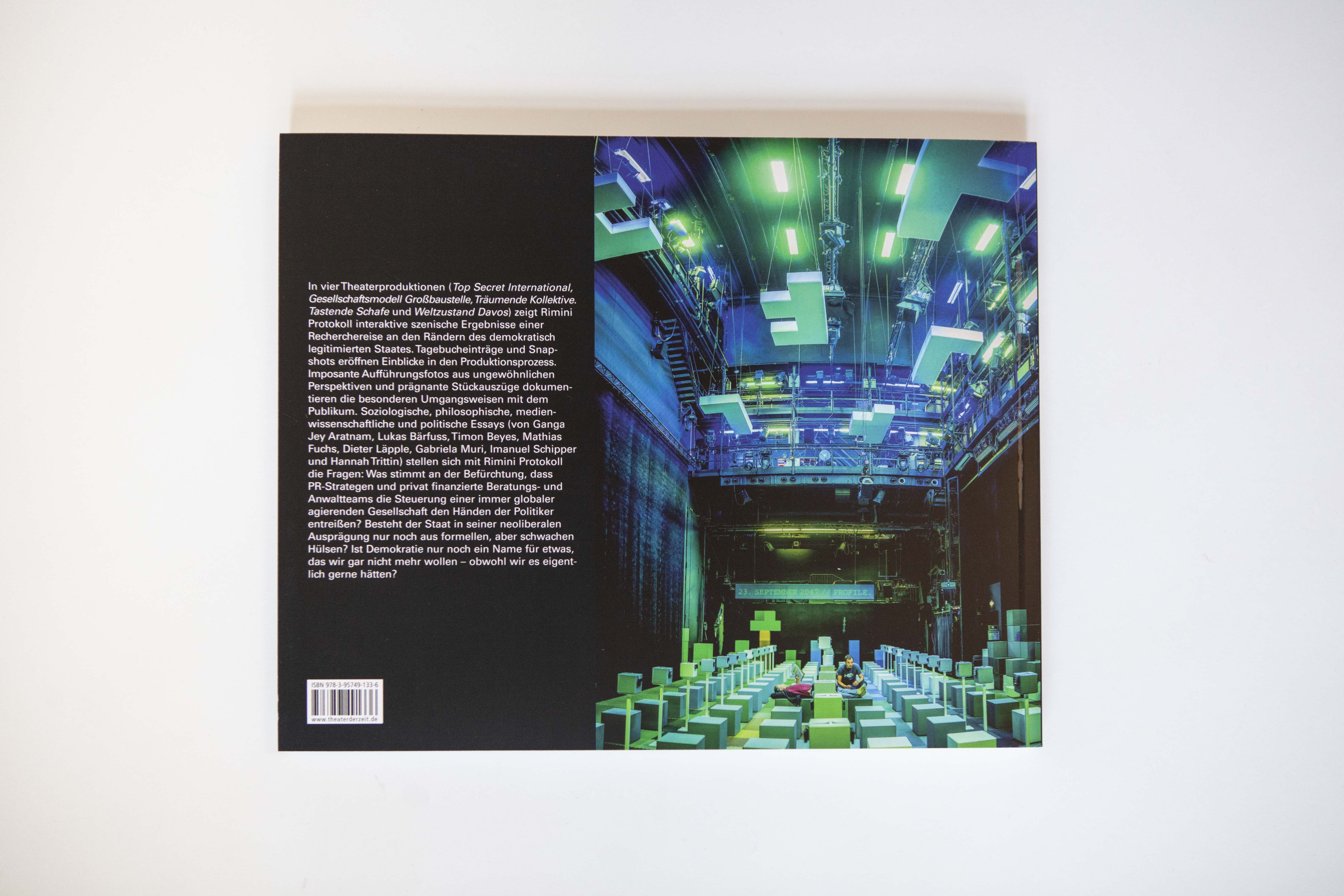 In vier Theaterproduktionen (Top Secret International, Gesellschaftsmodell Großbaustelle, Träumende Kollektive. Tastende Schafe und Weltzustand Davos) zeigt Rimini Protokoll interaktive szenische Ergebnisse einer Recherchereise an den Rändern des demokratisch legitimierten Staates. Tagebucheinträge und Snap-shots eröffnen Einblicke in den Produktionsprozess. Imposante Aufführungsfotos aus ungewöhnlichen Perspektiven und prägnante Stückauszüge dokumentieren die besonderen Umgangsweisen mit dem Publikum. Soziologische, philosophische, medien-wissenschaftliche und politische Essays (von Ganga Jey Aratnam, Lukas Bärfuss, Timon Beyes, Matthias Fuchs, Dieter Läpple, Gabriela Muri, Imanuel Schipper und Hannah Trittin) stellen sich mit Rimini Protokoll die Fragen: Was stimmt an der Befürchtung, dass PR-Strategen und privat finanzierte Beratungs- und Anwaltteams die Steuerung einer immer globaler agierenden Gesellschaft den Händen der Politiker entreißen? Besteht der Staat in seiner neoliberalen Ausprägung nur noch aus formellen, aber schwachen Hülsen? Ist Demokratie nur noch ein Name für etwas, das wir gar nicht mehr wollen – obwohl wir es eigentlich gerne hätten?