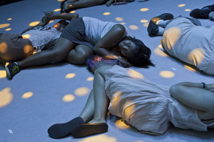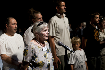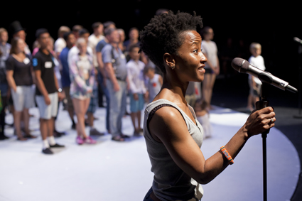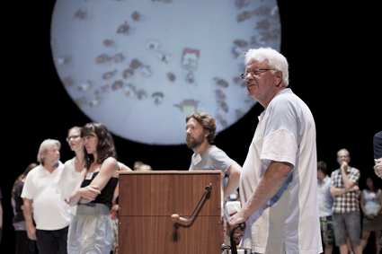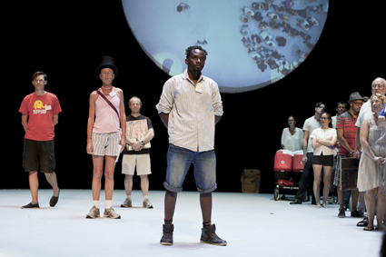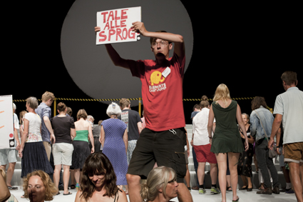 At first, this casting process was easy. But with each passing day, the stakes increased. As the various statistical categories began to fill up, the chances of finding people who could occupy the remaining categories became more remote. Gaps had to be filled, new connections established, some people could only be found through newspaper ads and networking. But now, around four months later, these 100 interconnected Copenhageners are performers of presenting themselves and they are percentage points, representing 5622.53 other Copenhageners in the meantime, that is, 1% of Copenhagen. Together, these 100 people represent a demographic profile of Copenhagen. A series of statistical groupings enacted onstage, like a giant pie chart brought to life, a mass that embodies the city, a choir that hasn't studied any songs, a survey construction that is continually reconfigured in to new group situations, ephemeral portraits of belonging and antagonisms, a parliament of residents, a geometric body with 100 heads on 100 m² of stage.