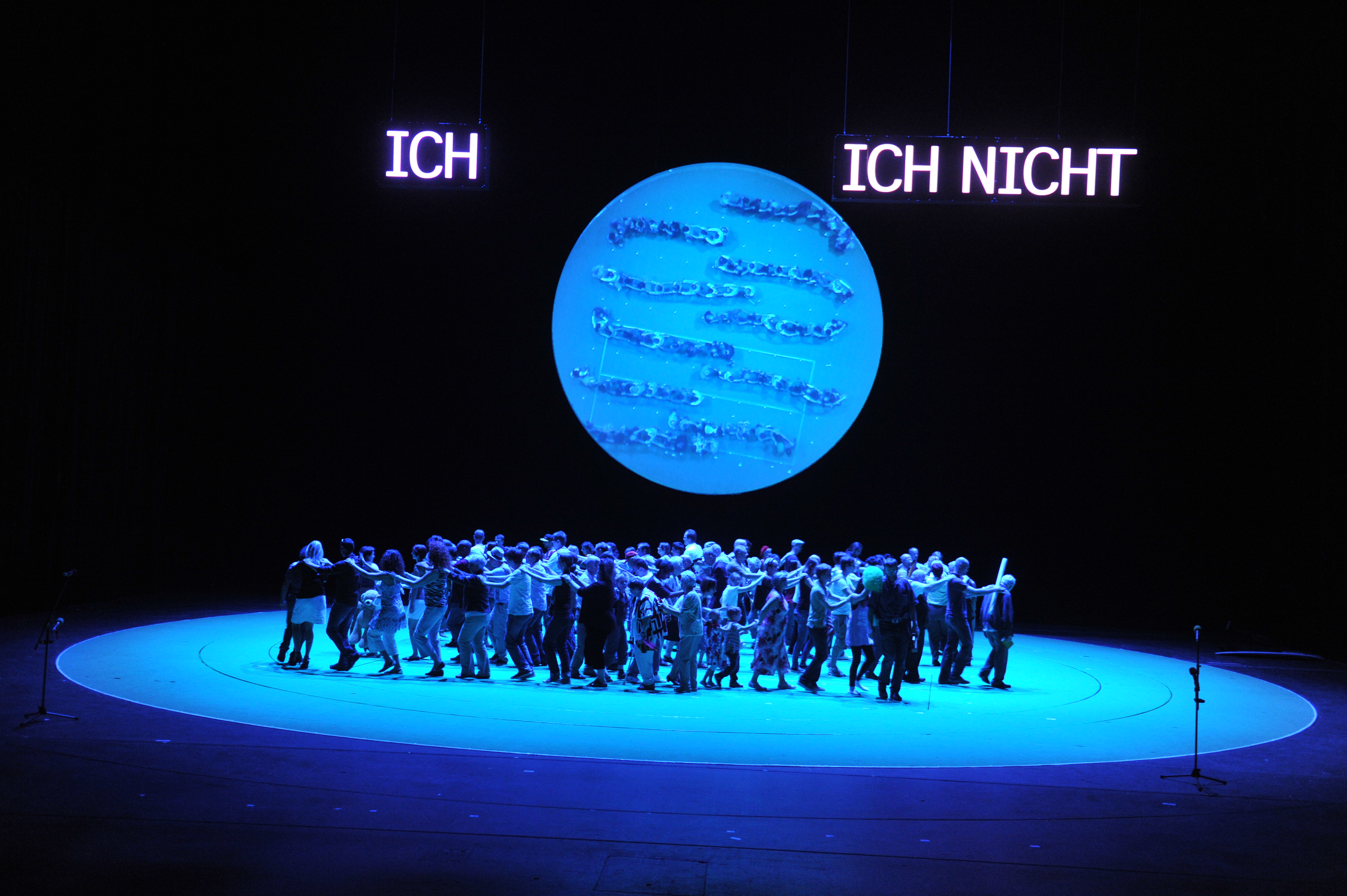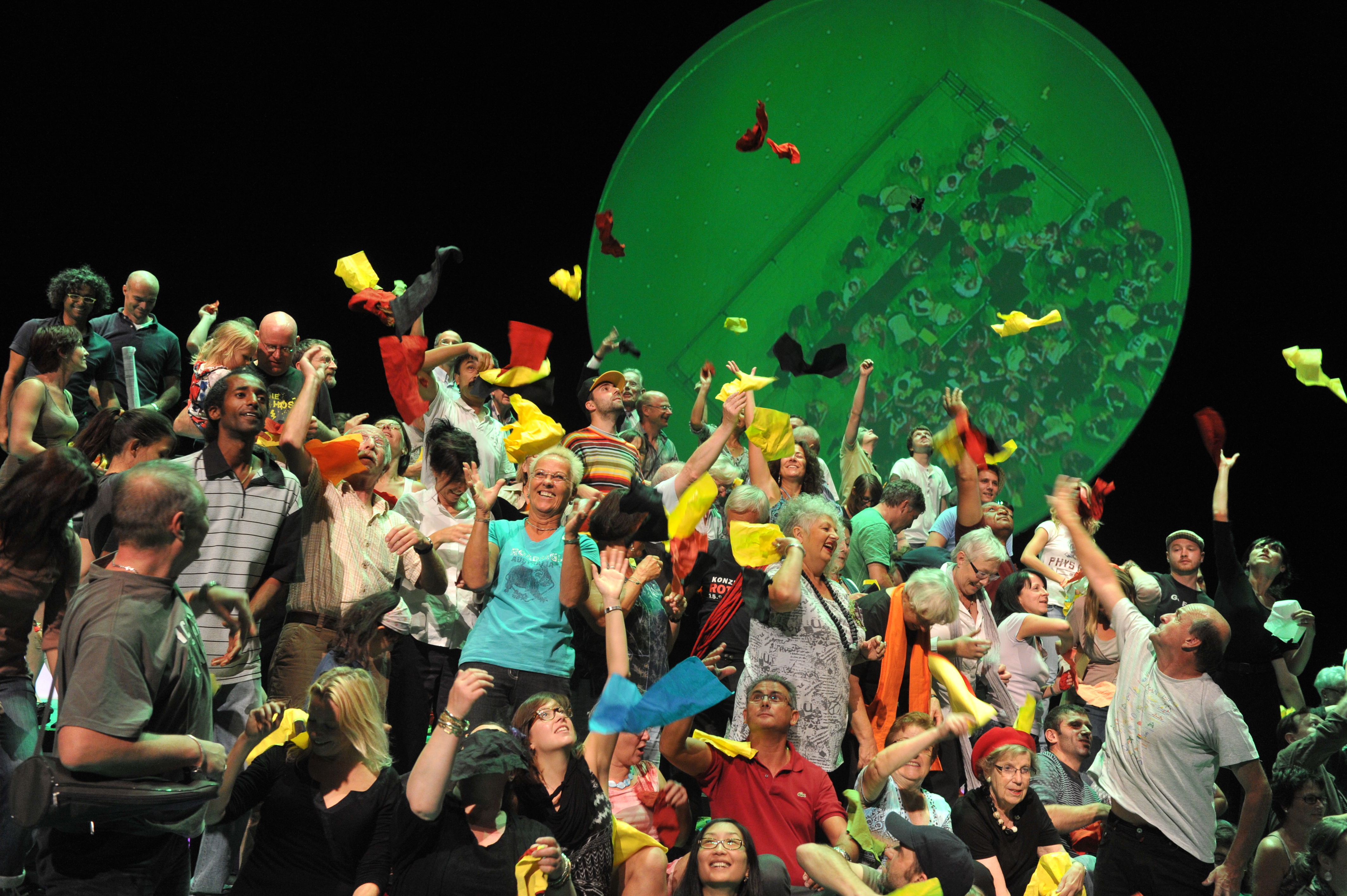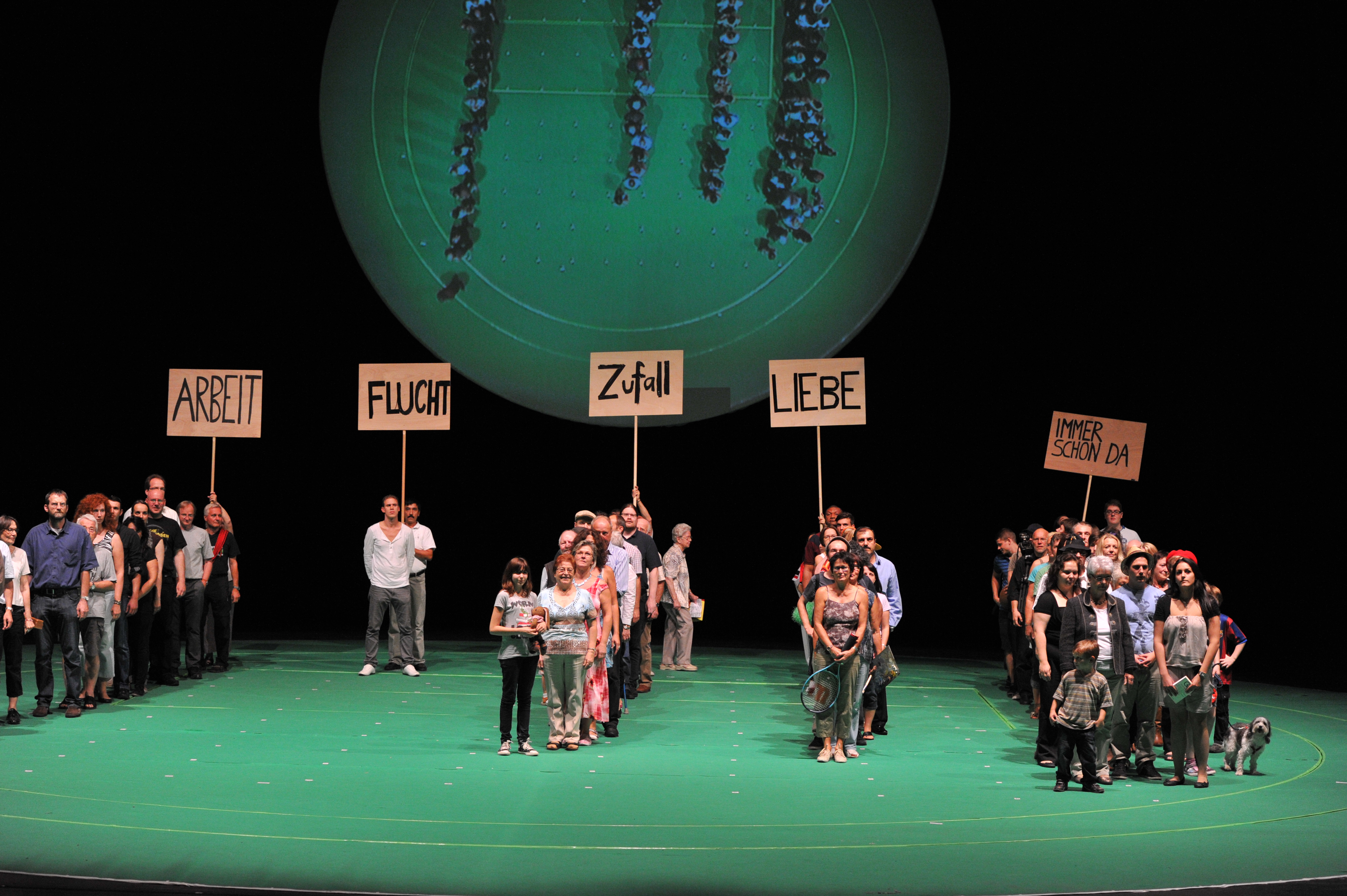 Und wie dieser Bevölkerungsquerschnitt konkret aussieht, wie der Einzelne empfindet, entscheidet und lebt, das wird sich erst zeigen, wenn sich am 28. September 2011 der rote Vorhang des Staatstheater hebt – den es allerdings so nicht mehr gibt, denn aus ihm wurden - so die Legende – 1951 die ersten Roben der Richter des Bundesverfassungsgerichts geschneidert. 100 Prozent Karlsruhe ist eine Ansammlung, die eine Stadt ist, eine Gruppe, die sich erst wahrzunehmen beginnt, ein Chor, der noch nie geübt hat, ein unmögliches Gebilde mit vielen Gesichtern. Gruppenbilder als flüchtige Portraits von Zugehörigkeit. Als Familienersatz oder Kleinstverein. Nach Alter oder Wohnsitz, nach Geschlecht, politischer Gesinnung sortiert, in Meinungen, Haltungen, Überzeugungen und Erfahrungshorizonte gestaffelt dann, nach und nach, als Stimmenmeer, als geometrischer Körper auf mehr als 100 Quadratmetern Bühne...