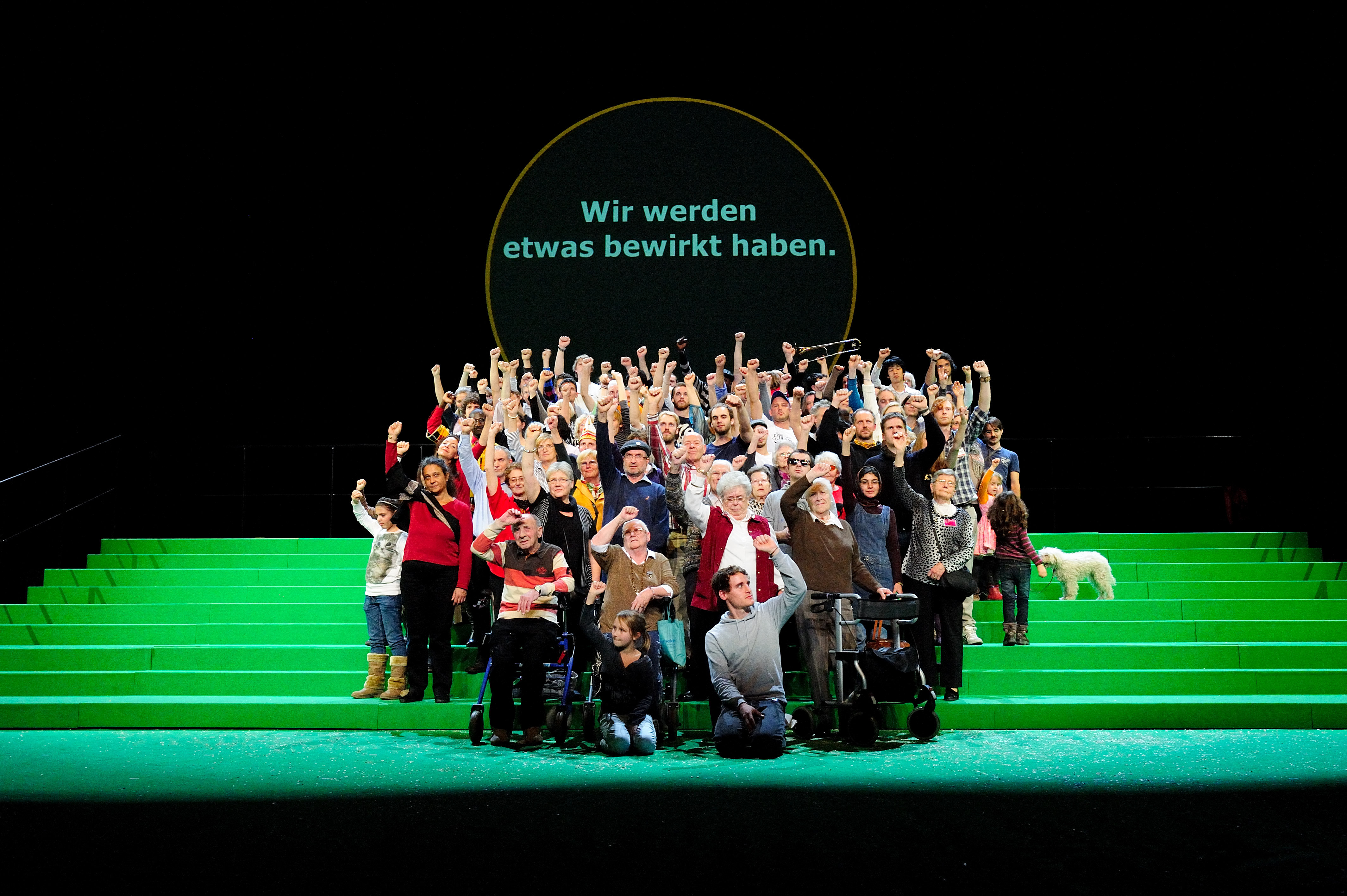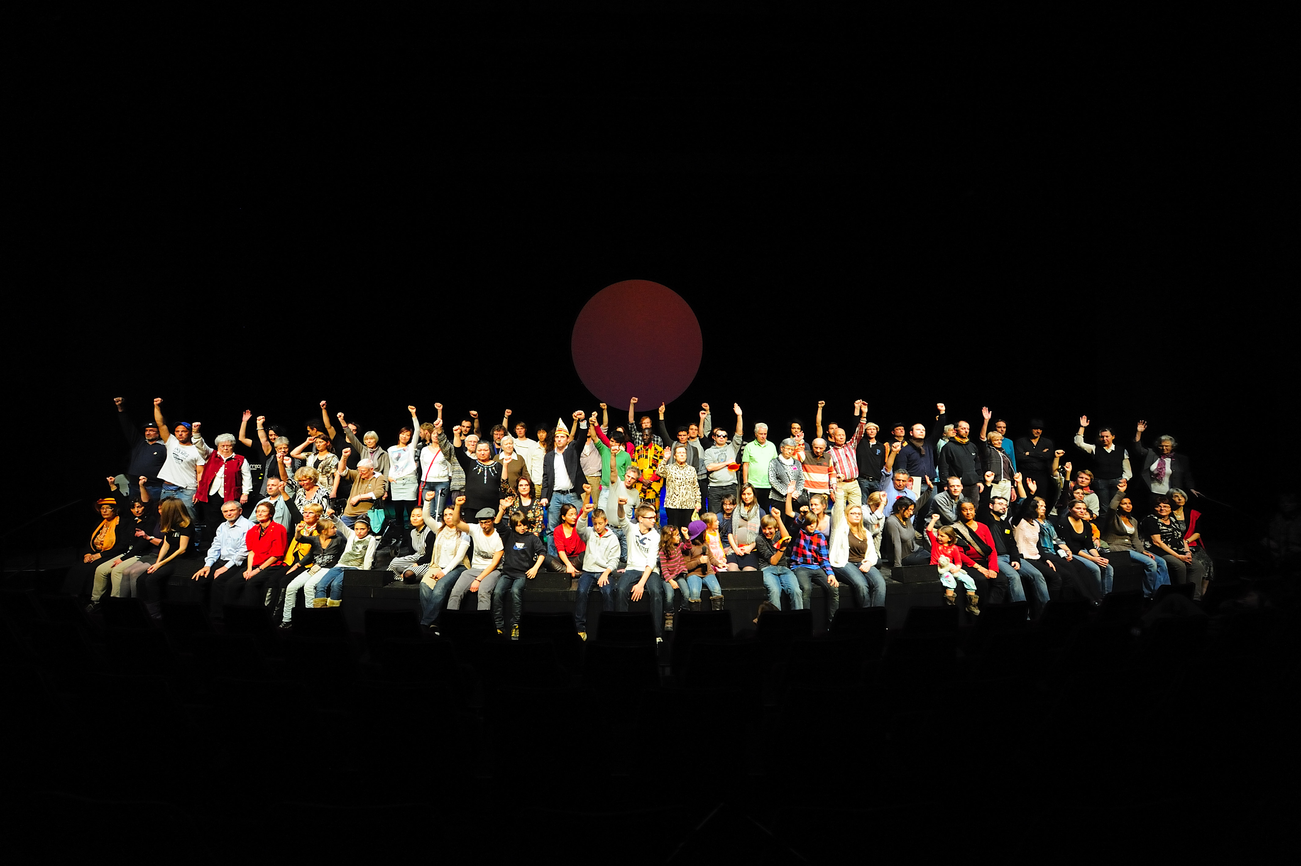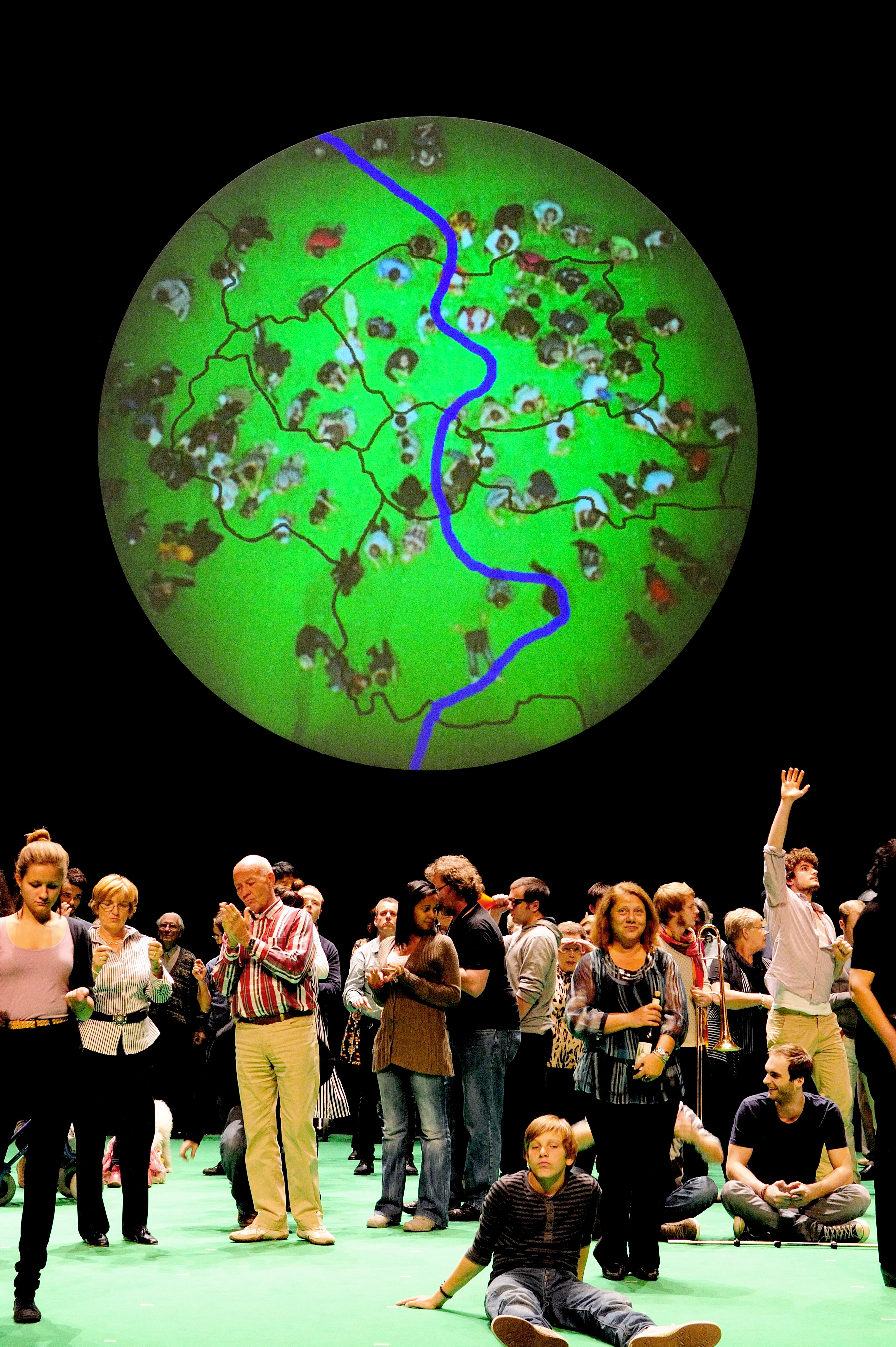 Das Amt für Stadtentwicklung und Statistik der Stadt Köln berechnete das Durchschnittsalter der 1.027.504 gezählten Kölner auf 41,8 Jahre, der Kommunale Mikrozensus ergab, dass 26 % der Kölner gelegentlich ins Theater gehen, 48 % in die Kneipe und 4 % gelegentlich Ausstellungen besuchen. Für Statistiken geraten Menschen in Tortenstücke, Säulen und Kurven, die für politische Argumentationen und ökonomische Kosten-Nutzen-Strategien verwendet werden. Was ist, wenn diese Statistiken Gesichter bekommen? Wie sieht es aus, wenn Köln sich auf einer Bühne durch 100 Menschen vertreten ließe, eine Menge, so ausgesucht, dass sie statistisch „korrekte“ Aussagen machen kann? Aus „Köln in Zahlen“ werden Zahlen aus Kölnern: 2010 waren unter ihnen 51 weiblich, 39 katholisch, 5 jünger als 6 Jahre, 10 Schüler, 2 Alleinerziehende, 83 Menschen mit deutscher Staatsangehörigkeit, 8 Kölner mit türkischem Pass, 10 Kölner aus Porz, 8 aus Chorweiler und 8 älter als 75 Jahre. Eine Gruppe aus 100 Menschen, deren Zusammensetzung exakt einem Bevölkerungsmodell entspricht, das mit dem Amt für Stadtentwicklung und Statistik erarbeitet wurde. Jeder auf der Bühne steht für 10.000 Kölner. »100 Prozent Köln« zeigt einen Darsteller mit 100 Köpfen, der unsere Stadt spielt, einen Chor, der kein Lied geübt hat, ein Umfragegebilde, das sich zu immer neuen Gruppenbildern zusammen stellt, zu flüchtigen Portraits von Zugehörigkeit und Gegensätzen, ein Bevölkerungsparlament auf 100m2 Bühne. Den Aufführungen von »100 Prozent Köln« geht eine monatelange Bekanntenkreiskettenreaktion voraus: Nur einen einzigen Menschen wählen die Regisseure für die Teilnahme an der Inszenierung aus. Dieser bestimmt entsprechend den Regeln den nächsten Teilnehmer, der zweite einen weiteren, bis 100 Kölner beisammen sind, die »100 Prozent Köln« glaubhaft spielen können. Wer fehlt? Wer denkt, er antwortet anders auf der Bühne als beim Anruf eines Umfrage-Instituts oder in der Wahlkabine? Wer liest Statistiken und wer hat noch keine gefälscht? Wer glaubt, die Stadt ist eine andere, weil er da ist?