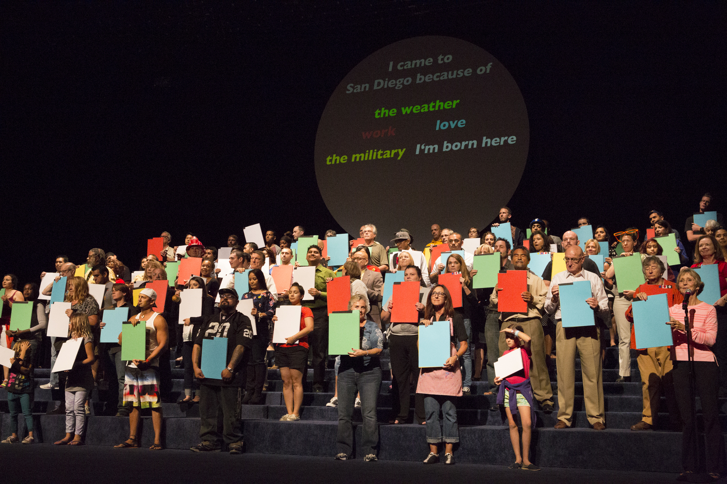 100% San Diego – a gathering that is a city, a group just beginning to experience itself, a choir that has never practiced, an impossible entity with many faces – assembled into ever-changing new group pictures: group pictures as replacement for family – as fleeting portraits of belonging. Who is missing? Who thinks they might give answers on stage that are different from the ones they’d give in response to a telephone survey or in the voting booth? And what have the statistics failed to record? Who lives in a completely different San Diego? Who thinks that this city is different because they are a part of it?