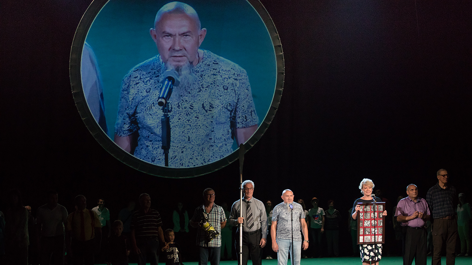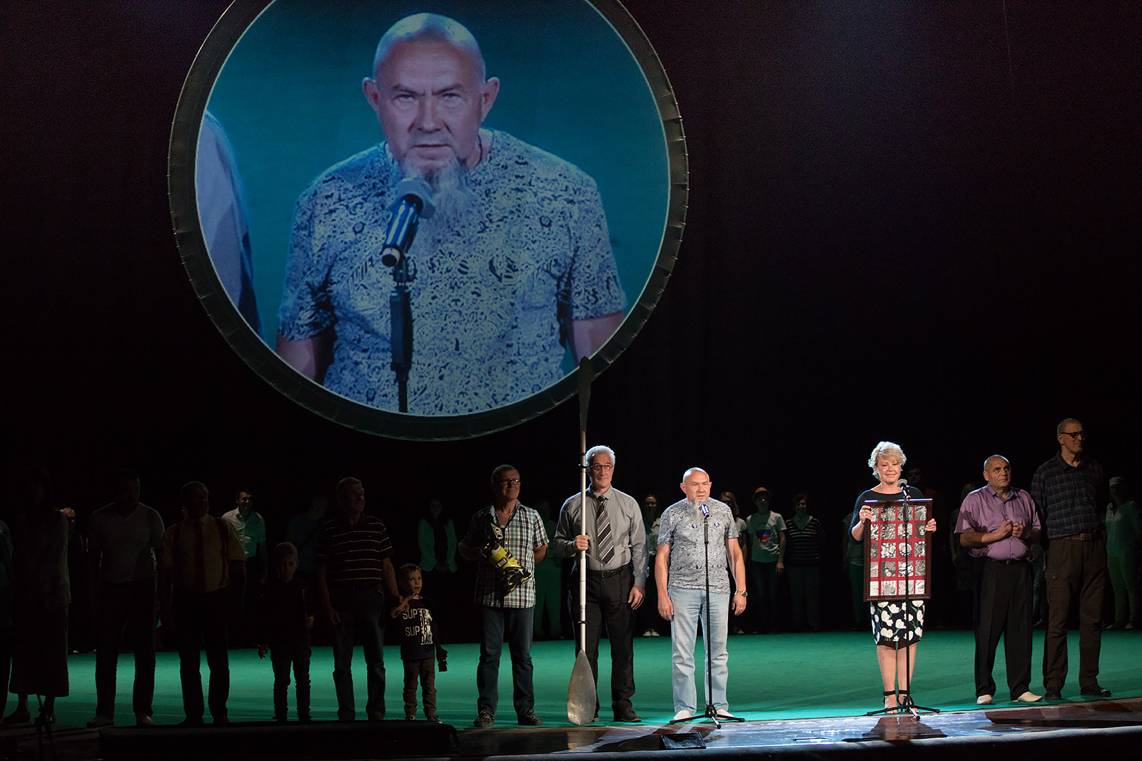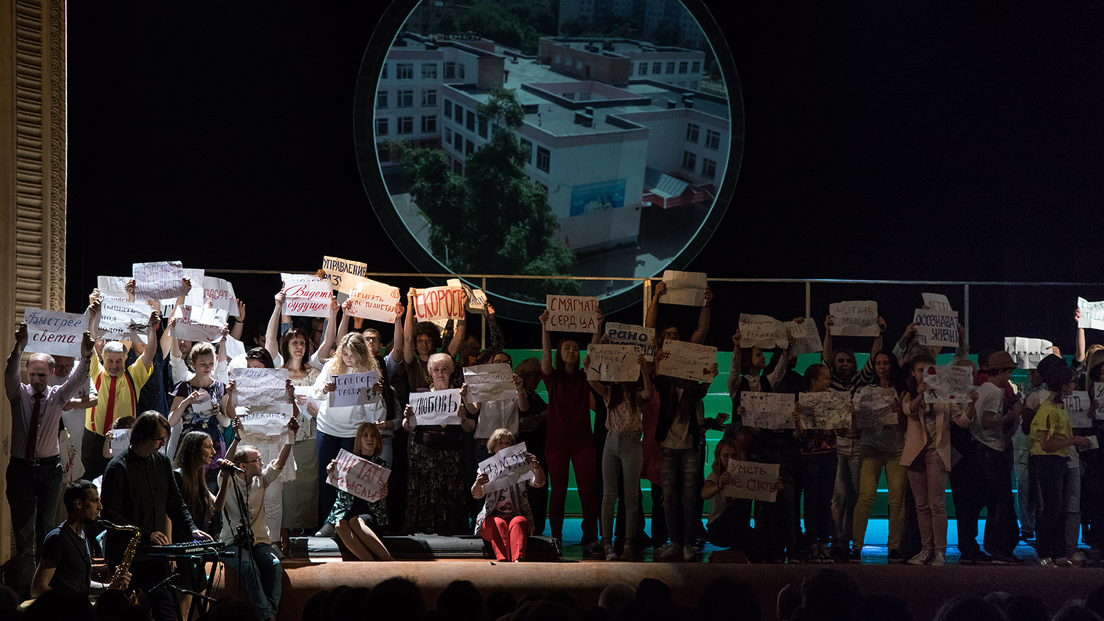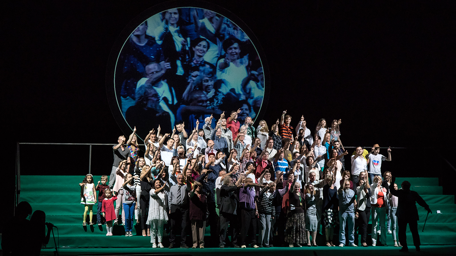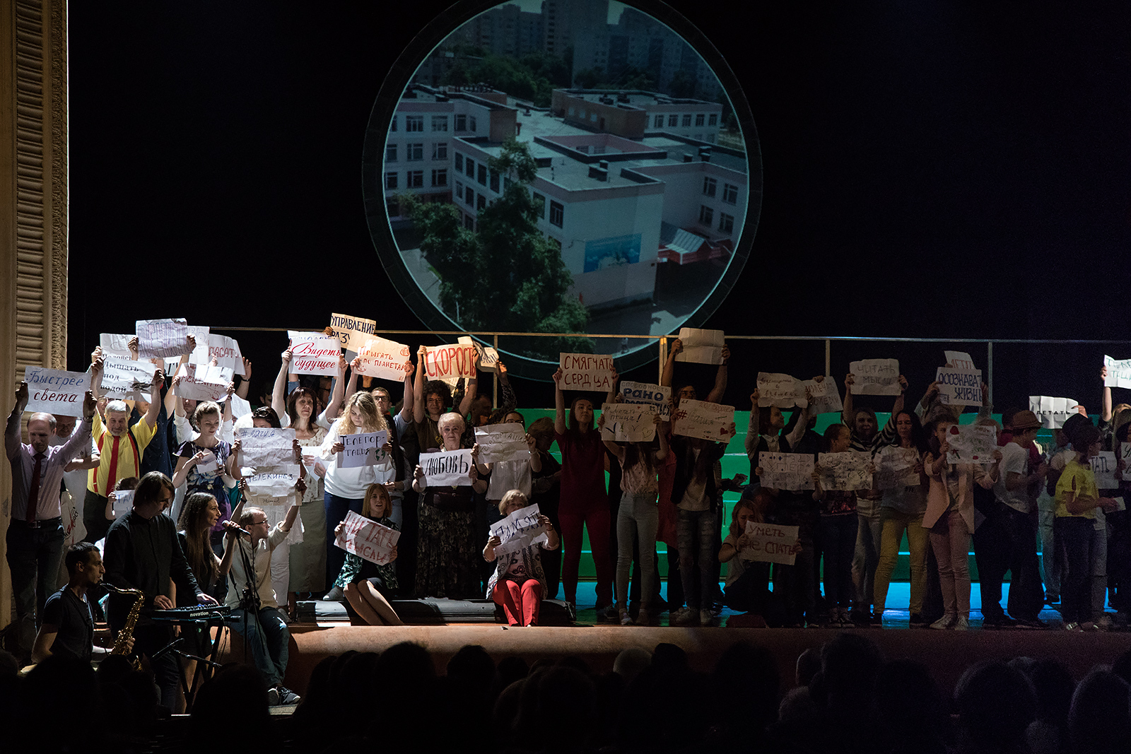 100% Voronezh ist eine Ansammlung, die eine Stadt ist, eine Gruppe, die sich erst wahrzunehmen beginnt, ein Chor, der noch nie geübt hat, ein unmögliches Gebilde mit vielen Gesichtern auf 100 Quadratmetern Bühne...