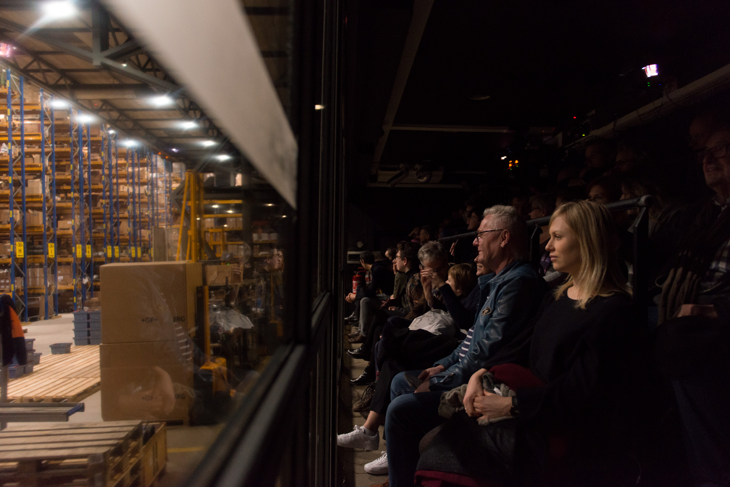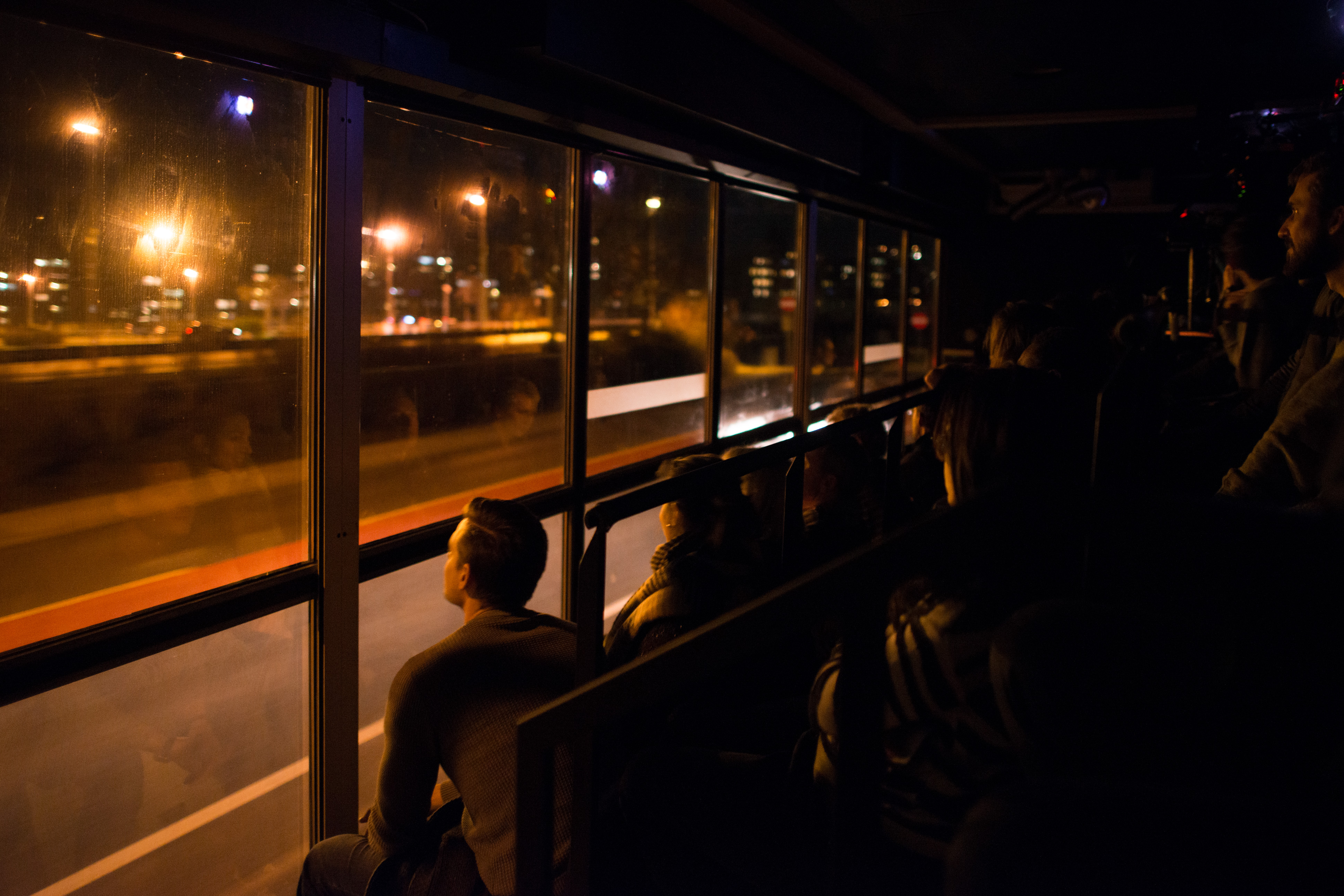 Afrikanische Rhythmen und Filmmusik vertonen die vorbeiziehende Stadt Kurve für Kurve. Wo Ware war, sitzen Zuschauer*innen und blicken durch die Scheibe zurück auf ihre Stadt, die immer weiter weg zu liegen scheint.