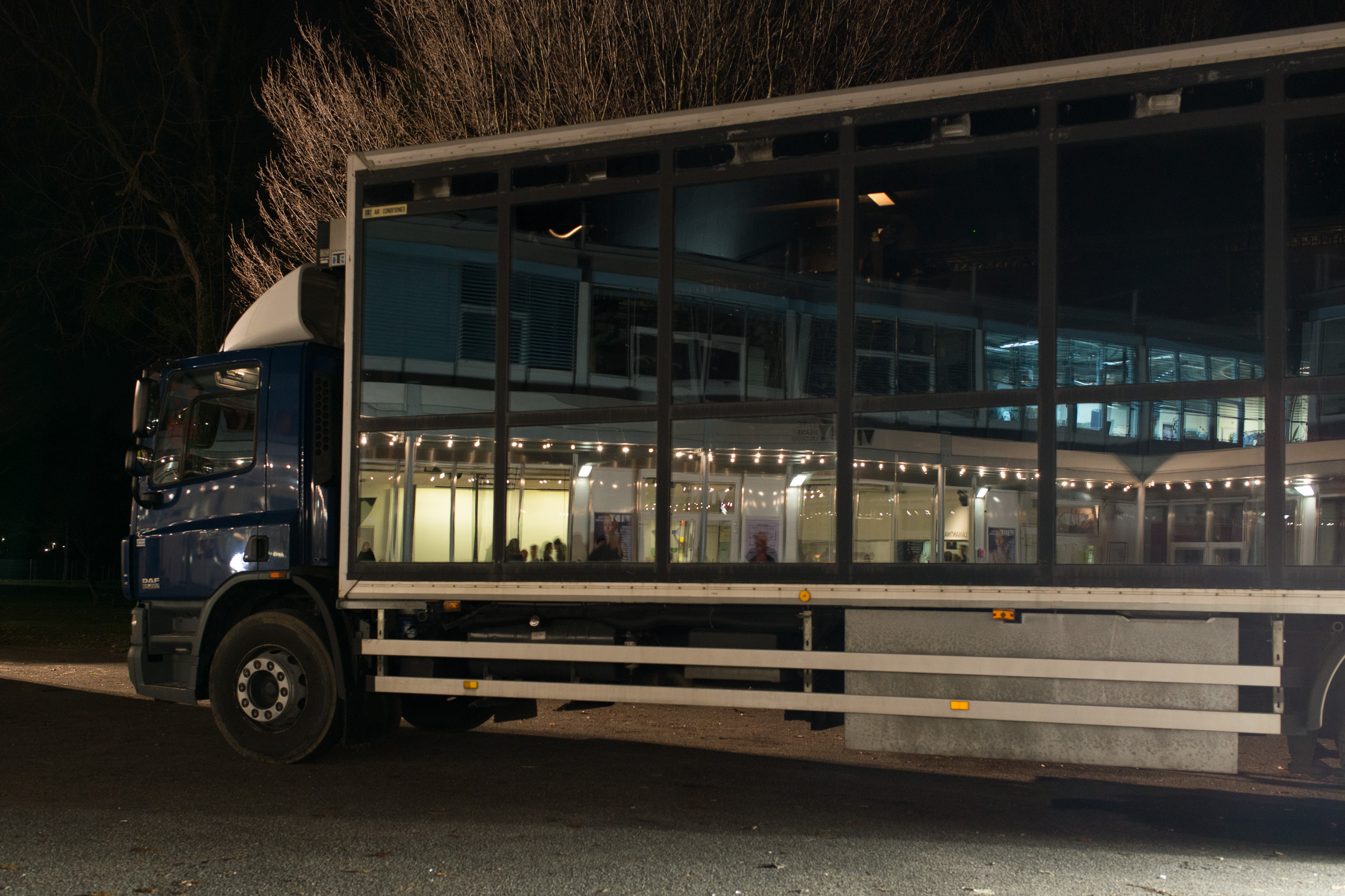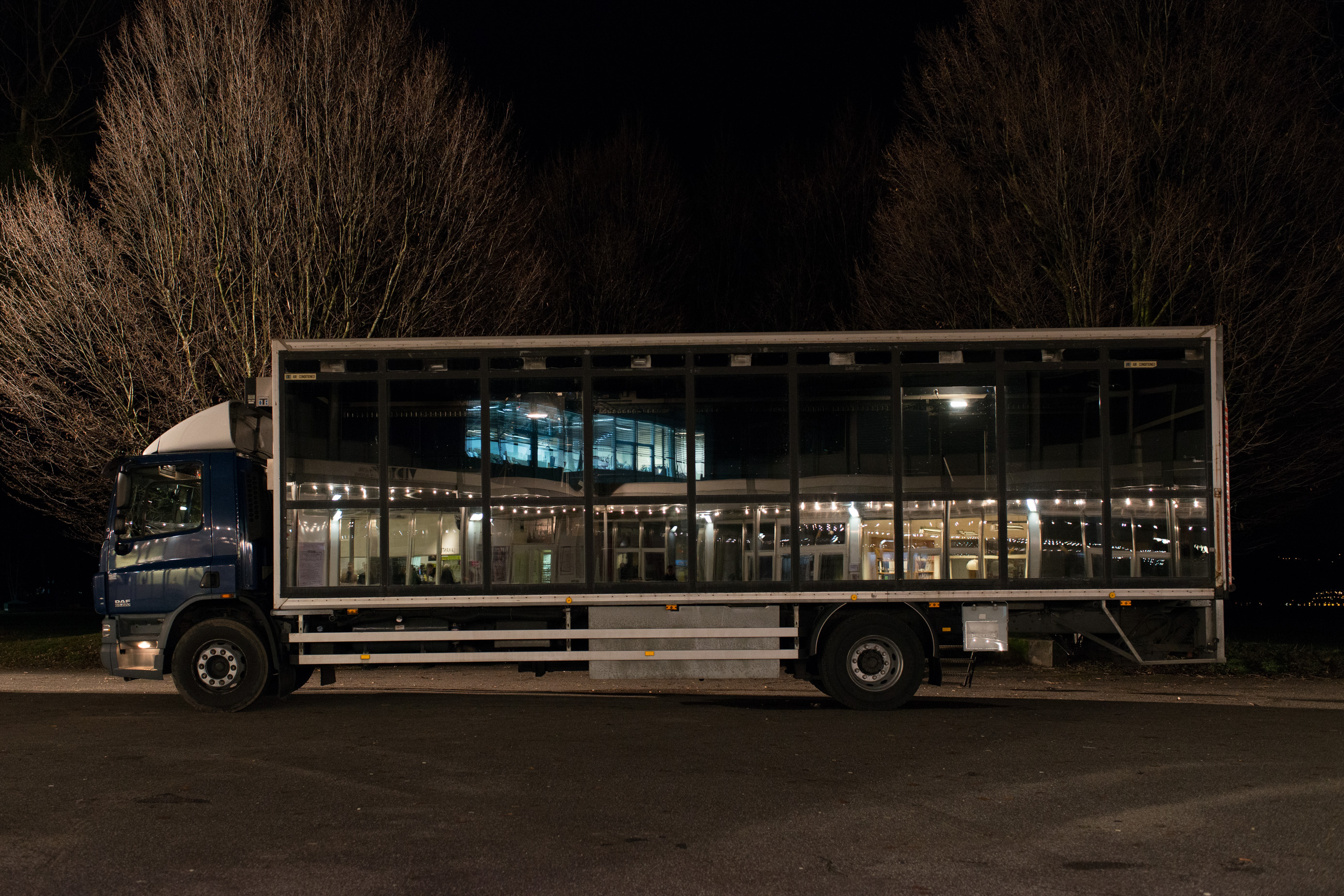 „Cargo Congo-Lausanne“ ist ein gelebtes räumliches Modell, ein umgebauter Lastwagen, der statt Waren Erzählungen transportiert. Auf der linken Seite ist er durchsichtig: Ein mobiler Zuschauerraum, der den Blick auf West-Lausanne freigibt.