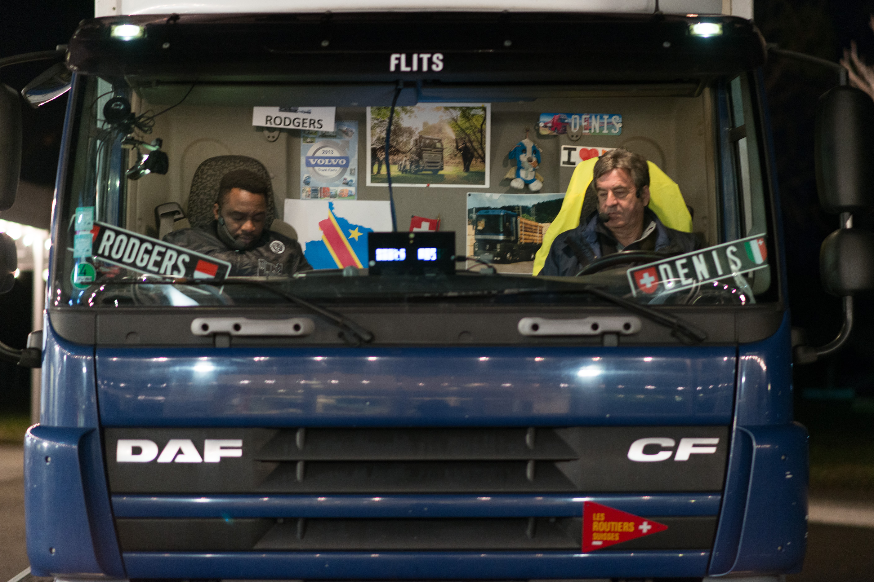 Unterwegs begegnen die beiden Trucker westschweizer Spediteuren und portugiesischen Kranfahrern: Sie arbeiten in flutbelichteten Hallen in der kalten Winternacht, während andere ins Theater gehen.