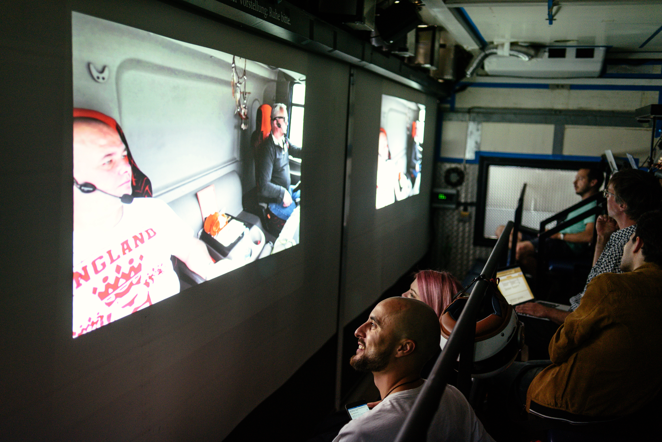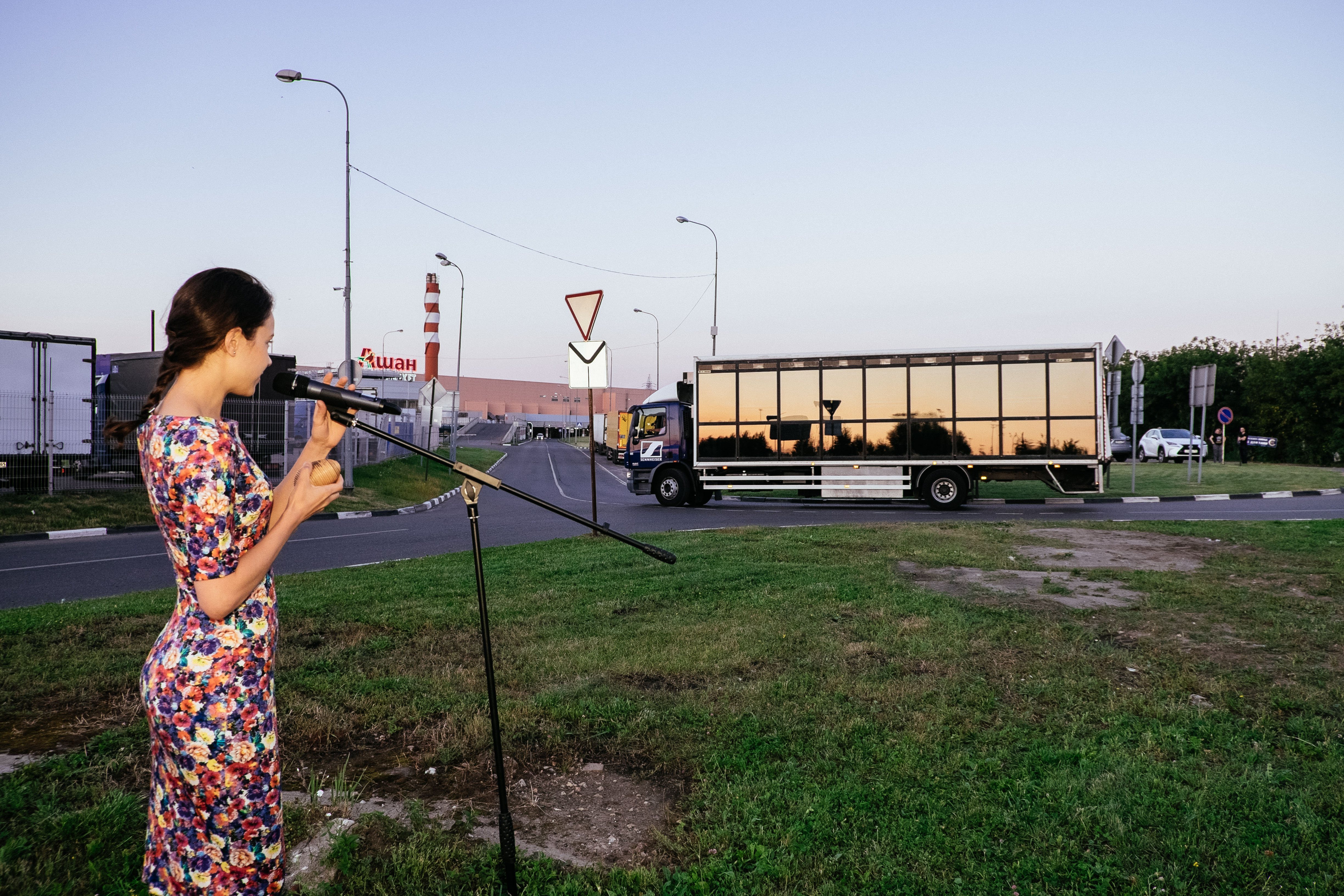 The truck has been converted into a mobile audience space for 50 people. Where goods used to be stacked in the past, now the audience is sitting and looking through a 10m long window at the city and the landscapes passing by. Cargo Moscow is a site-specific performance along the highway-ring of Moscow that turns gaz-stations, industrial loading ramps, container ports and surprisingly appearing landscapes into a road movie through the reality of a globalised economy.
