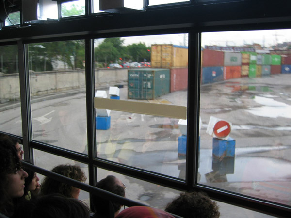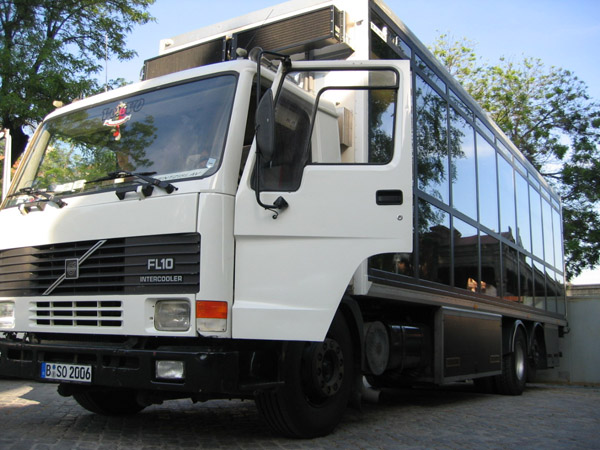 Abends ist der LKW mobiler Zuschauerraum mit einem Schau-Fenster auf einer Seite des Trucks. Wo Ware war, sitzt nun das Publikum und blickt verfremdet zurück auf die Stadt. So dient der Lastwagen als Beobachtungsstation, Theatersonde, mobiler Guckkasten, der sich auf Städte richtet wie ein Mikroskop.