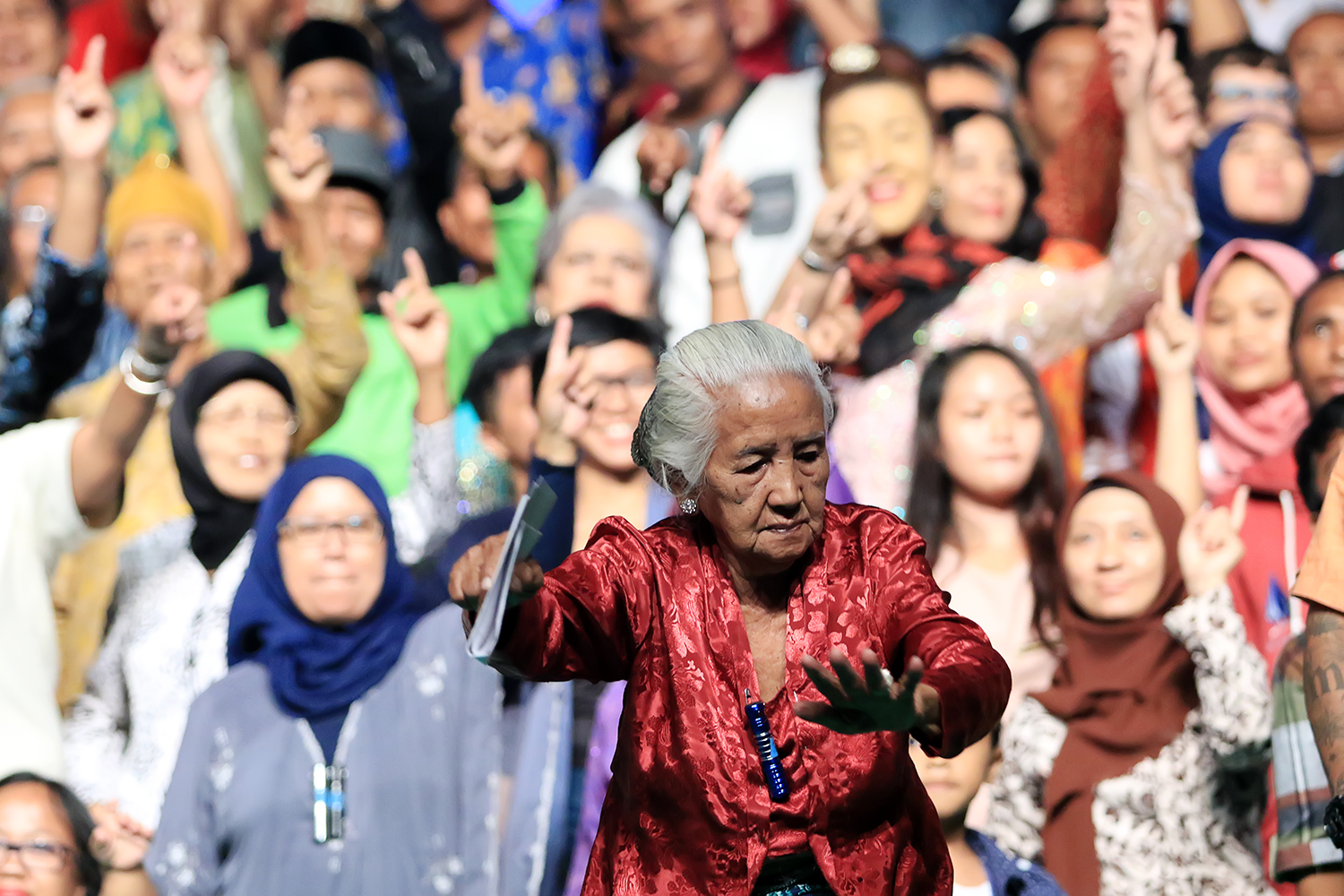 100% City is a large-scale, immersive video installation that vibrantly tackles issues of statistics, challenging traditional spatial, cultural, and political divides that inform how populations of people are represented and understood. The videos feature documentation from different performances that have happened around the globe, in which 100 everyday citizens of a particular city perform alternative demographies on stage, telling their stories and expressing their views on a broad range of topics, including aging, warfare, migration, and relationships. Each performance presents, as Rimini Protokoll describes, “a gathering that is a city, a group just beginning to experience itself, a choir that has never practiced, an impossible entity with many faces, assembled into ever-changing new group pictures...Who is missing? Who thinks they might give answers on stage that are different from the ones they’d give in response to a telephone survey or in the voting booth?