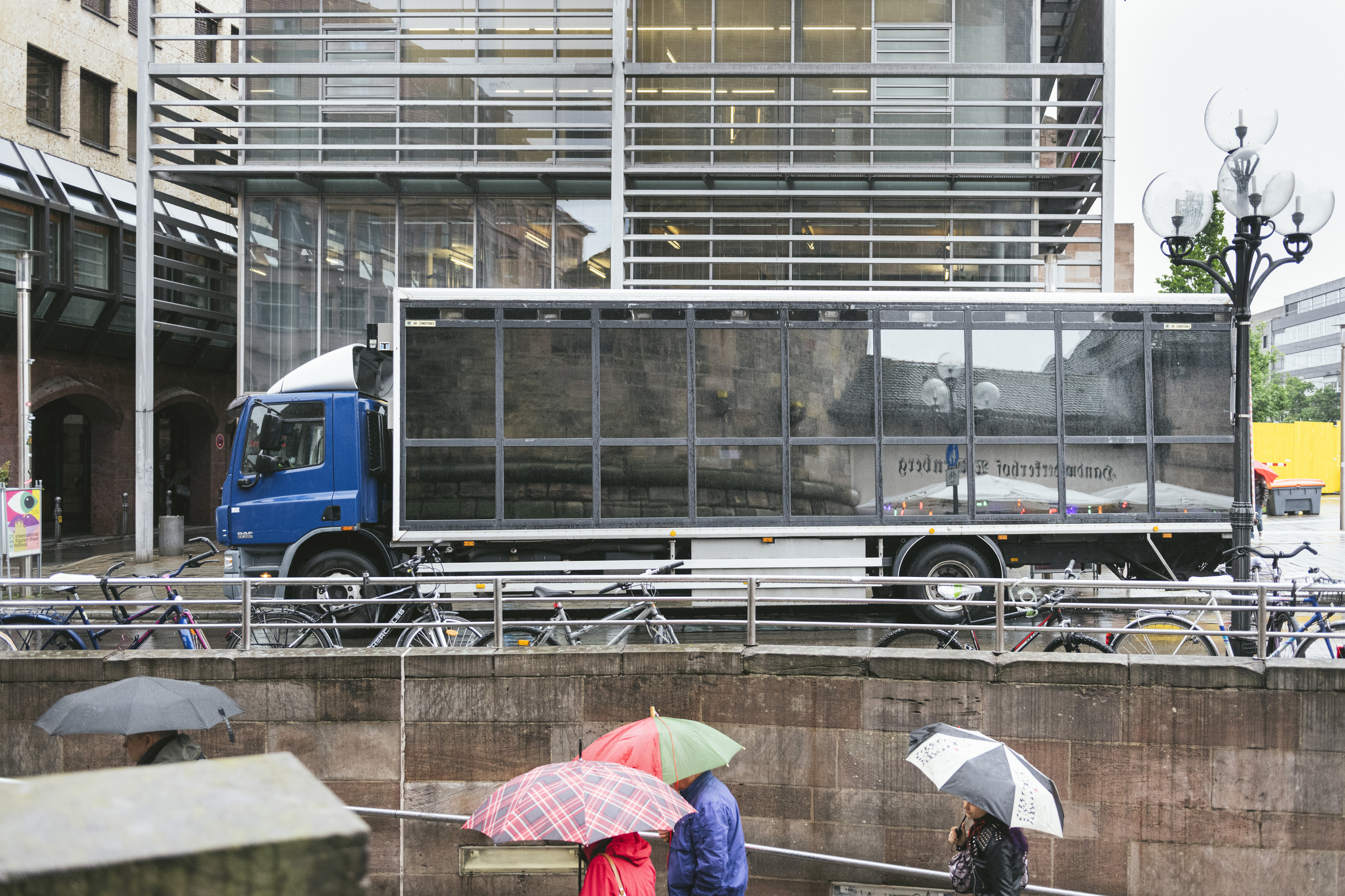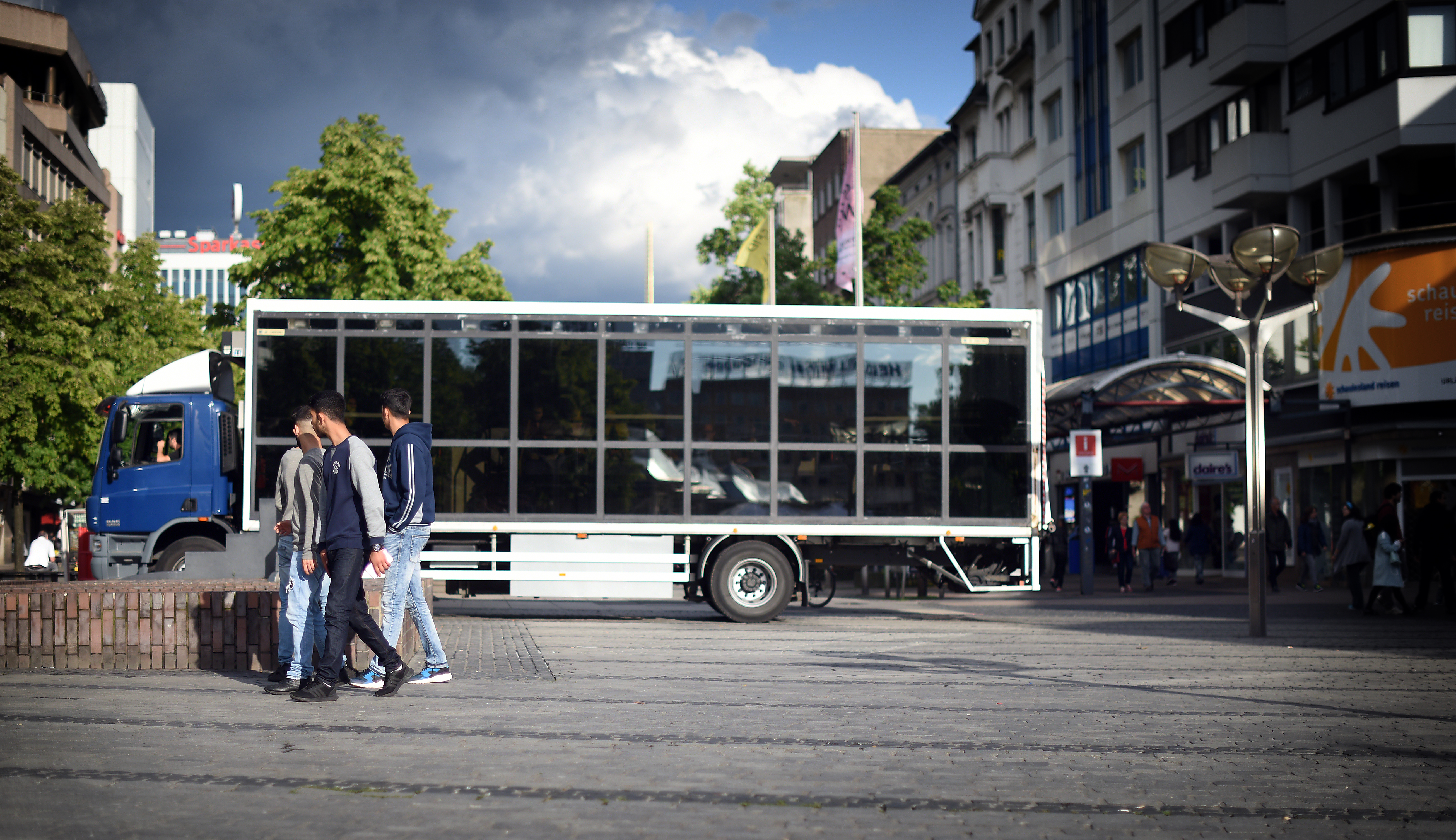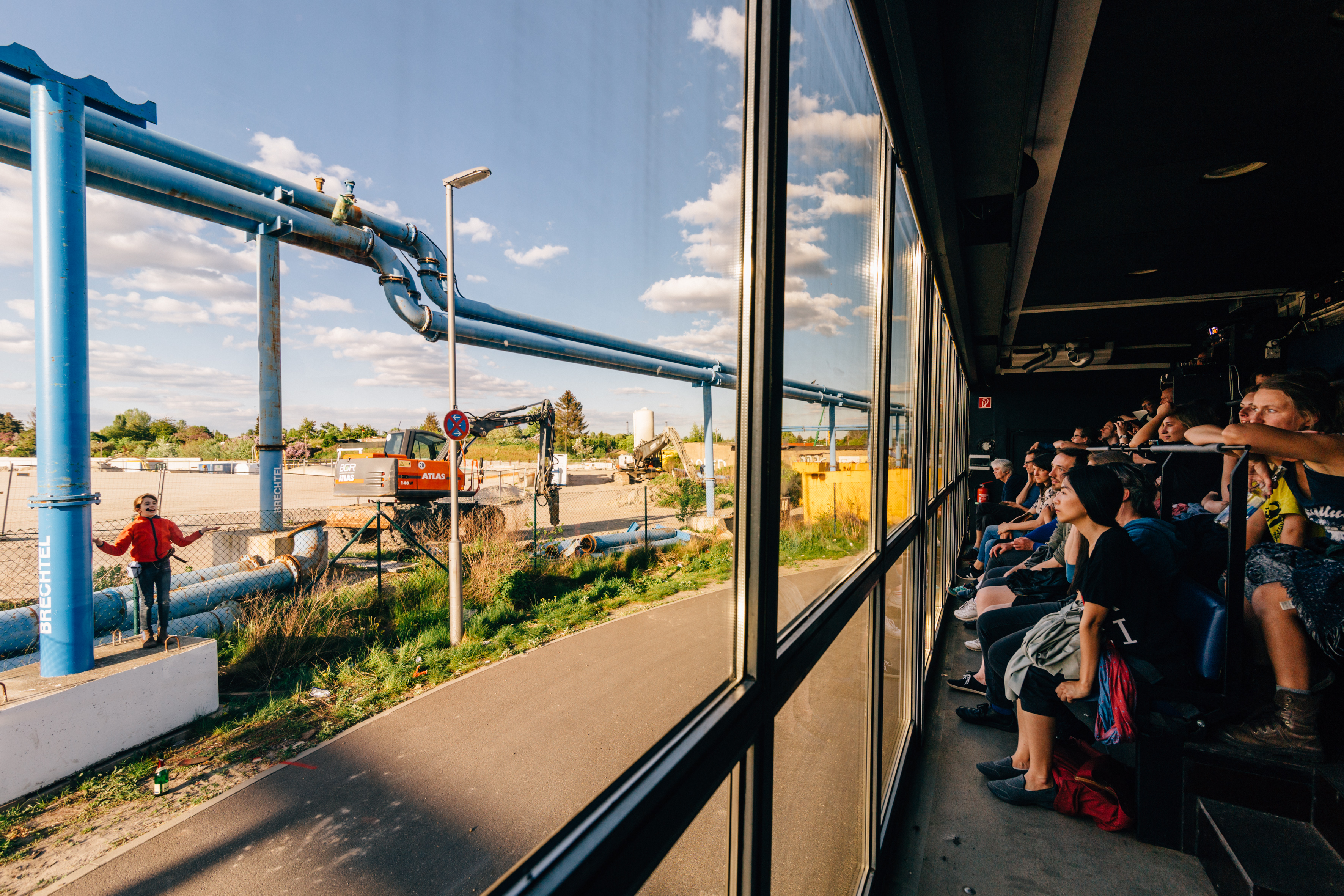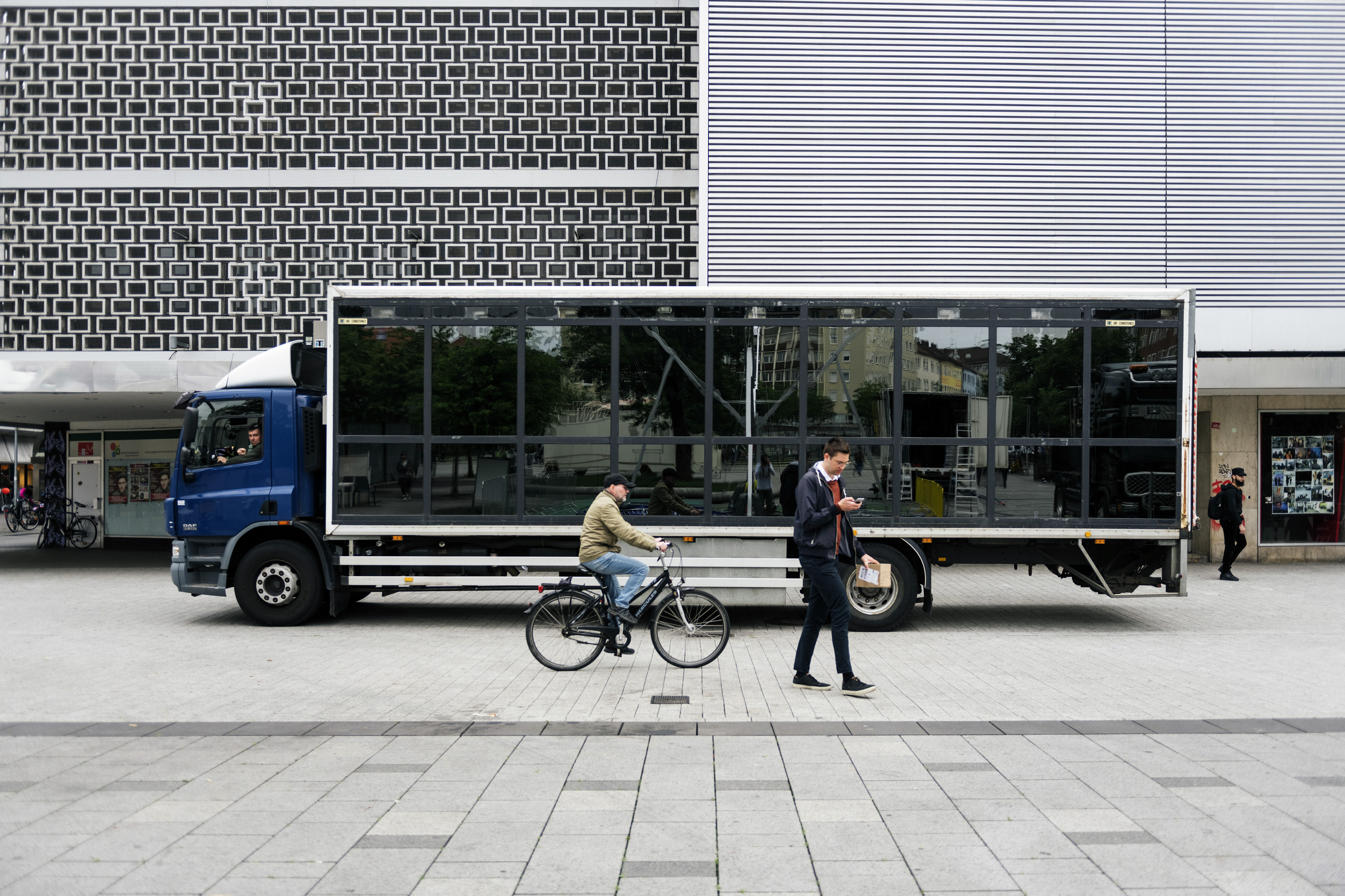 Die Zuschauer*innen dieses Stücks sitzen in einem LKW, der zu einem mobilen Zuschauerraum umgebaut wurde. Durch ein großes Fenster schauen sie hinaus auf die Stadt.