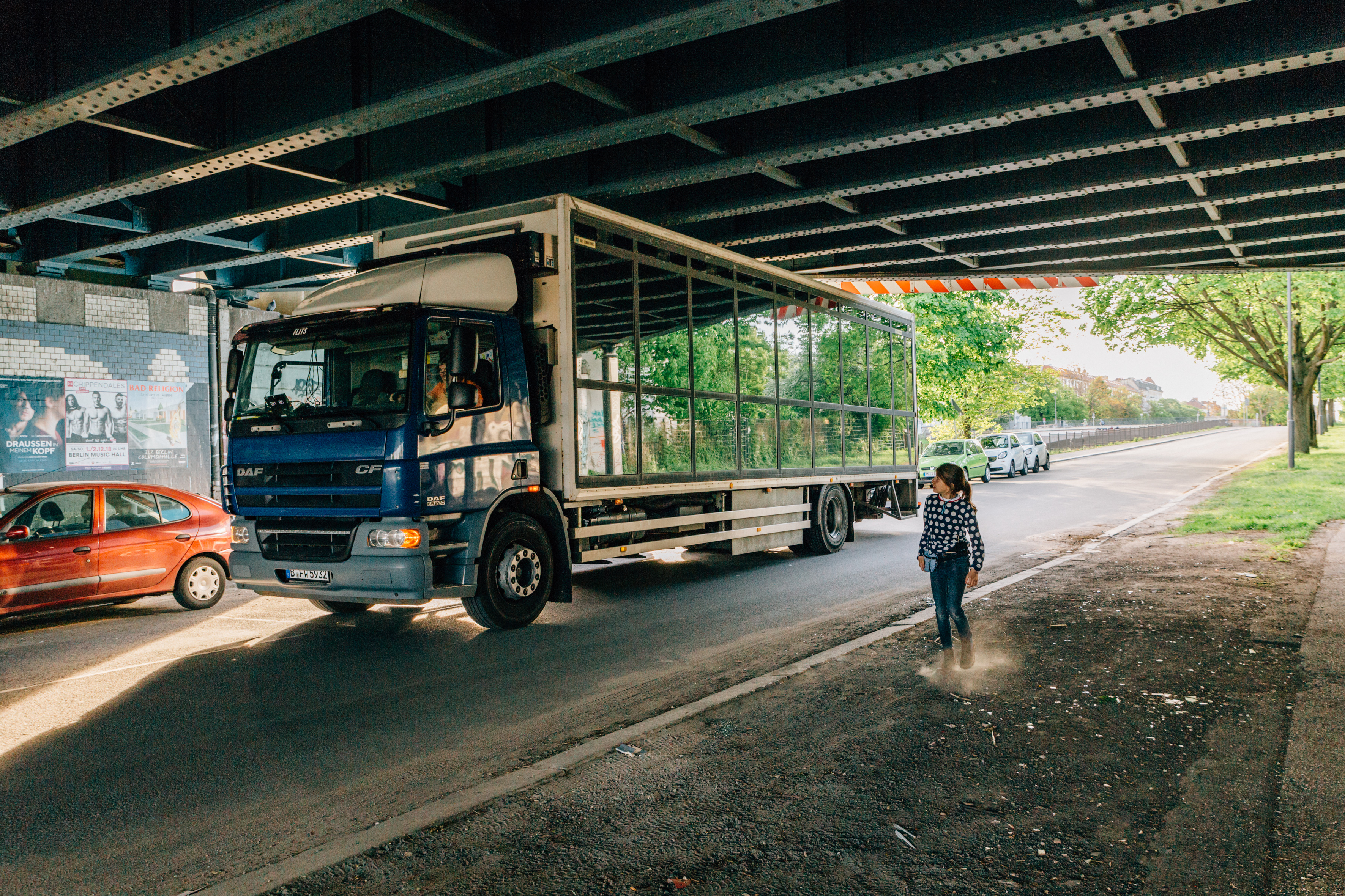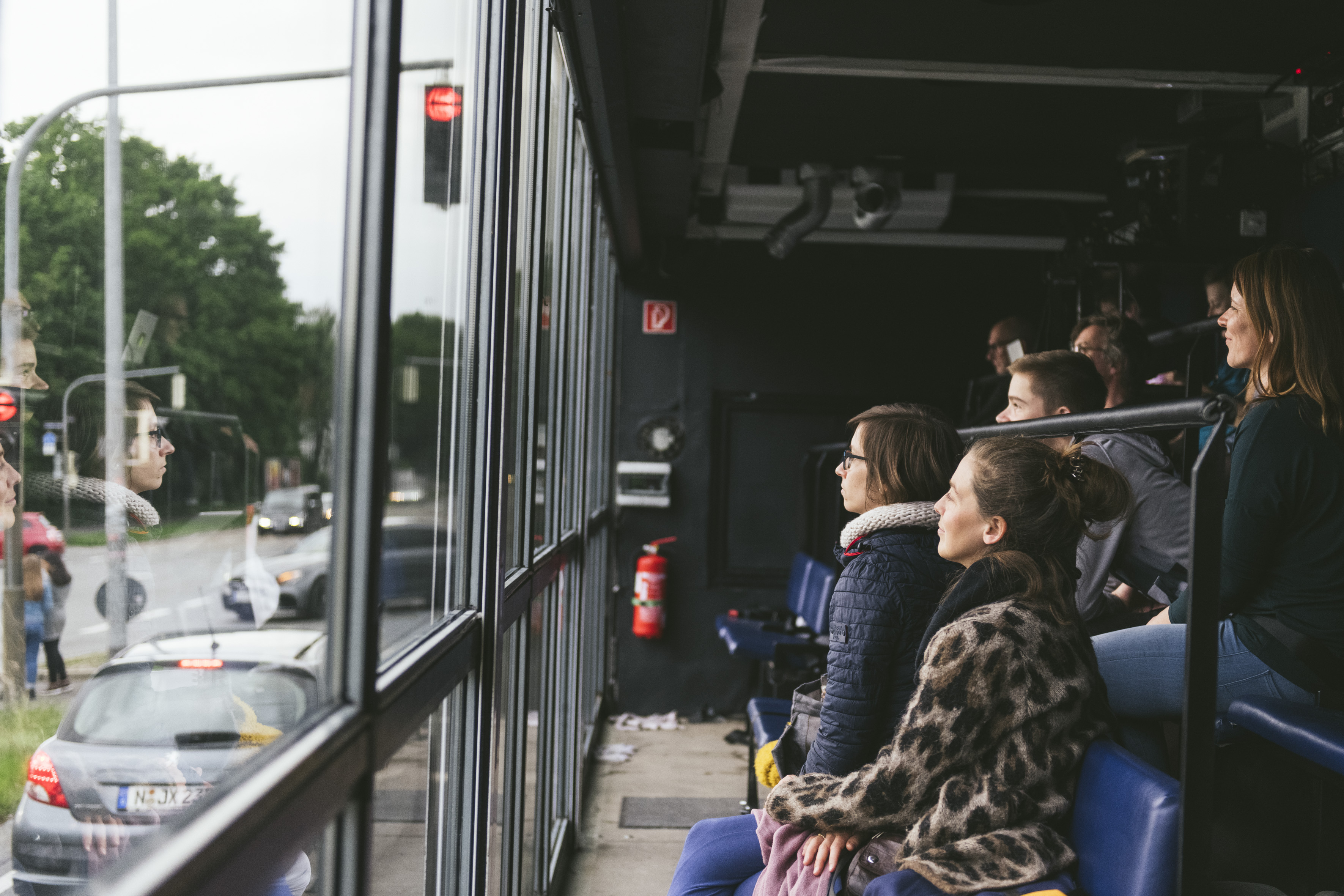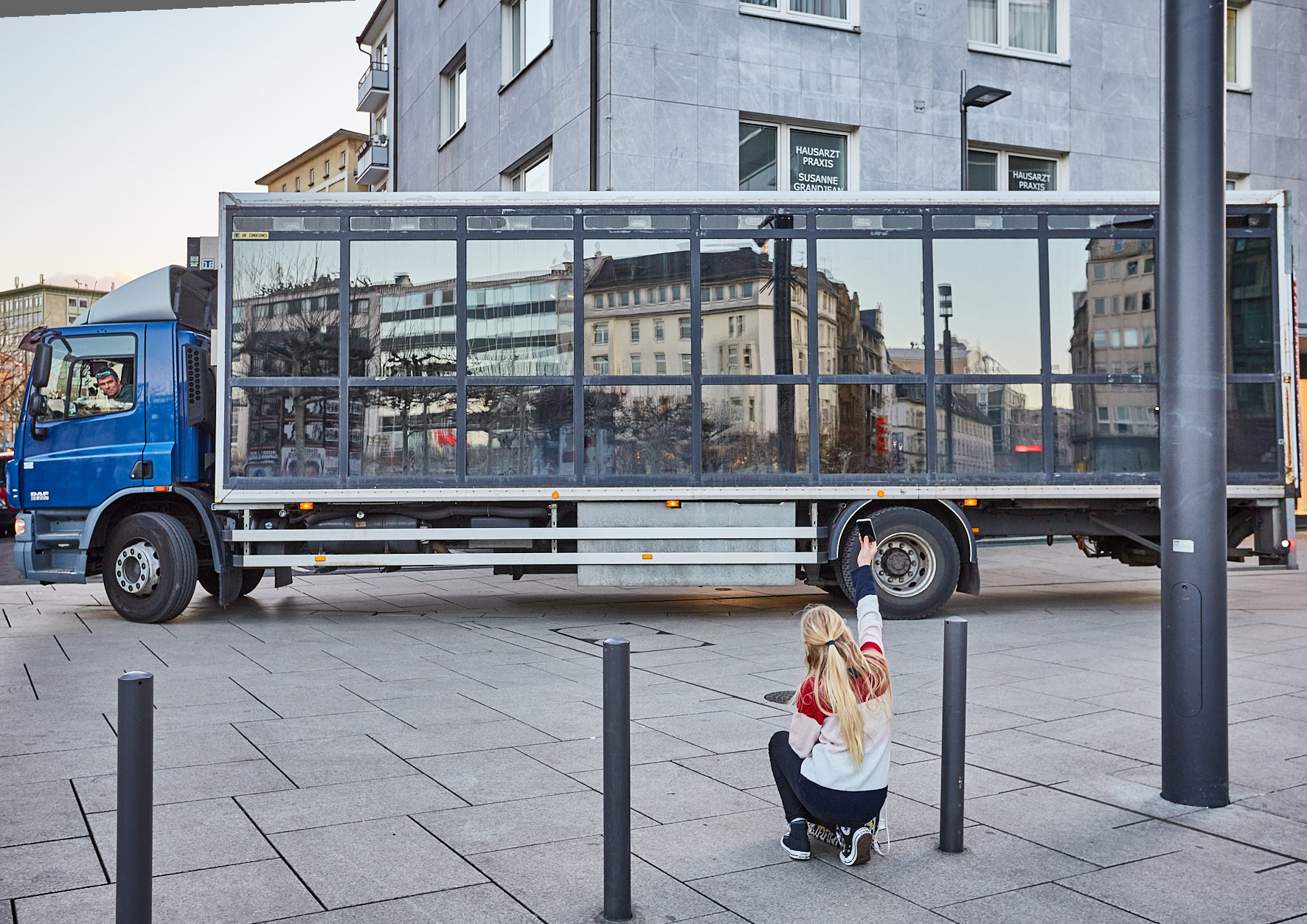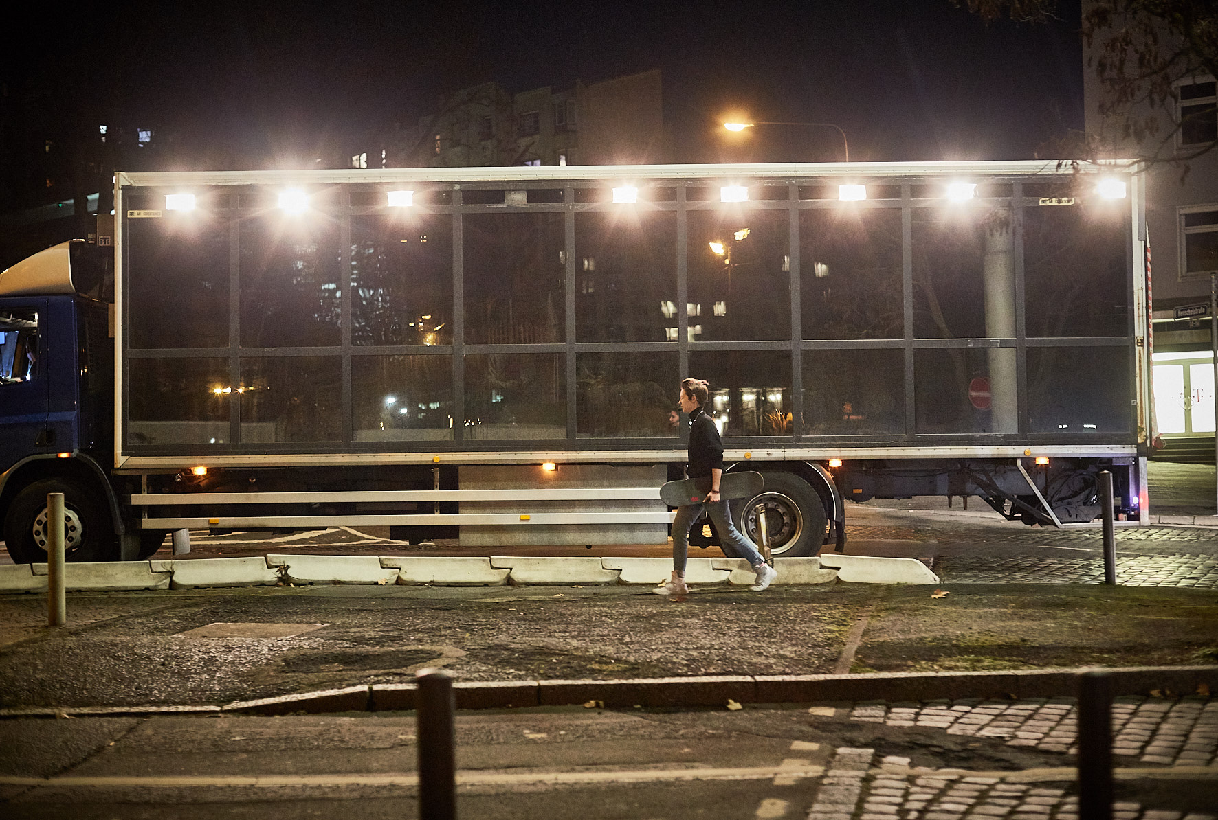Die Zuschauer*innen dieses Stücks sitzen in einem LKW, der zu einem mobilen Zuschauerraum umgebaut wurde. Durch ein großes Fenster schauen sie hinaus auf die Stadt.