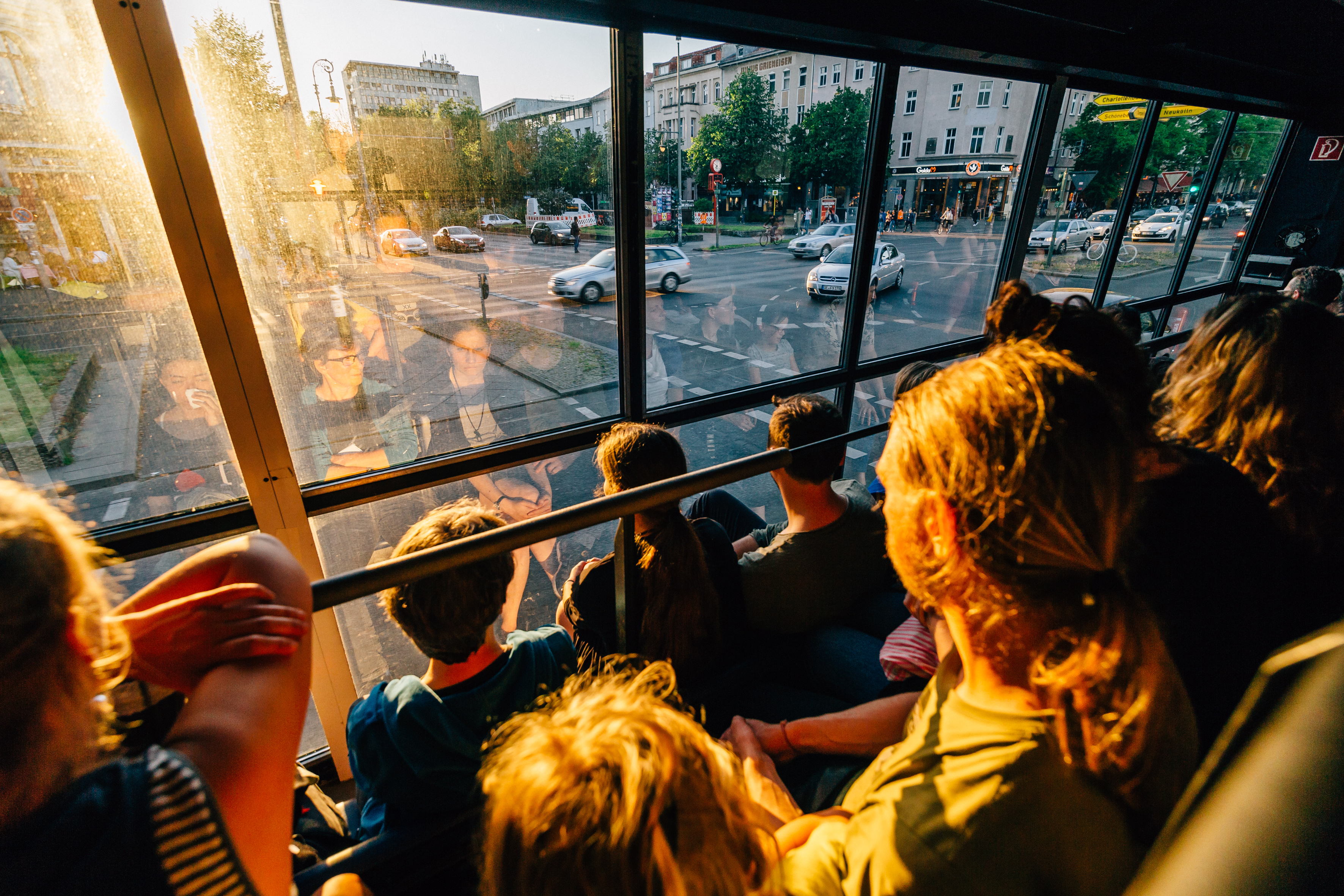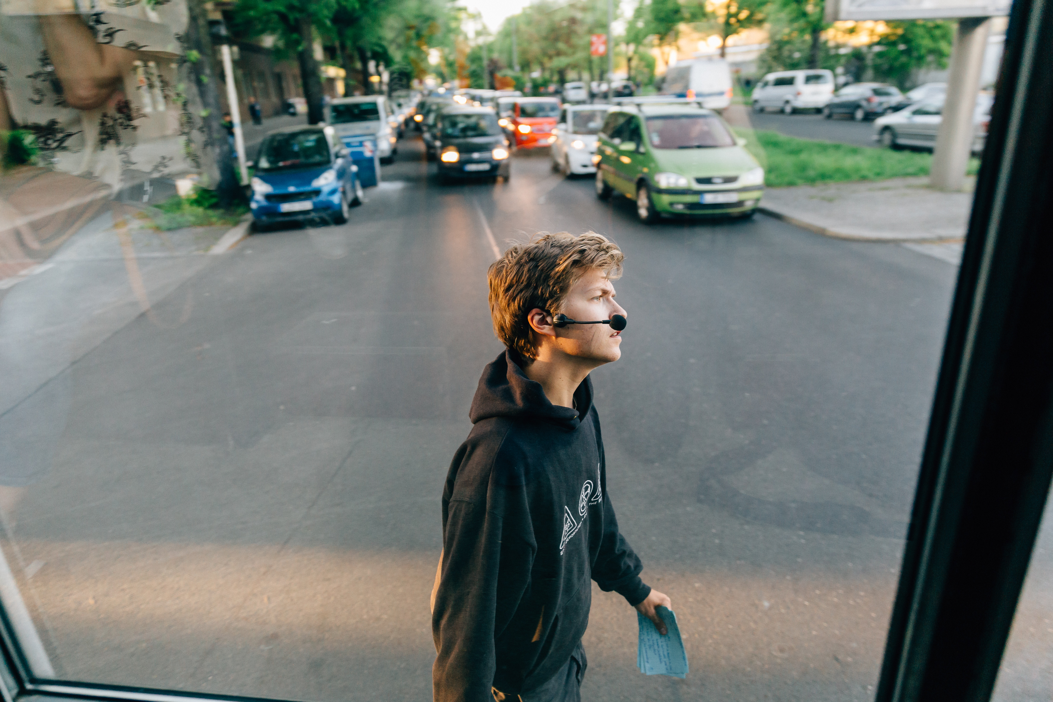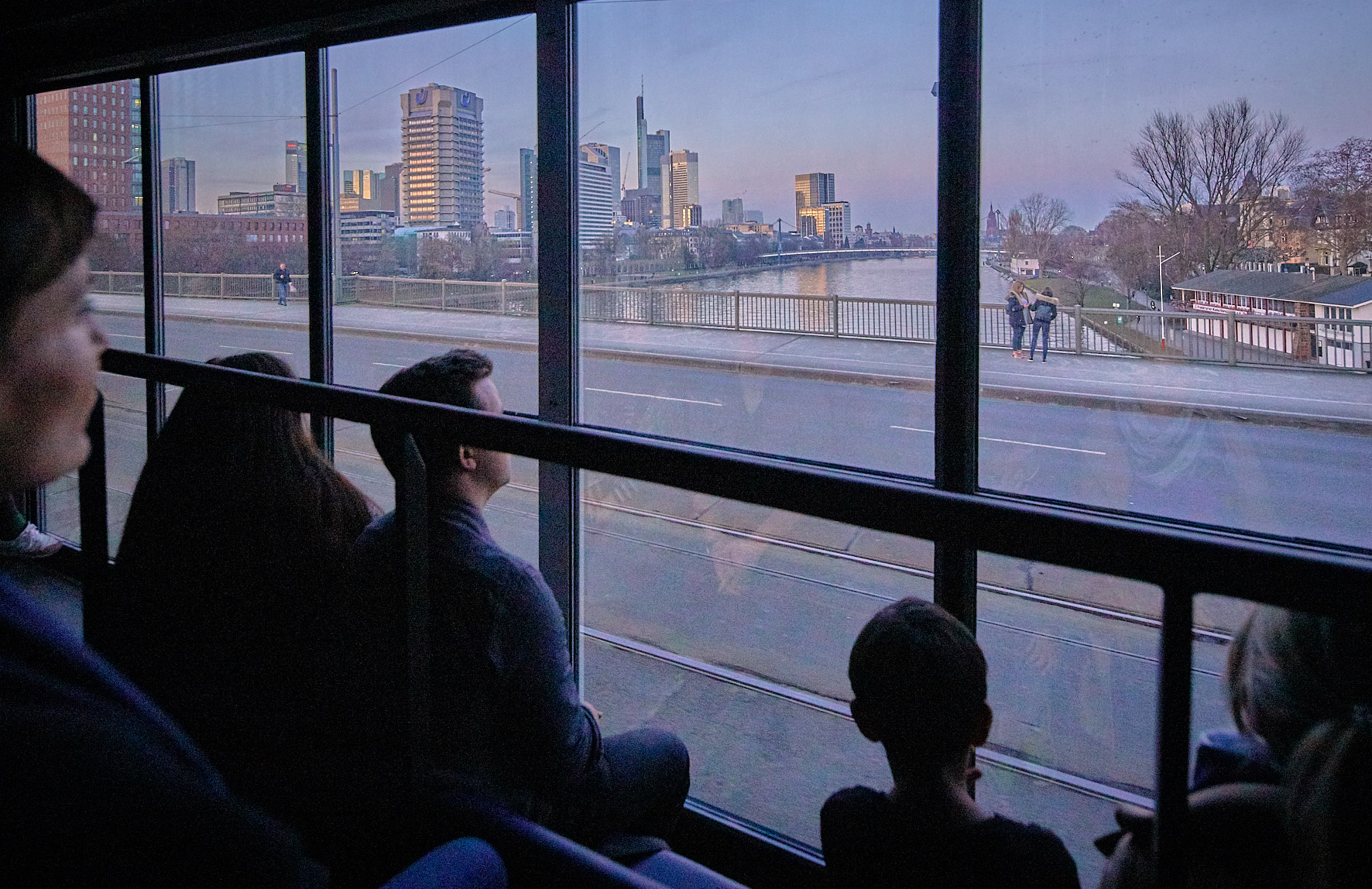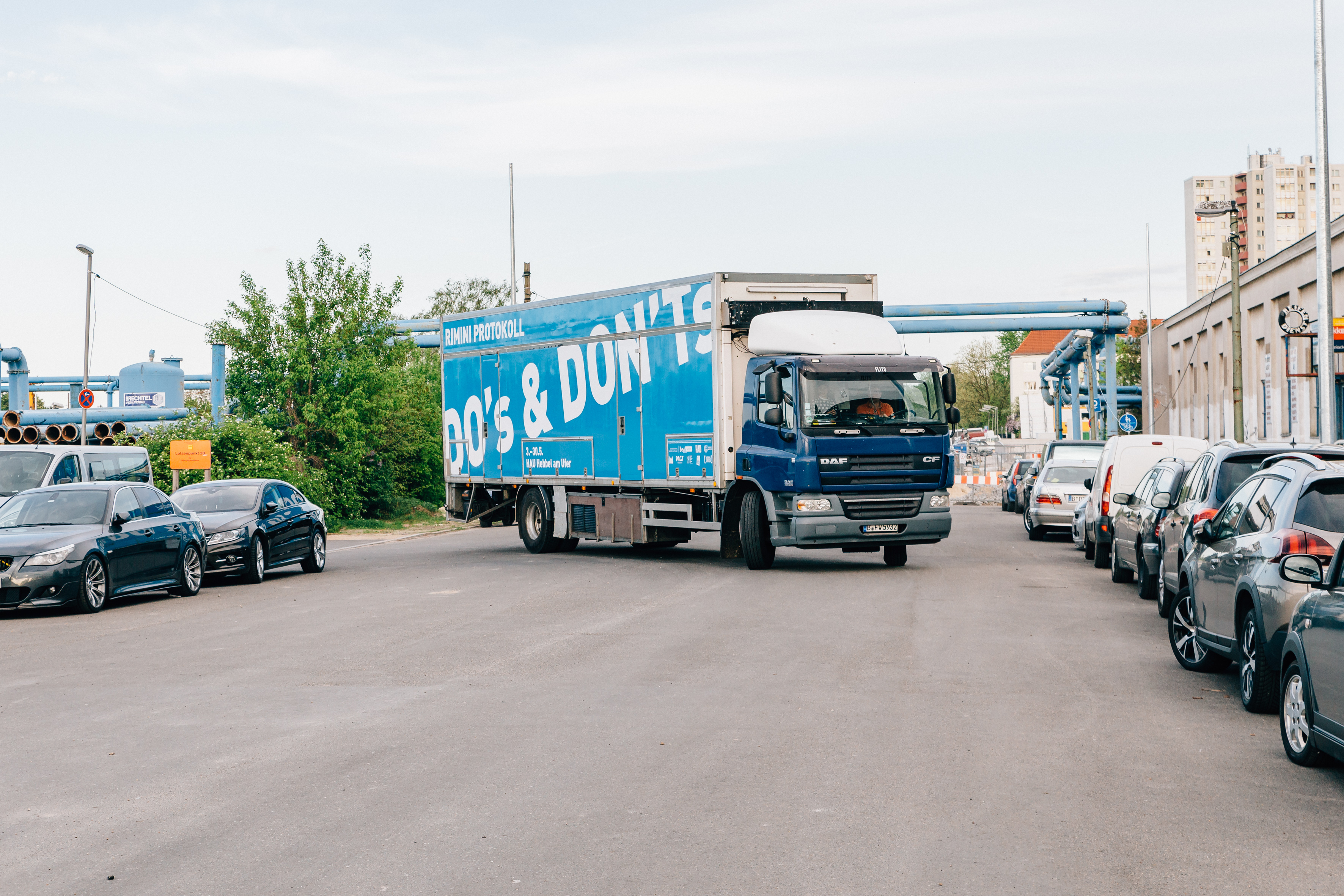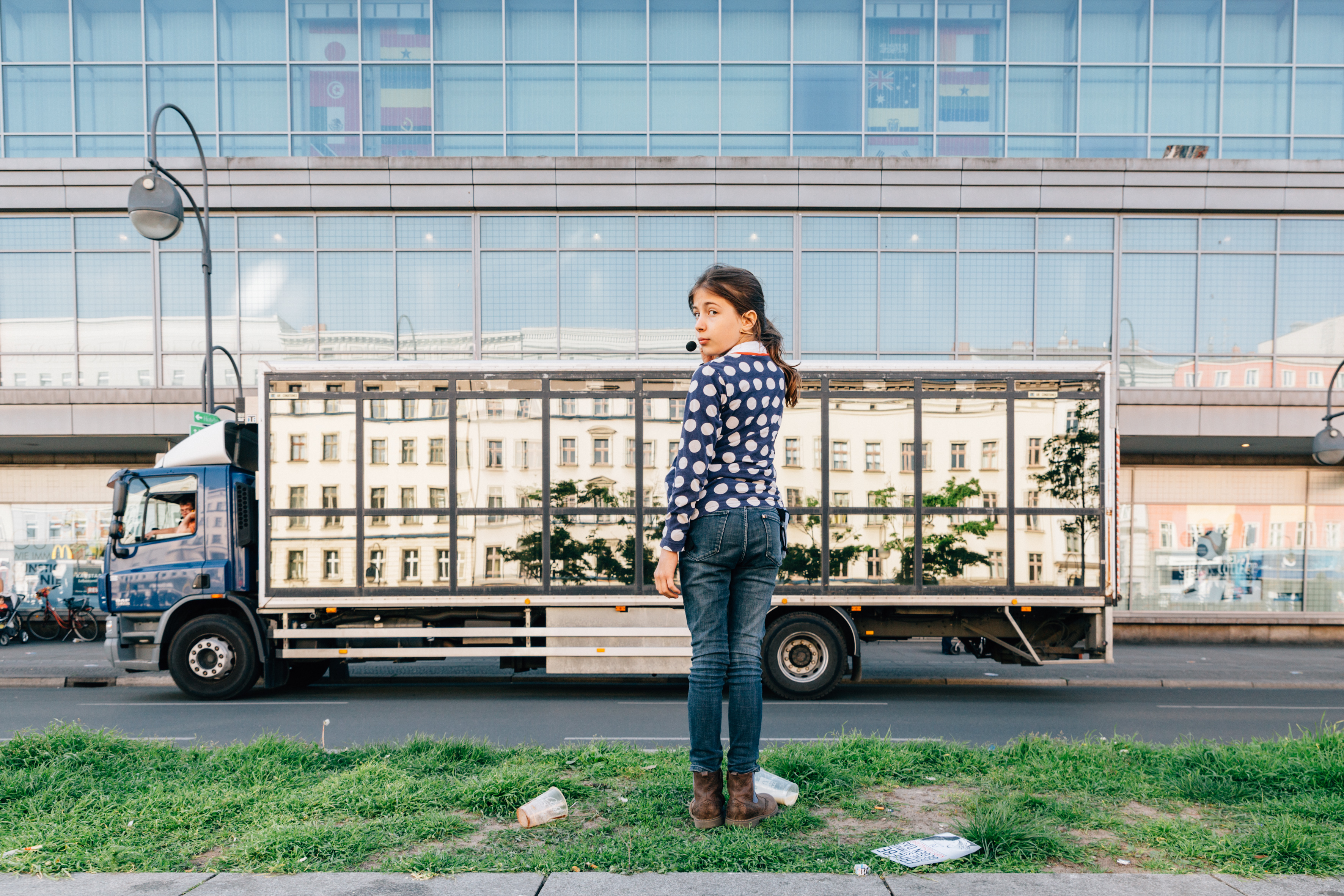 Die Zuschauer*innen dieses Stücks sitzen in einem LKW, der zu einem mobilen Zuschauerraum umgebaut wurde. Durch ein großes Fenster schauen sie hinaus auf die Stadt.