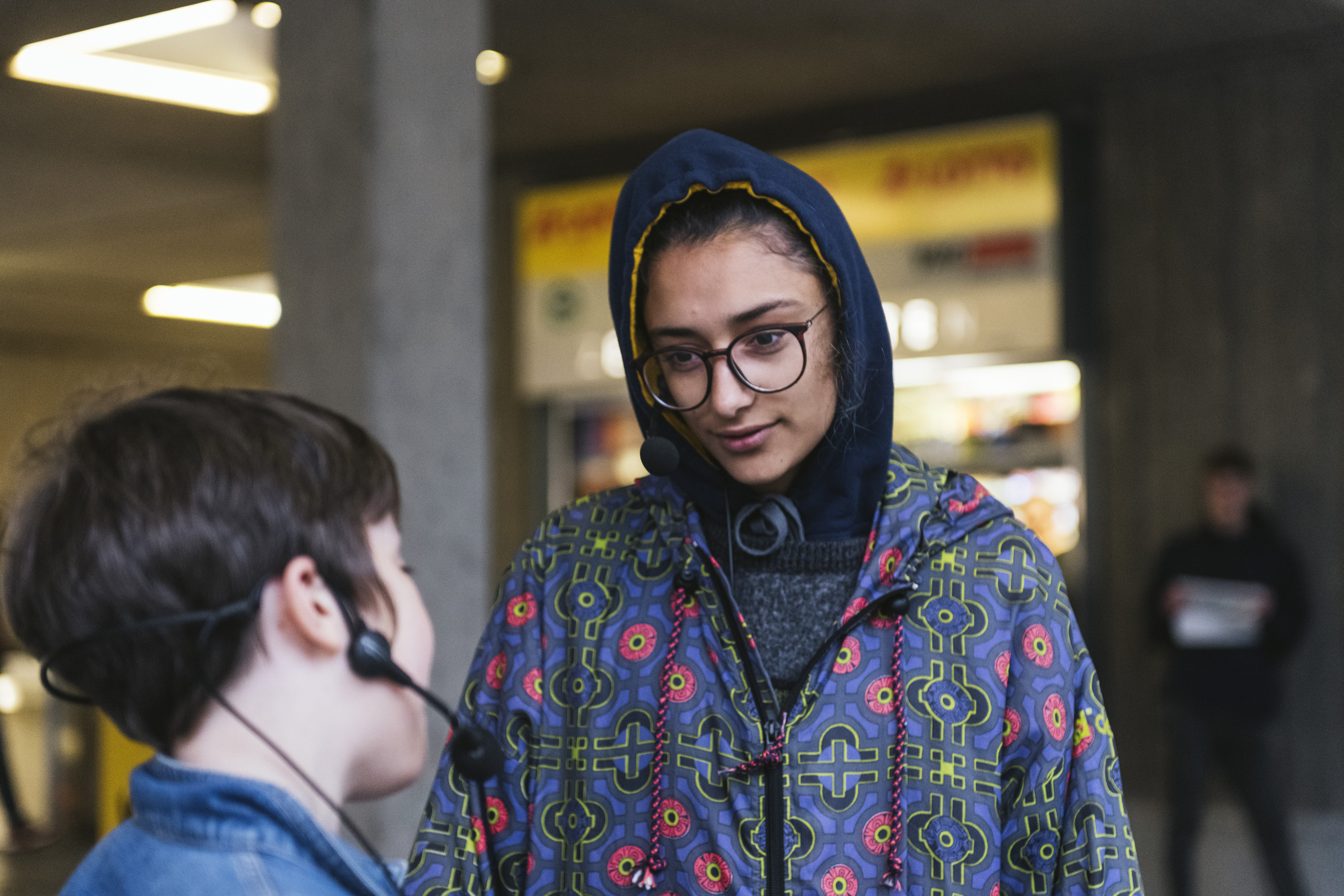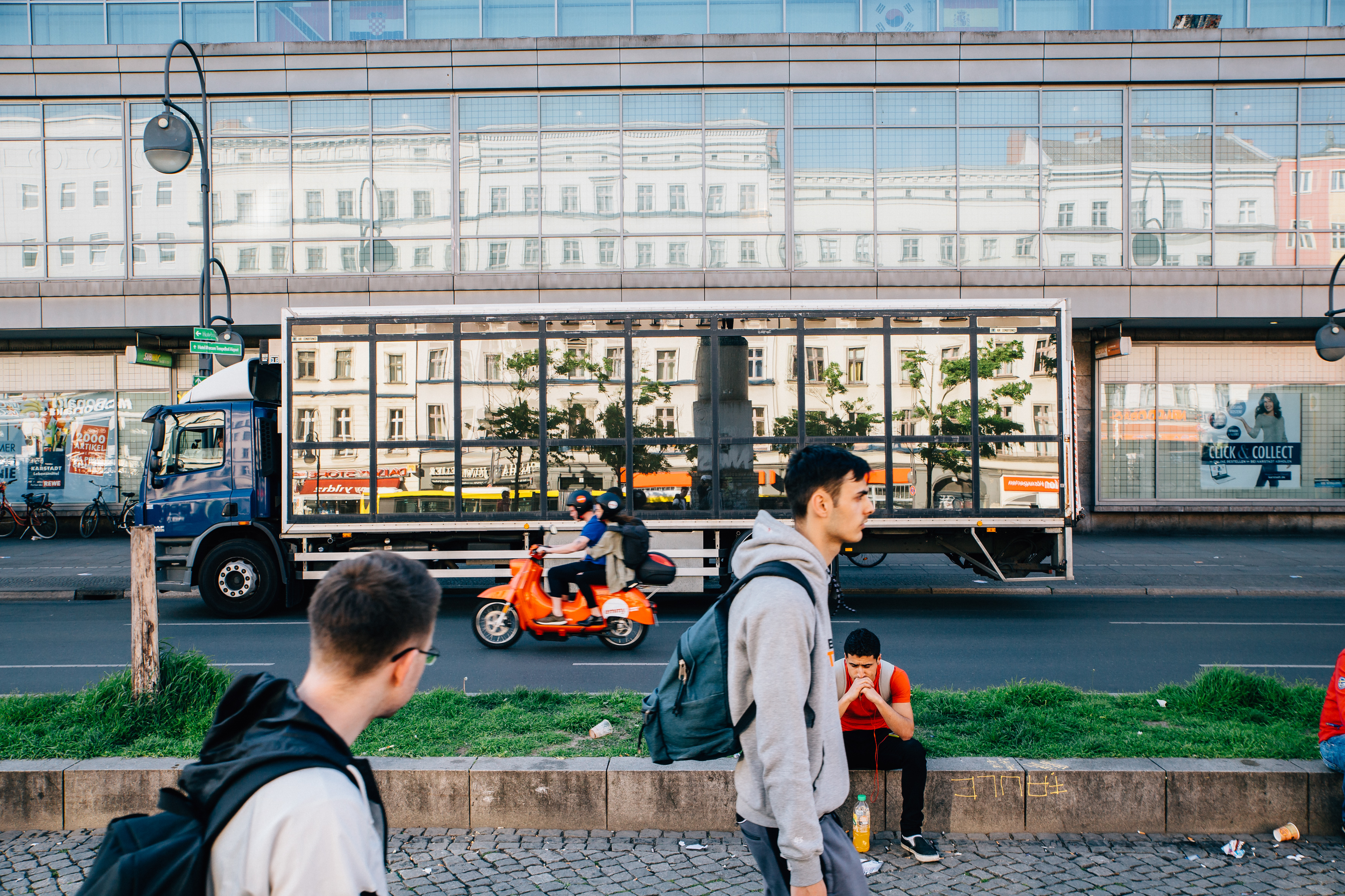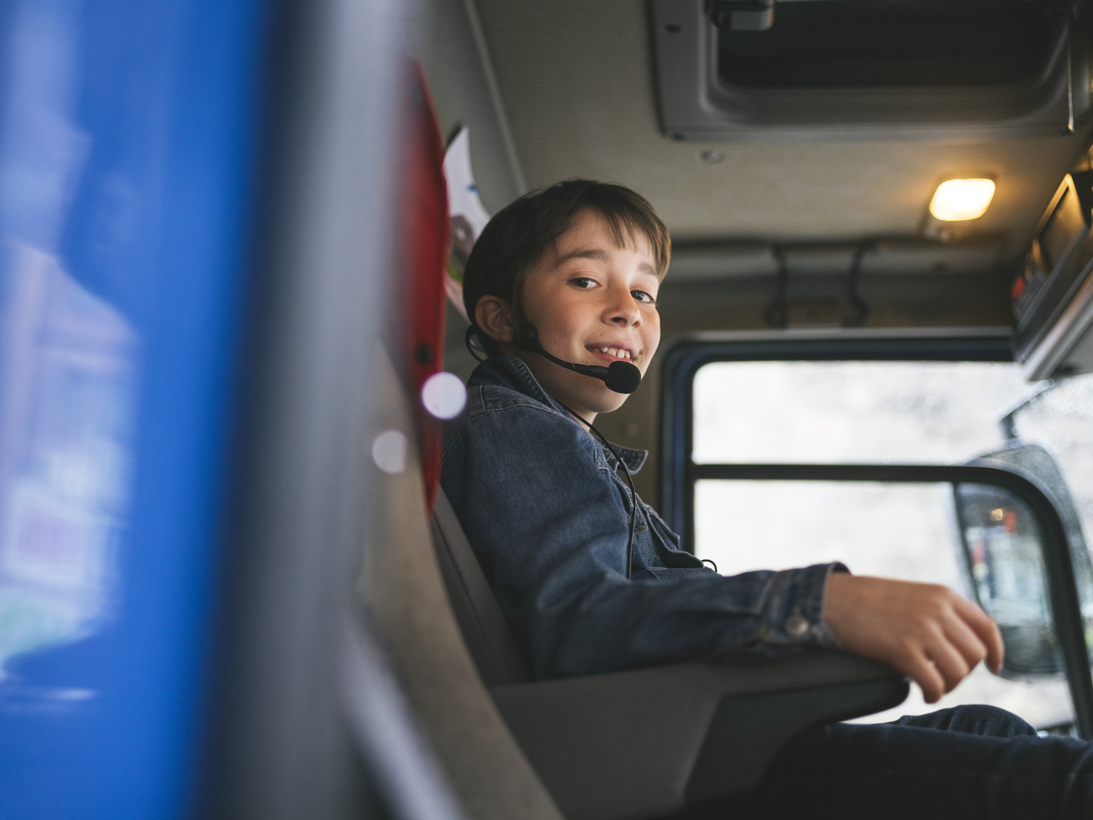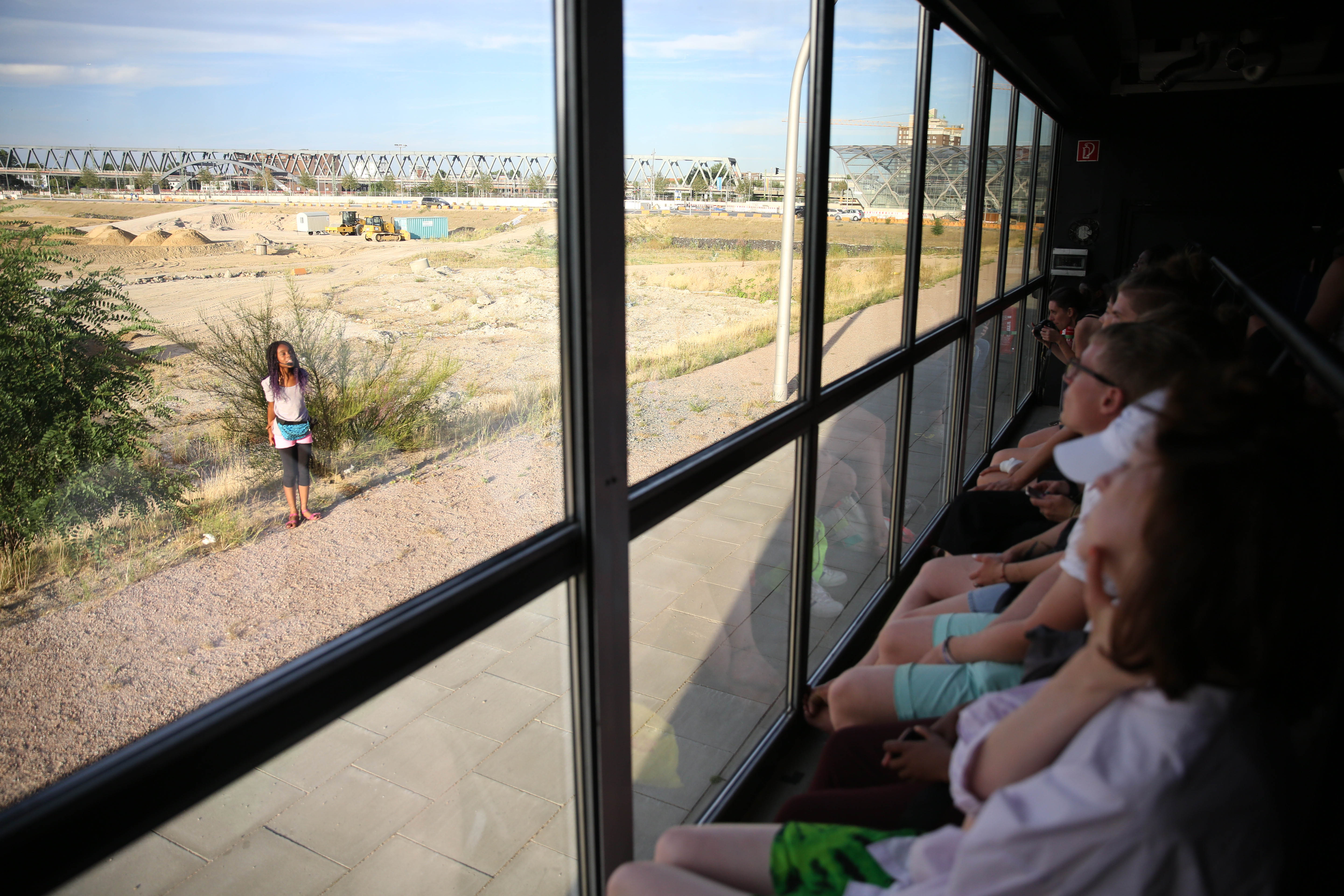Die Zuschauer*innen dieses Stücks sitzen in einem LKW, der zu einem mobilen Zuschauerraum umgebaut wurde. Durch ein großes Fenster schauen sie hinaus auf die Stadt.