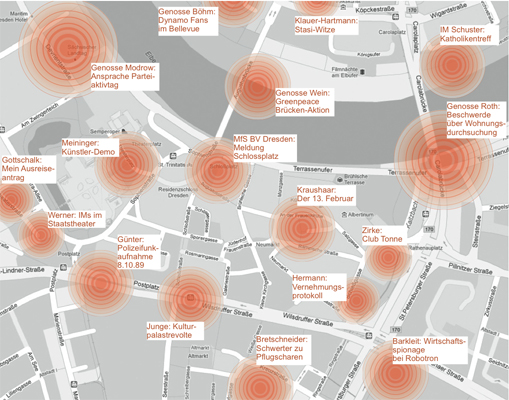 Die Besucher des Hörspiels werden mit einer Karte und einem GPS-Handy durch die Dresdner Innenstadt laufen. Das Handy ortet sie und bringt automatisch die Stimmen zu Gehör. Dabei stoßen die Spaziergänger mitten in der barocken Altstadt auf Observationsberichte, Persönlichkeitsbilder, Operativpläne, Gedächtnisprotokolle und Originaltöne aus den Archiven. Mit dem Blick auf die vertraute Alltäglichkeit der Stadt und den O-Tönen von damals im Ohr stellt sich für die Fußgänger ein seltsames Vexierbild her: Wie leicht ist es, einer banalen Handlung einen doppelten Boden zu unterstellen? Wie schnell wird etwas amtlich und unzweifelhaft, weil es einmal schriftlich festgehalten wurde?