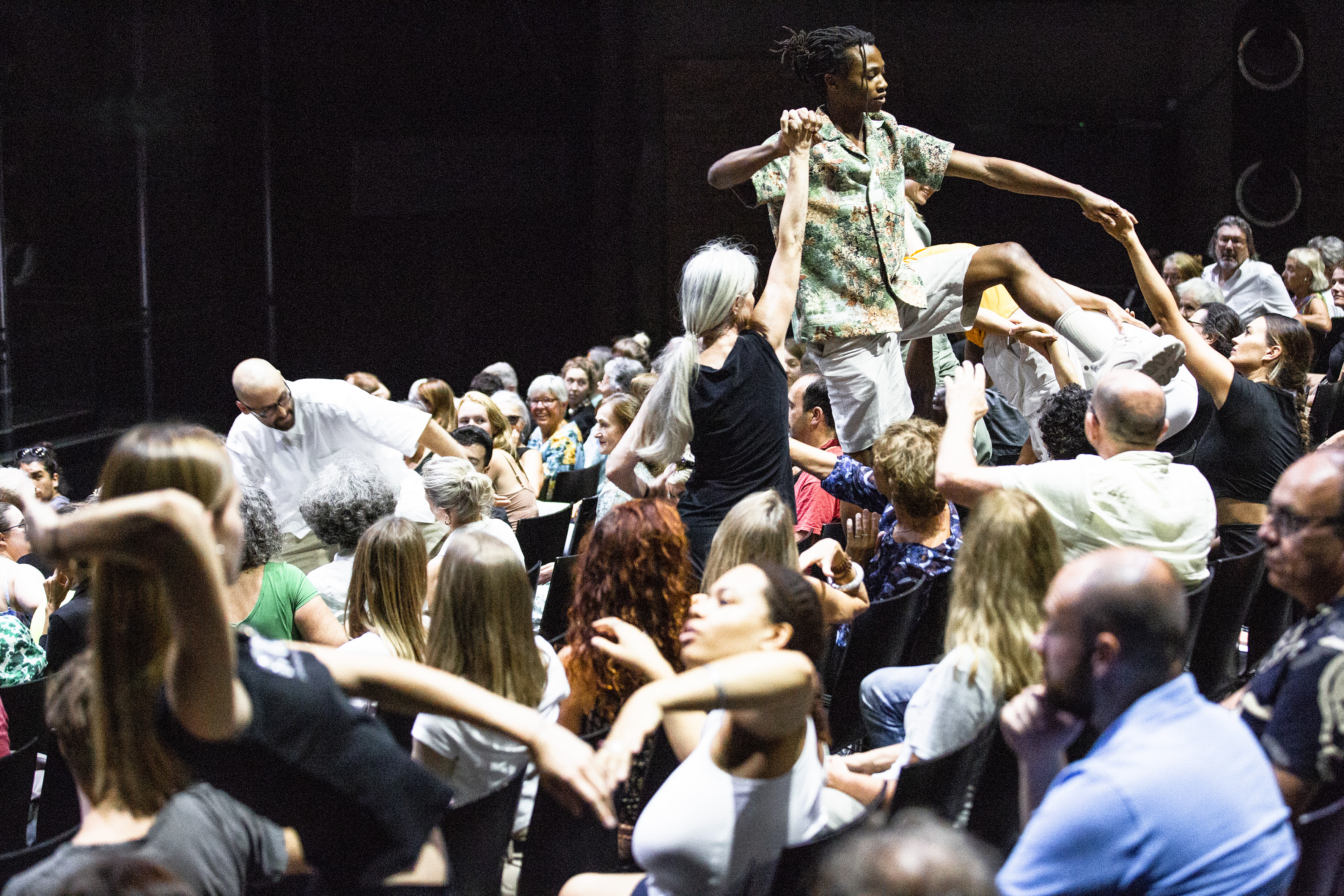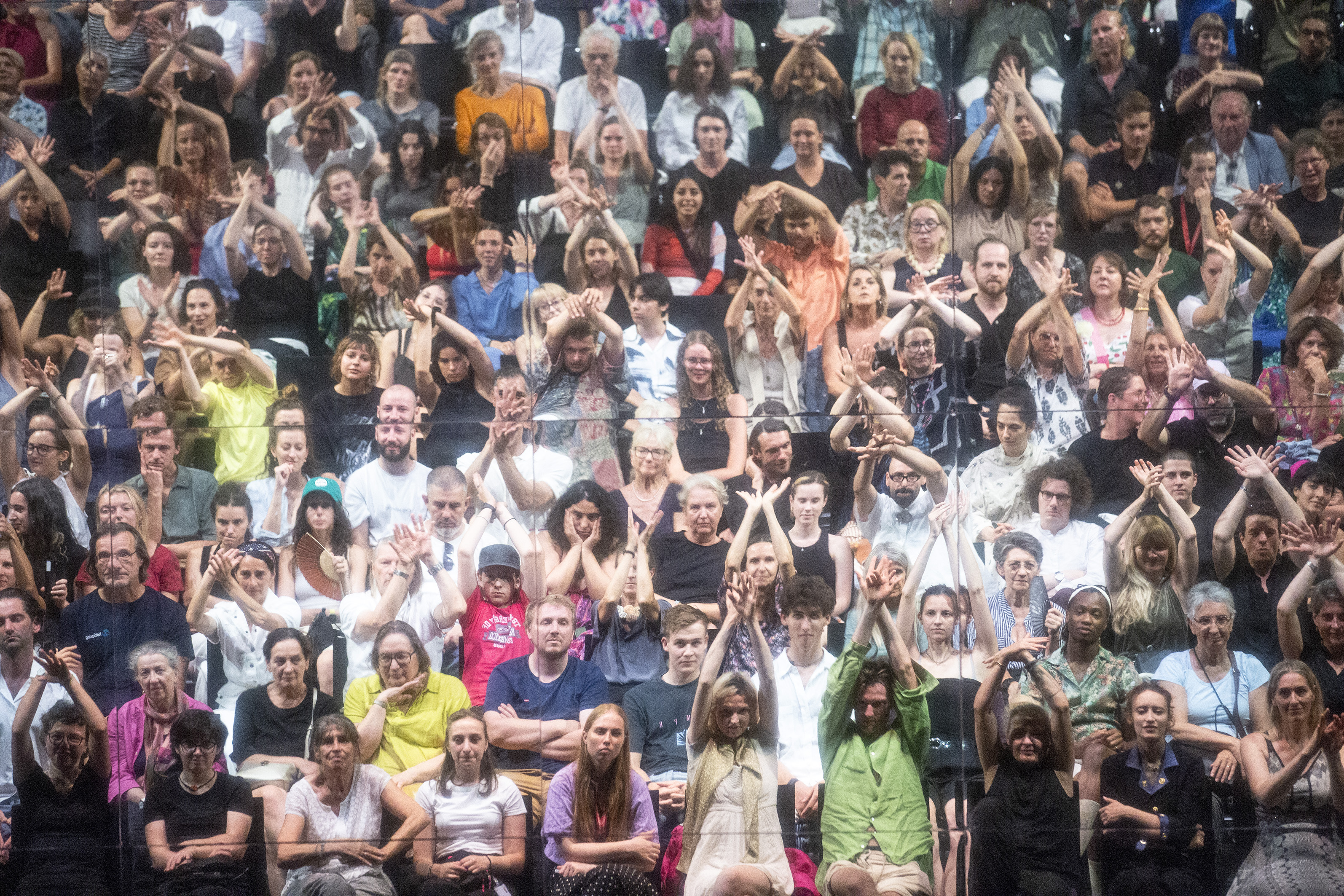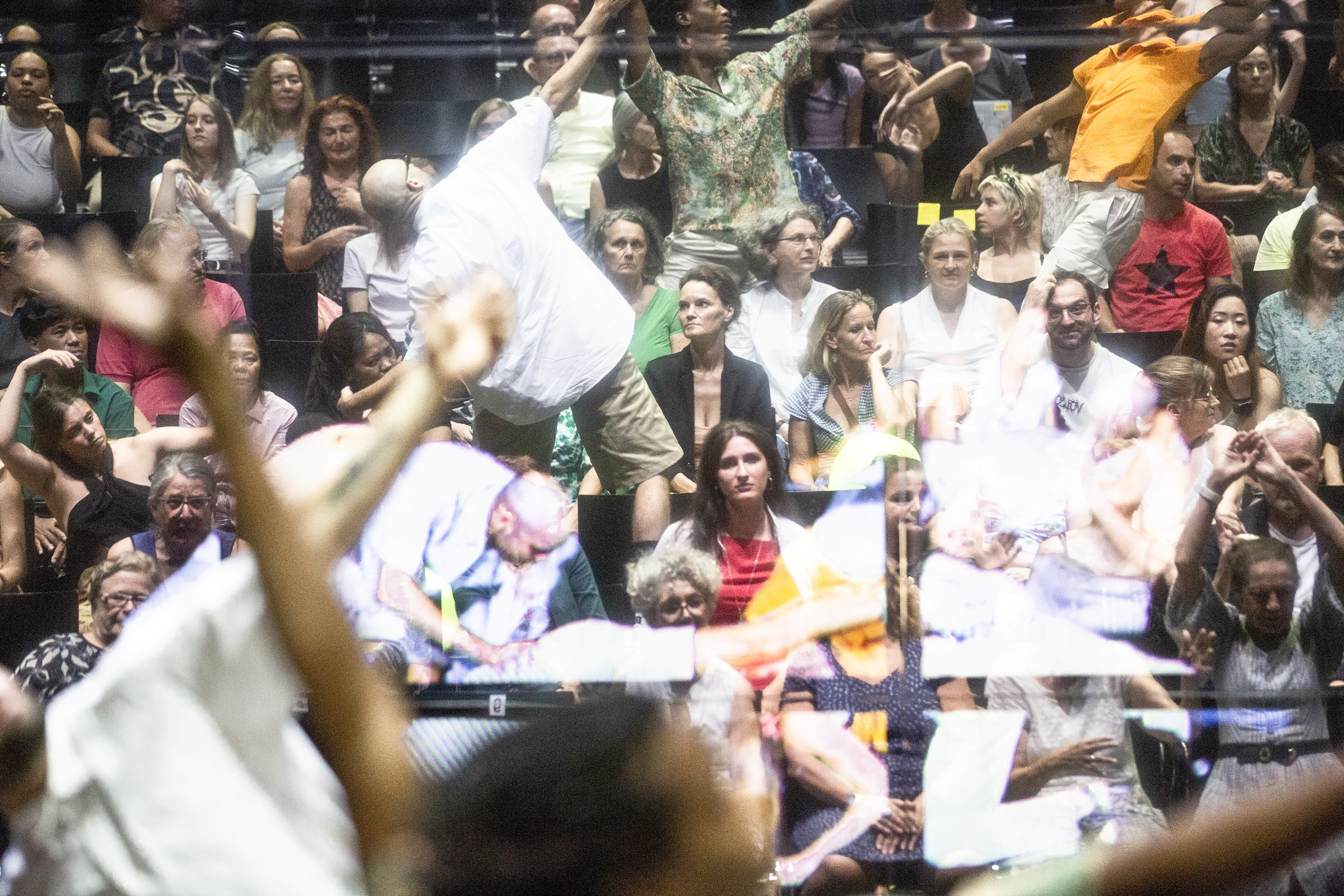 Ein Spiegel wird da installiert, wo normalerweise die Bühne ist. Er reflektiert nicht nur die Tänzer*innen, sondern wie ein gigantisches Selfie die ganze Tribüne mitsamt dem Publikum. So wird, ähnlich wie bei Aktionen des Performancekünstlers Dan Graham in den 1970er-Jahren, der Zuschauerraum zum Hauptaktionsort. Das Publikum rückt im Austausch mit den Tänzer*innen selbst ins Zentrum der choreografischen Bewegungen und erlebt sich beim „Verkörpern“ von komplexen Bildern.