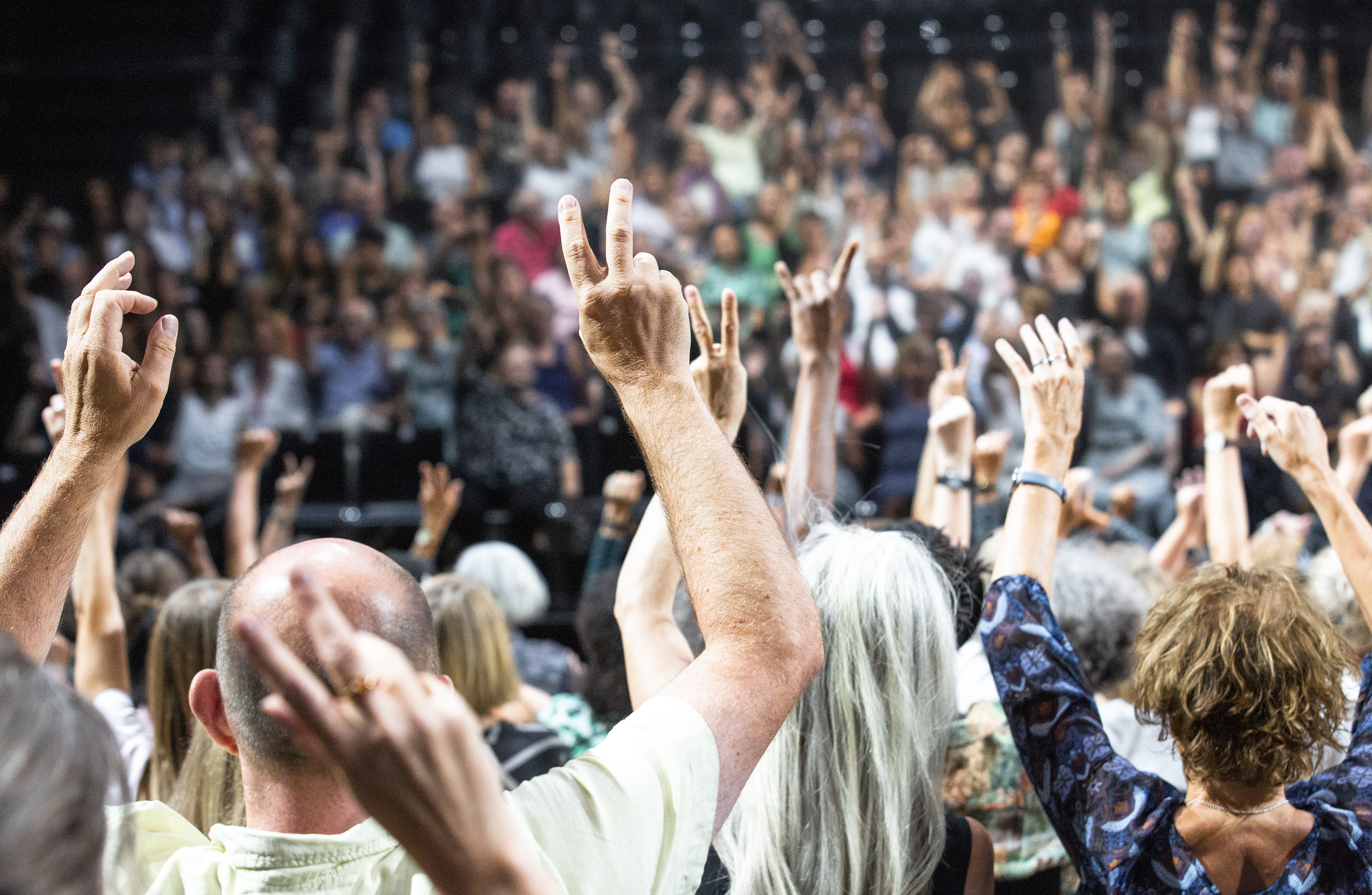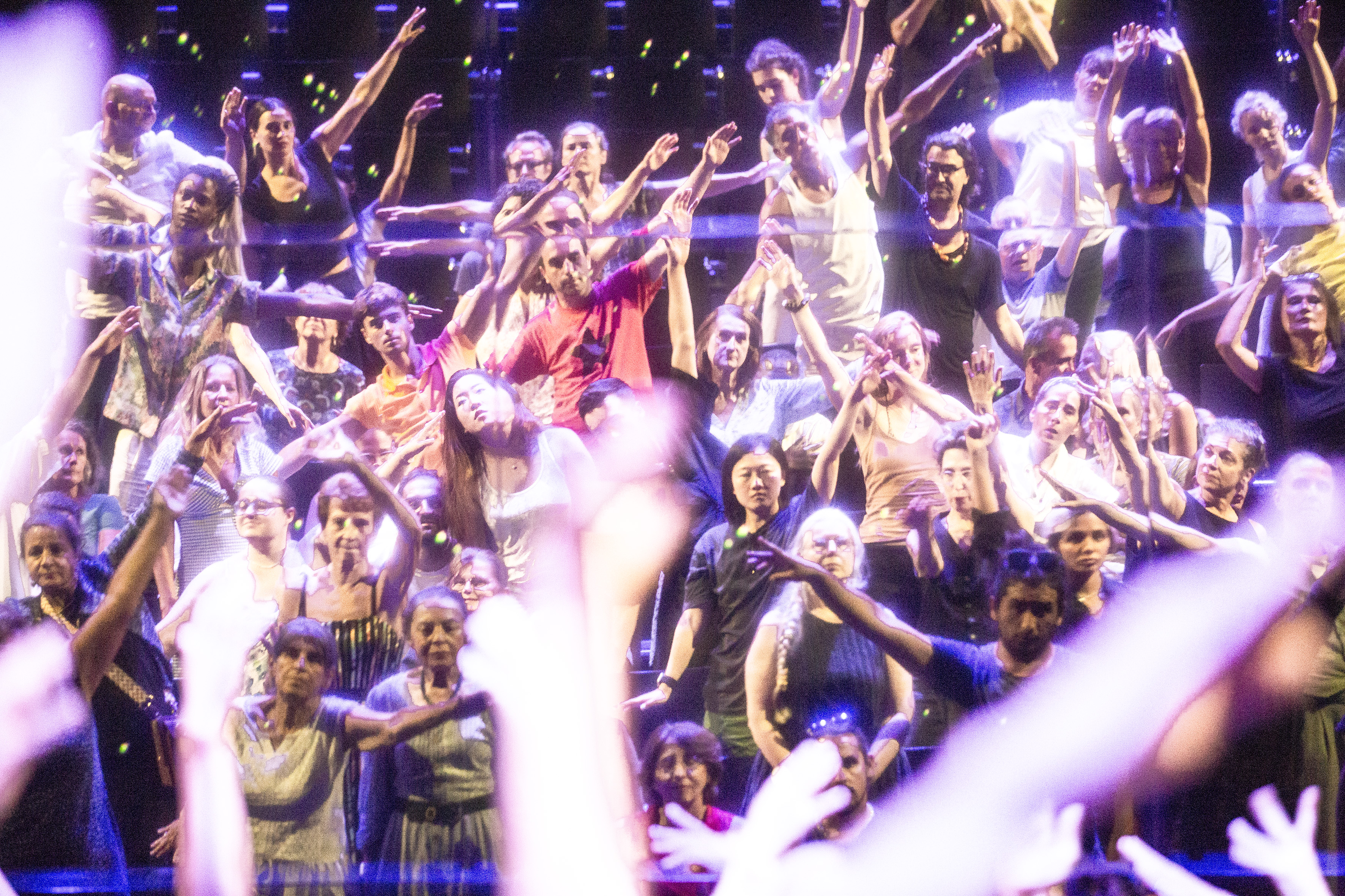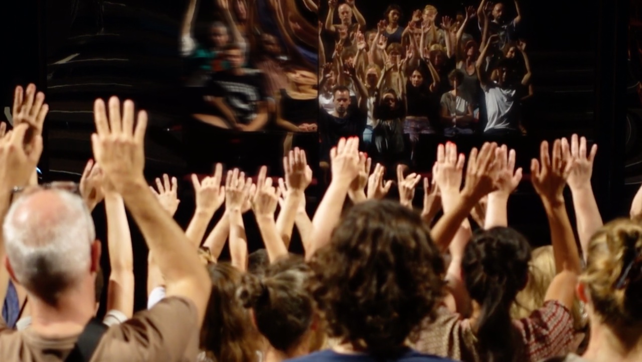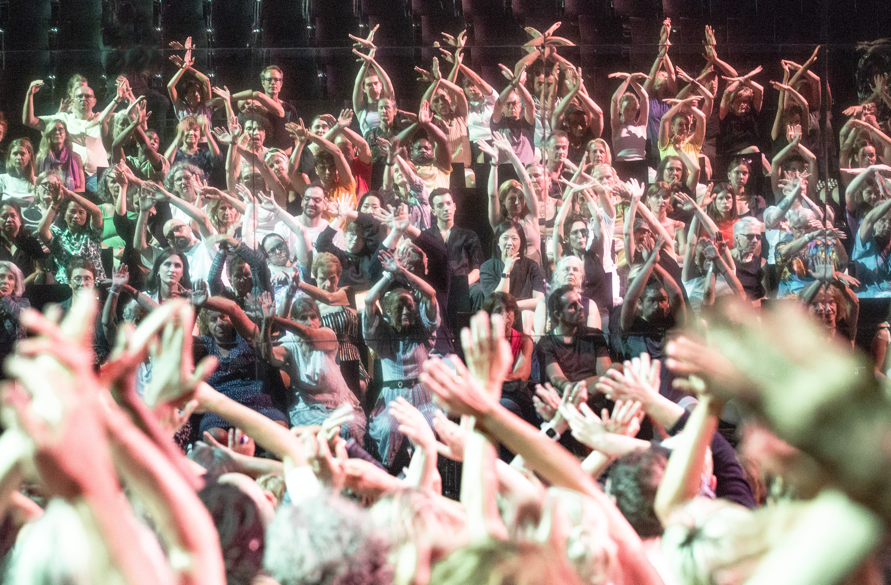 Modellhaft lässt sich mittels Bewegungsimpulsen eine Gruppe von Menschen auf einer Tribüne ähnlich vernetzen wie ein Gehirn. Vertont wird dieses bewegte Bild durch ein Musikarrangement mit O-Ton-Einspielungen von Wahrnehmungsforscher*innen. In der Wahrnehmung des Publikums verwebt sich die Szenerie mit deren Gedanken, illustriert oder konterkariert sie, vervollständigt oder widerlegt sie. Jeden Abend anders.