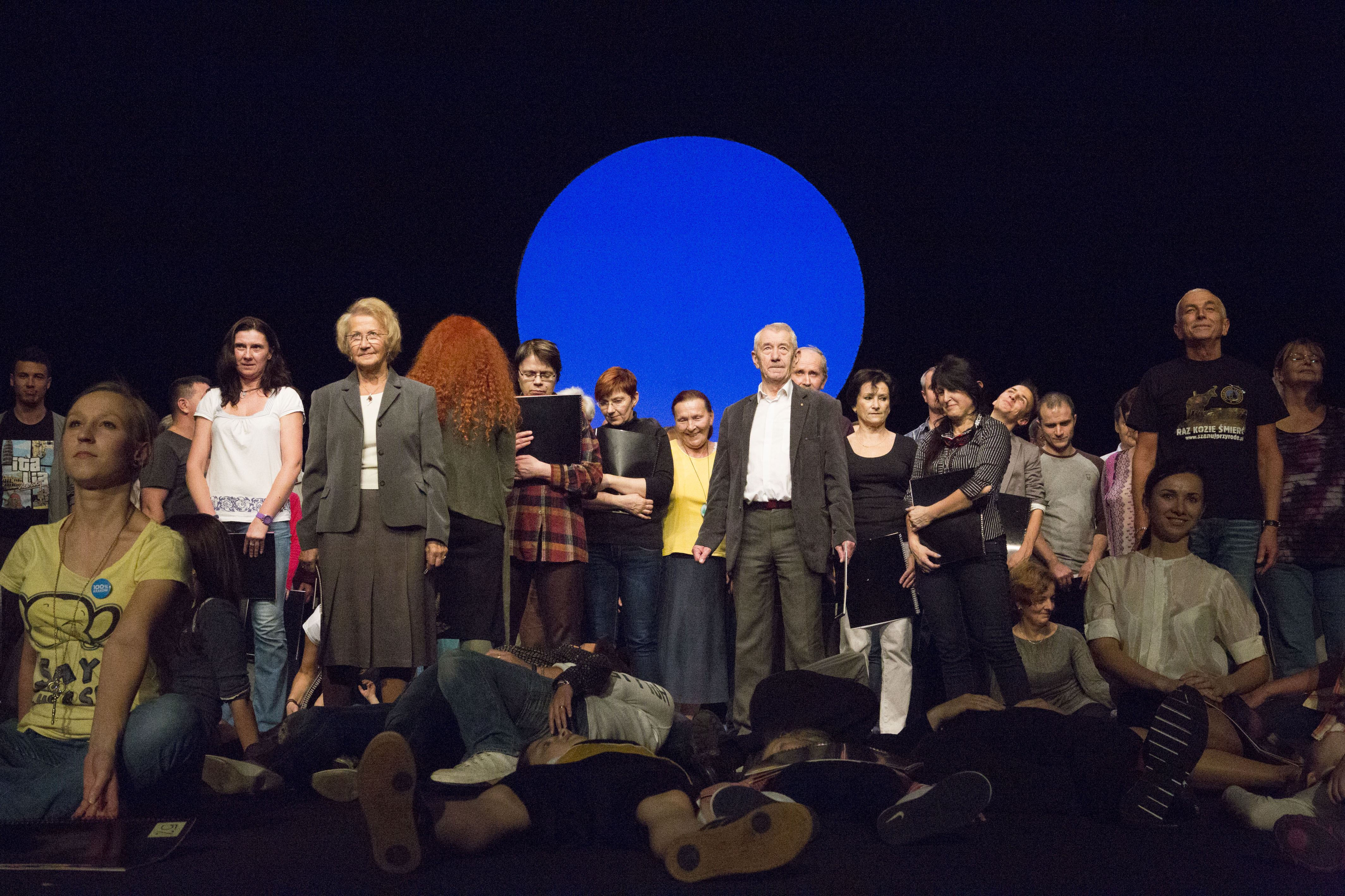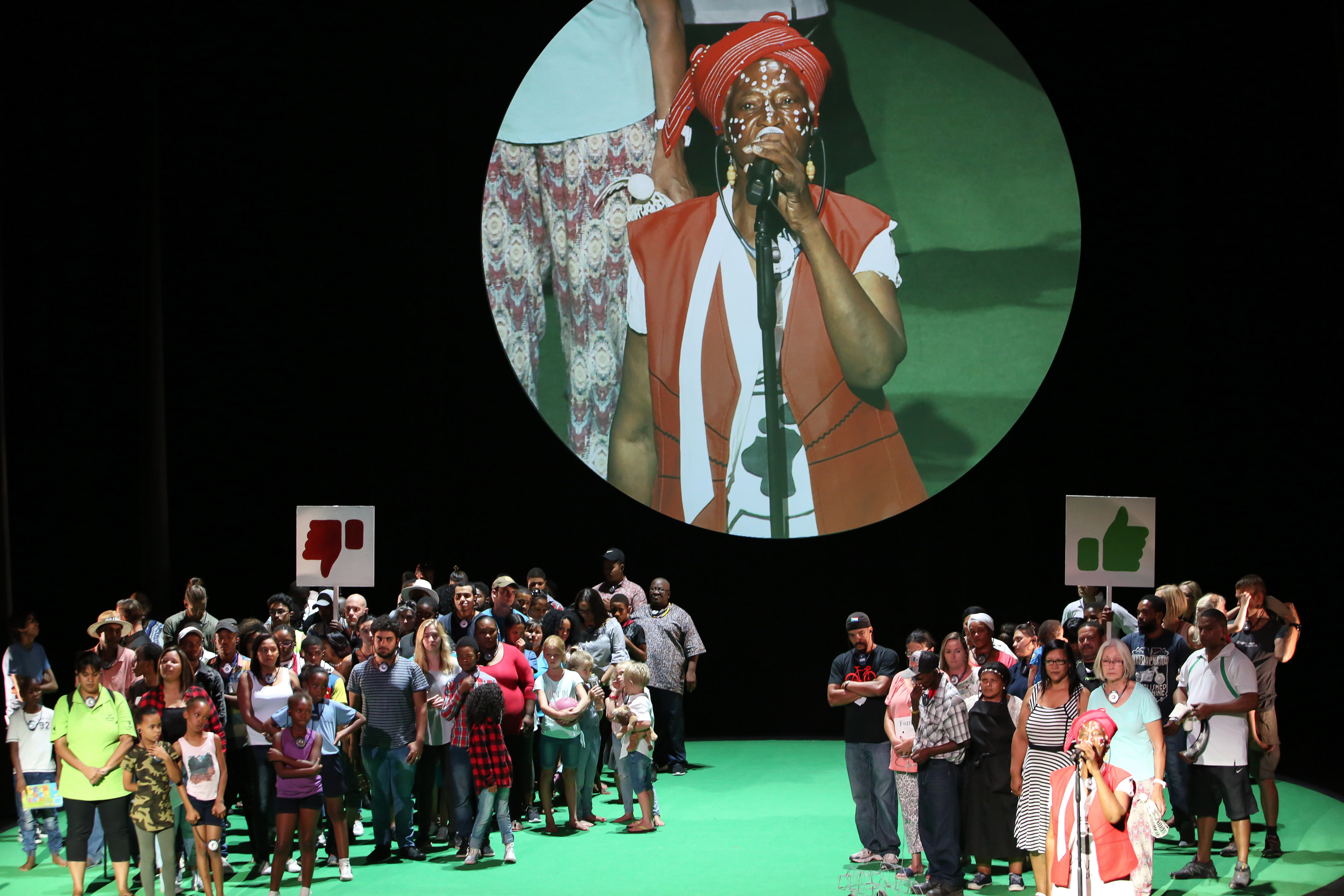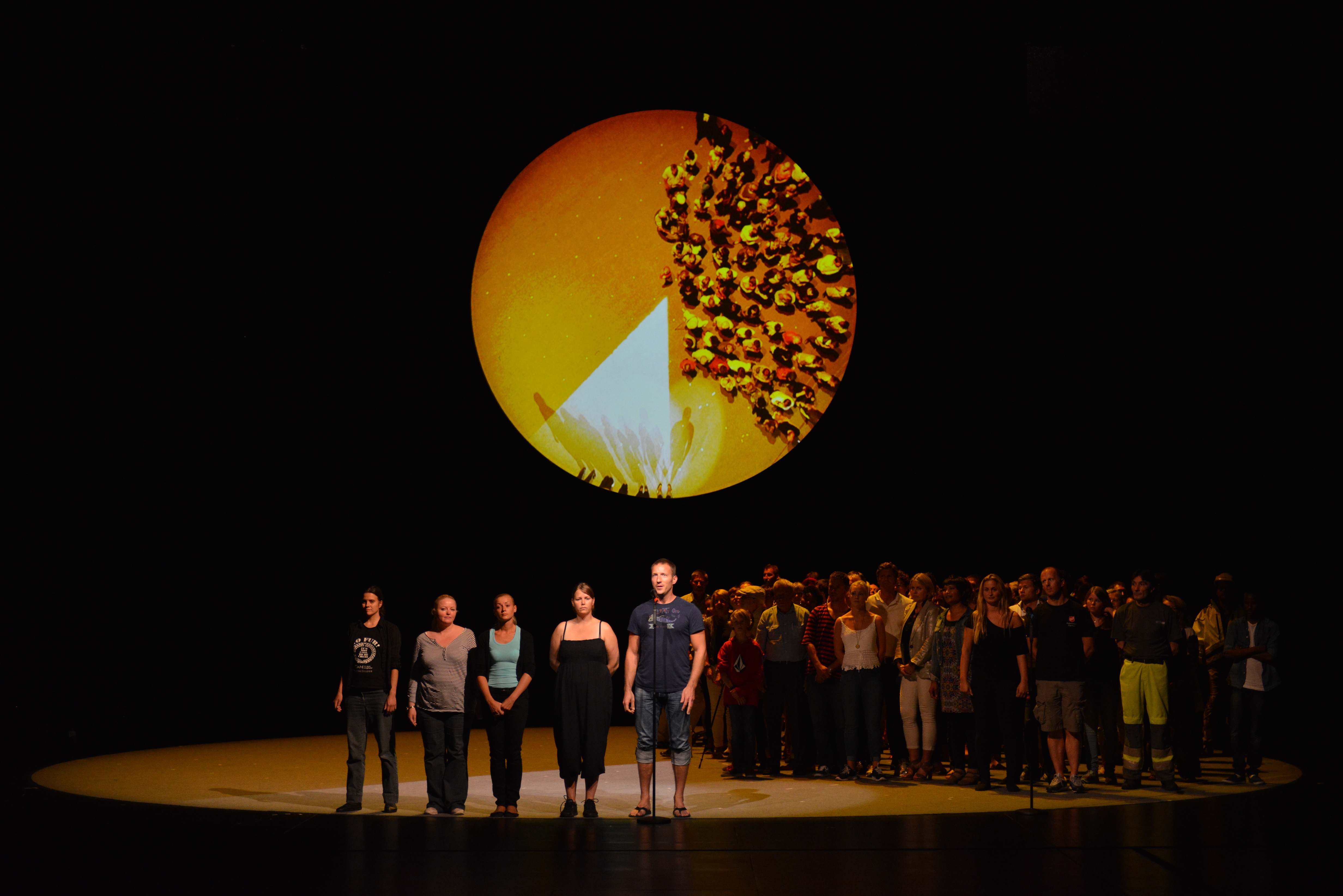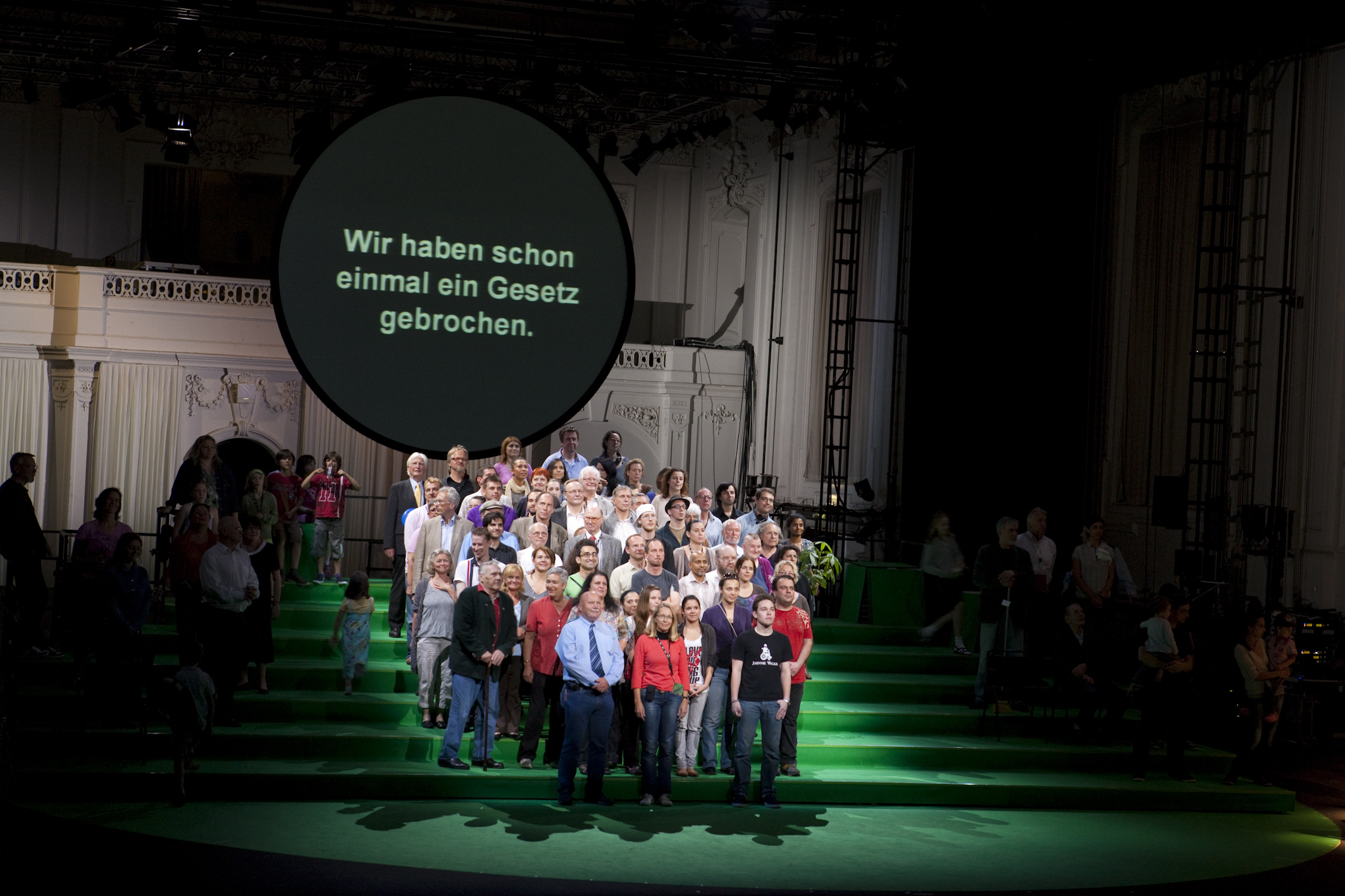 Eine Ansammlung von hundert Menschen, die nach 5 Kriterien genau eine Stadt abbilden, eine repräsentative Stichprobe stellt sich auf einer großen Drehbühne zu immer neuen Gruppenbildern zusammen. Gruppenbilder als flüchtige Portraits von Zugehörigkeit. Als Familienersatz oder Kleinstverein. Nach Alter oder Wohnsitz, nach Geschlecht, politischer Gesinnung, bevorzugten Eckkneipen, Verkehrsmitteln, Brotaufstrichen, Dramatikern sortiert und dann, nach und nach, als Stimmenmeer, als geometrischer Körper auf 100 Quadratmetern Bühne...