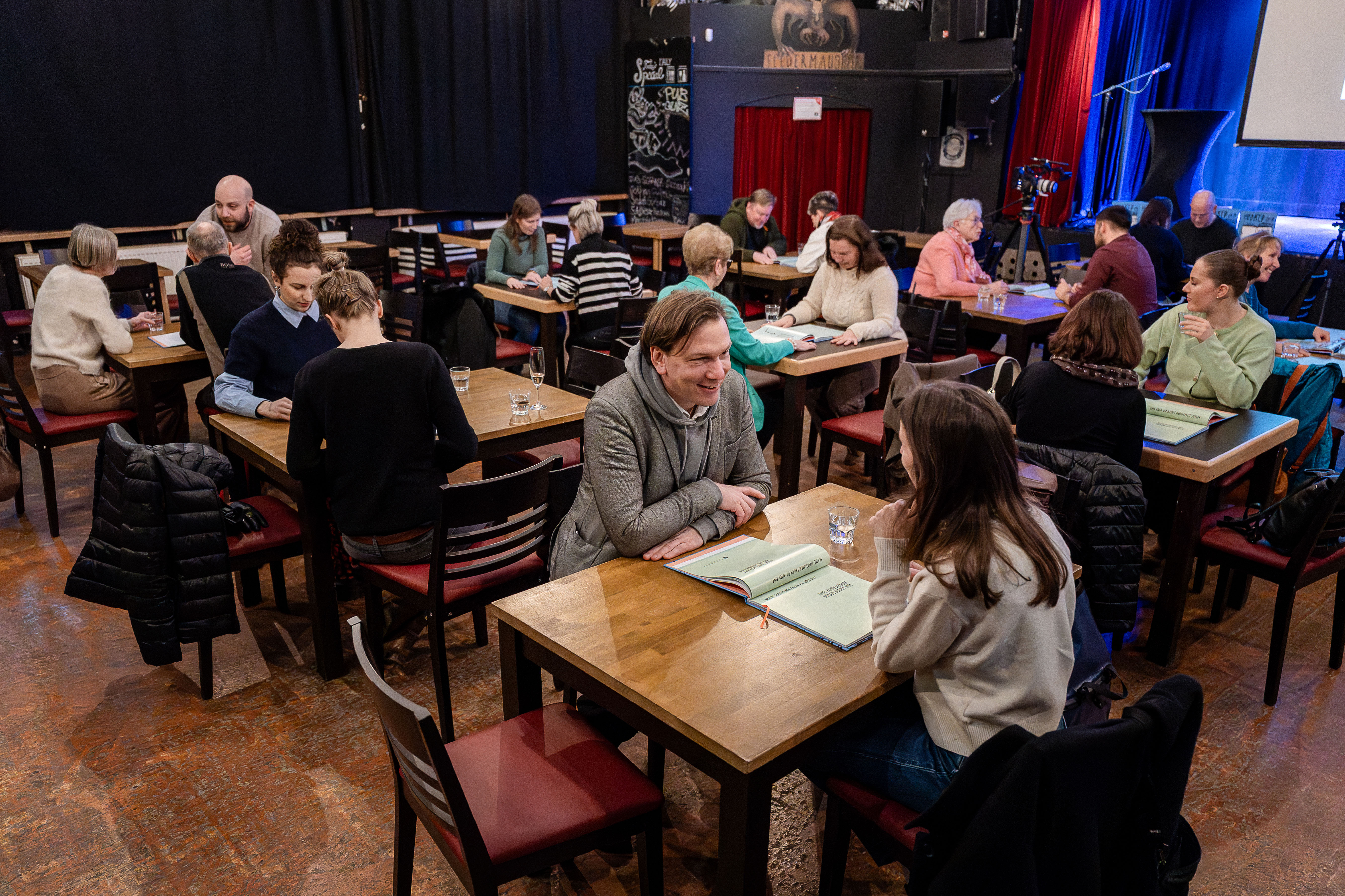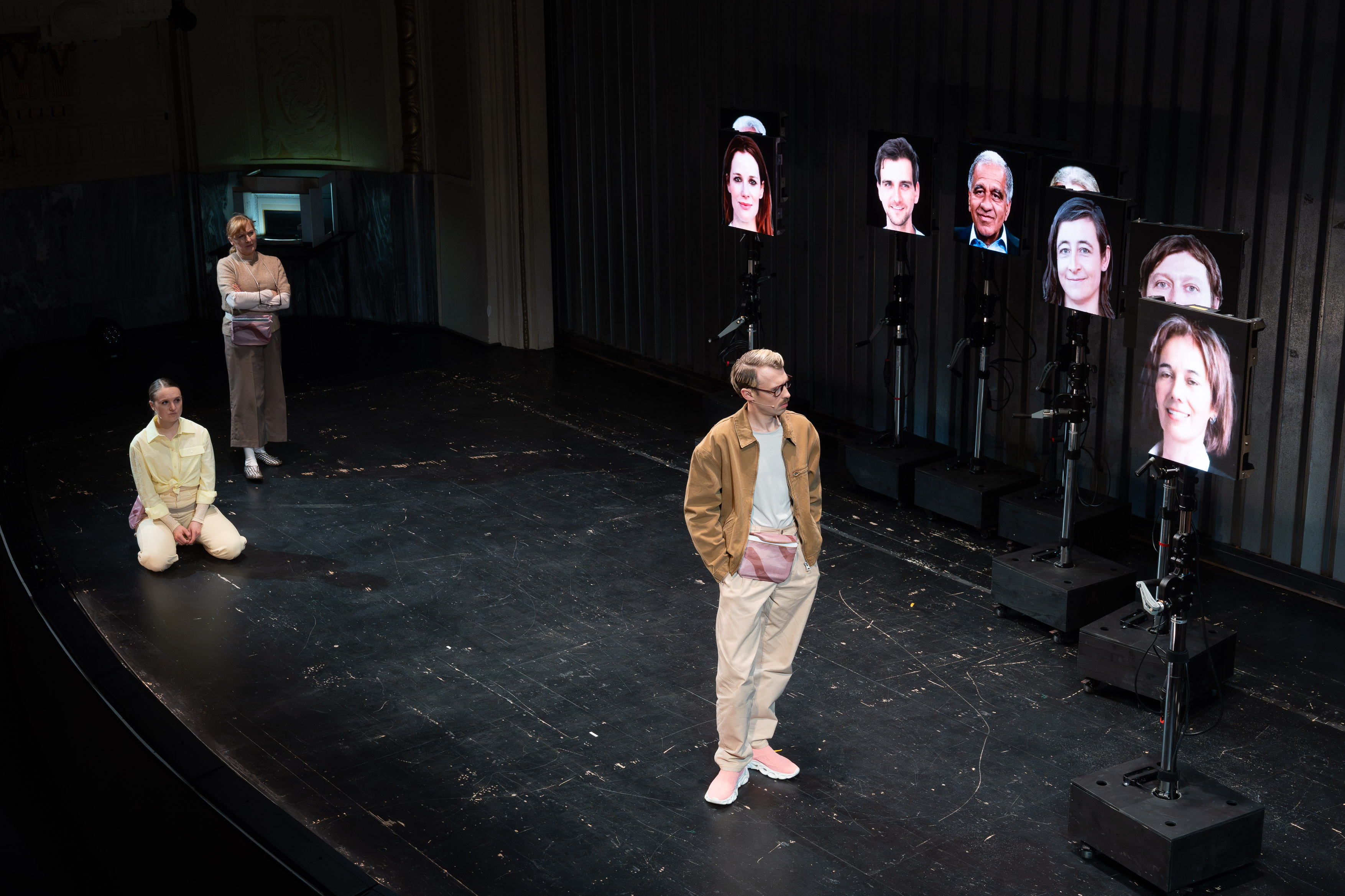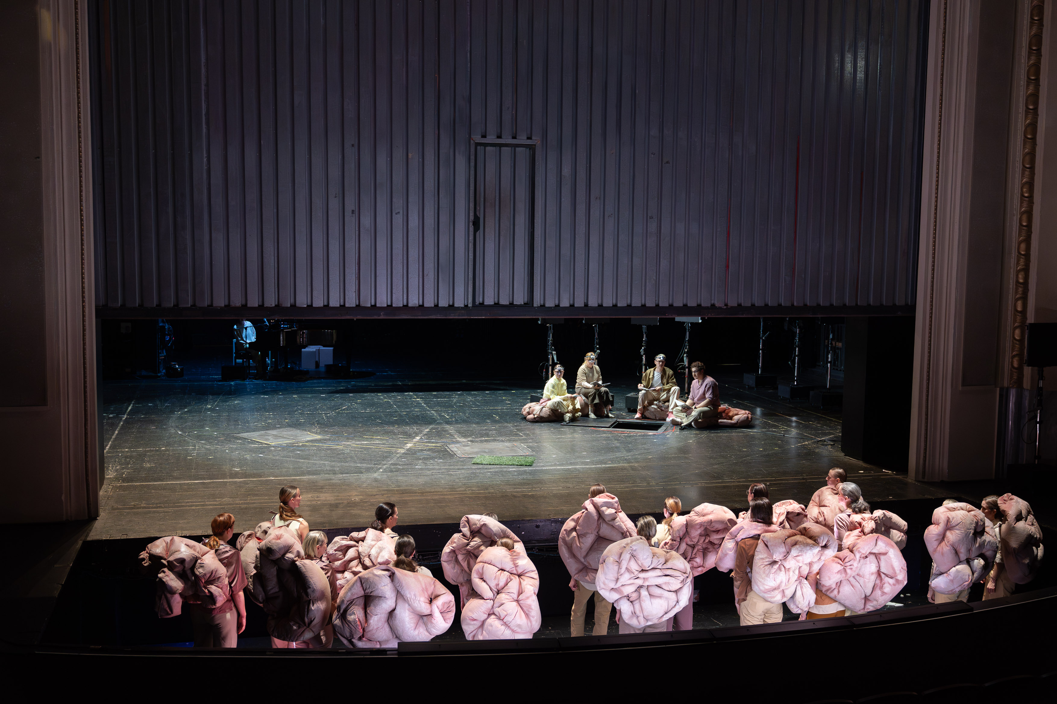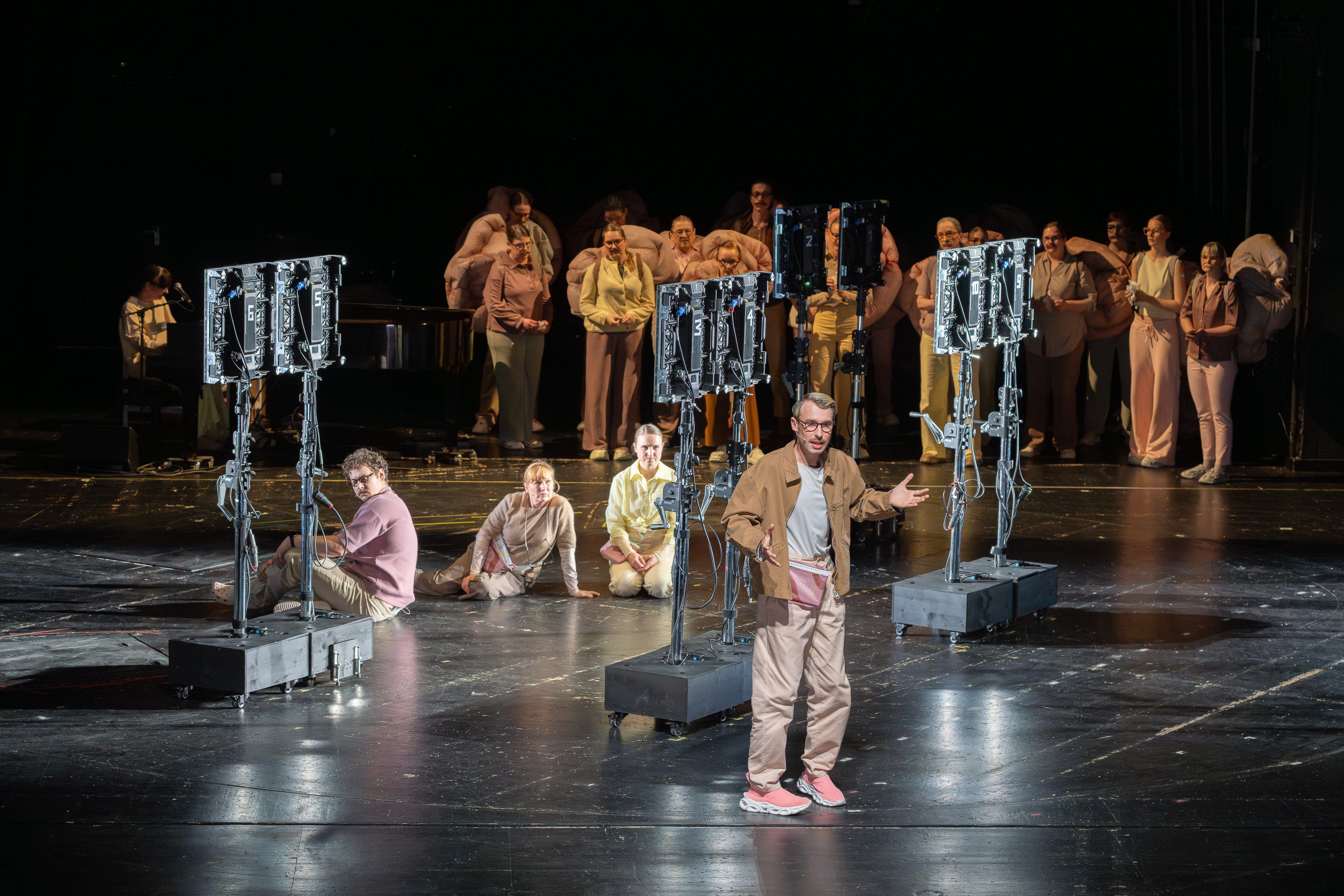 SWEAT. Songs of Push and Pull. Adaption at Pina Bausch Center Wuppertal (November 2025), Thaddäus Maria Jungmann adressing the audience