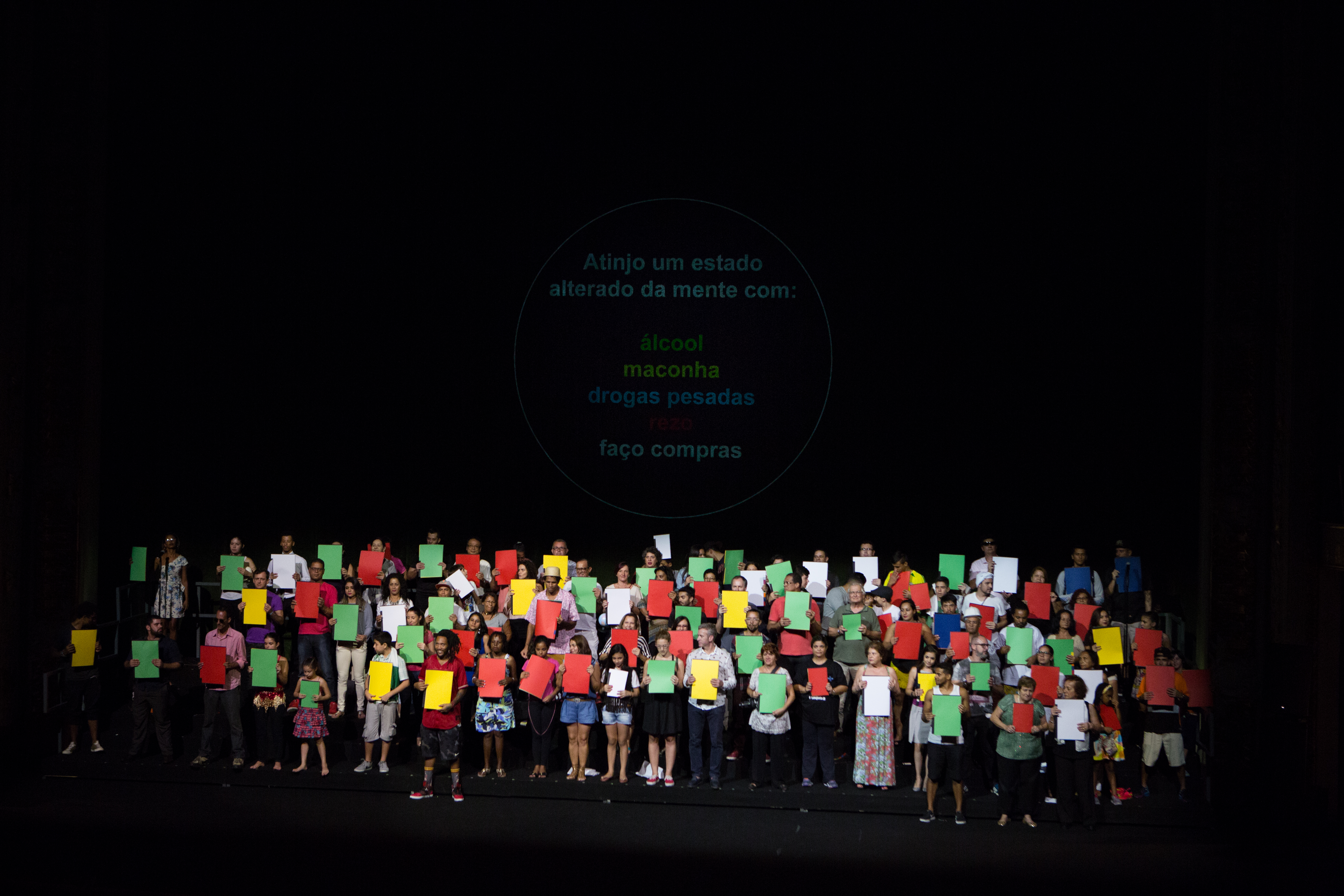 100% São Paulo - a gathering that is a city, a group just beginning to experience itself, a choir that has never practiced, an impossible entity with many faces – assembled into ever-changing new group pictures: group pictures as replacement for family – as fleeting portraits of belonging. Who is missing? Who thinks they might give answers on stage that are different from the ones they’d give in response to a telephone survey or in the voting booth? And what have the statistics failed to record? Who lives in a completely different São Paulo? Who thinks that this city is different because they are a part of it?