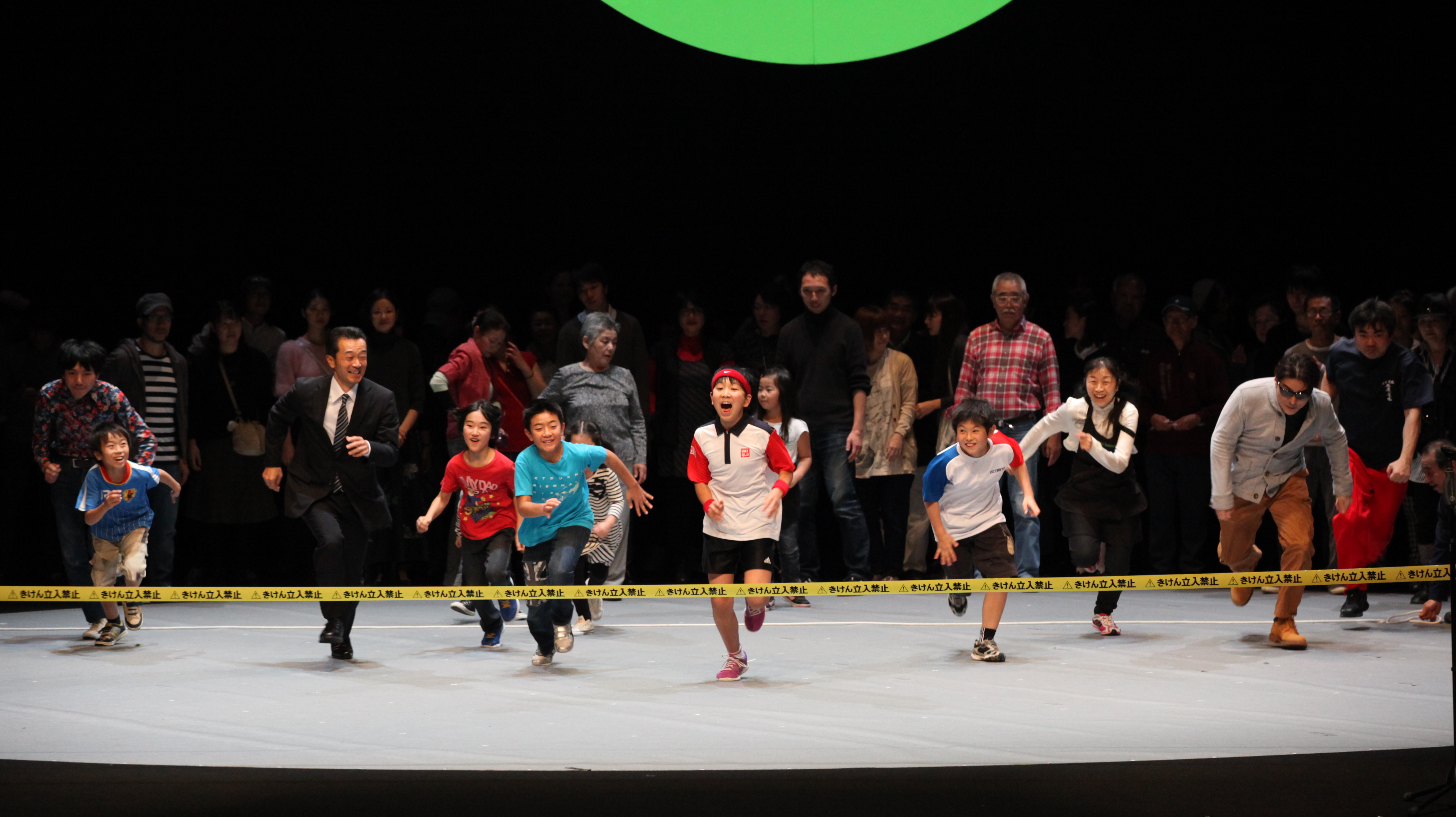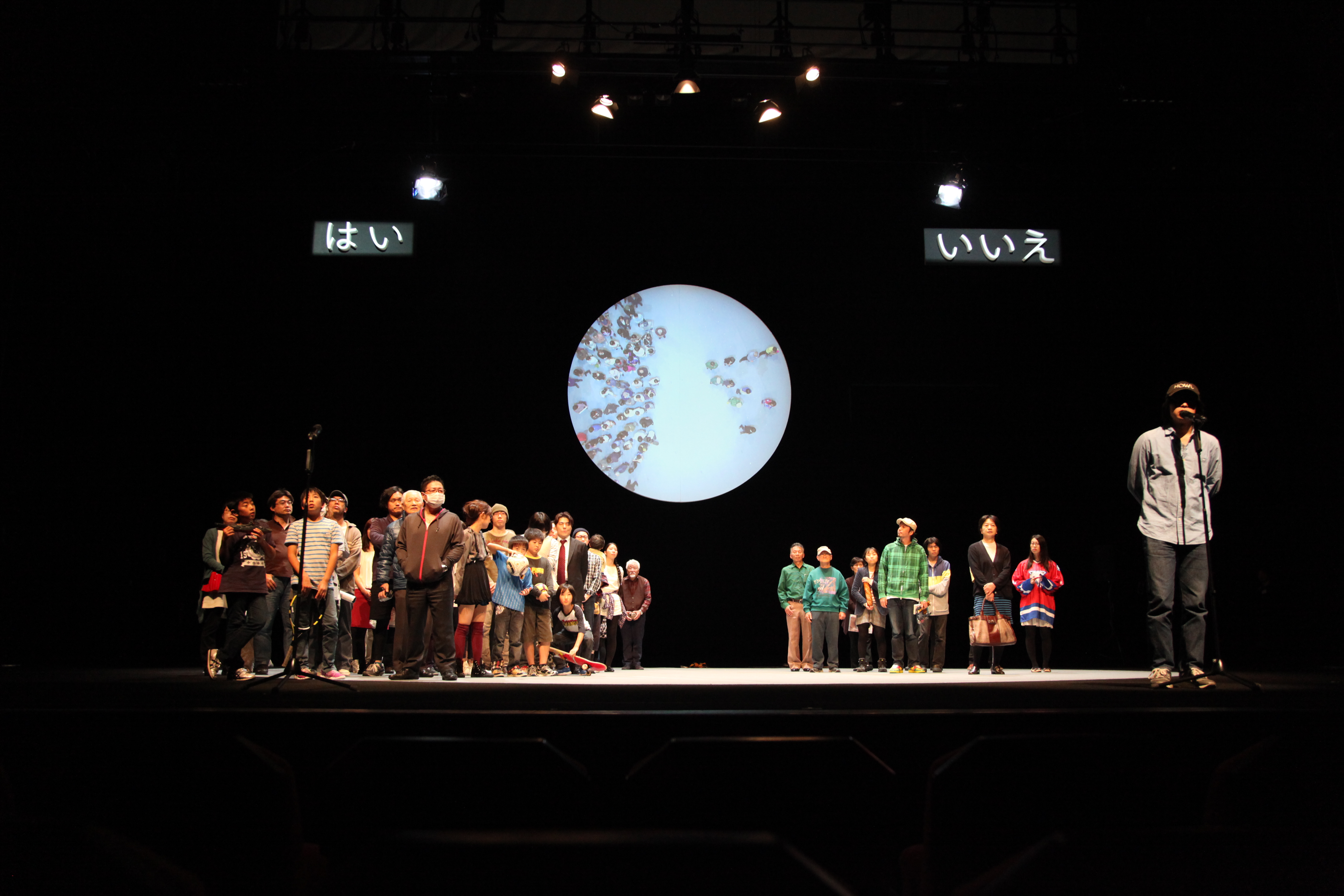 Statistics gather people and pack them into pieces of pie, into bars and curves that are used for political argumentation and the creation of economic strategies. What if these statistics were given faces? What if Tokyo city's 9.055.257 population was represented on stage by 100 persons? 100%Tokyo takes the risk and generates the average of one of the most densly populated cities of the planet. In a world bombarded with ‘lies, damned lies and statistics’ this cross-section of the society could tell the truth of modern Tokyo life in a way graphs or pie-charts never could. Spreading throughout Tokyo over four months, 100% Tokyo began with the casting of one member who had to recruit another in 24 hours, who then recruited another and so on – all according to specific criteria of age, gender, household status, nationality and district mirroring the demographic make-up of this mammoth metropolis. At first, this casting process was easy. But with each passing day, the stakes increased. As the various statistical categories began to fill up, the chances of finding people who could occupy the remaining categories became more remote. Gaps had to be filled, new connections established, some people could only be found through newspaper ads and networking. But now, around four months later, these 100 Tokyoites are filing onto a revolving, circular stage in Tokyo Metropolitan Playhouse.