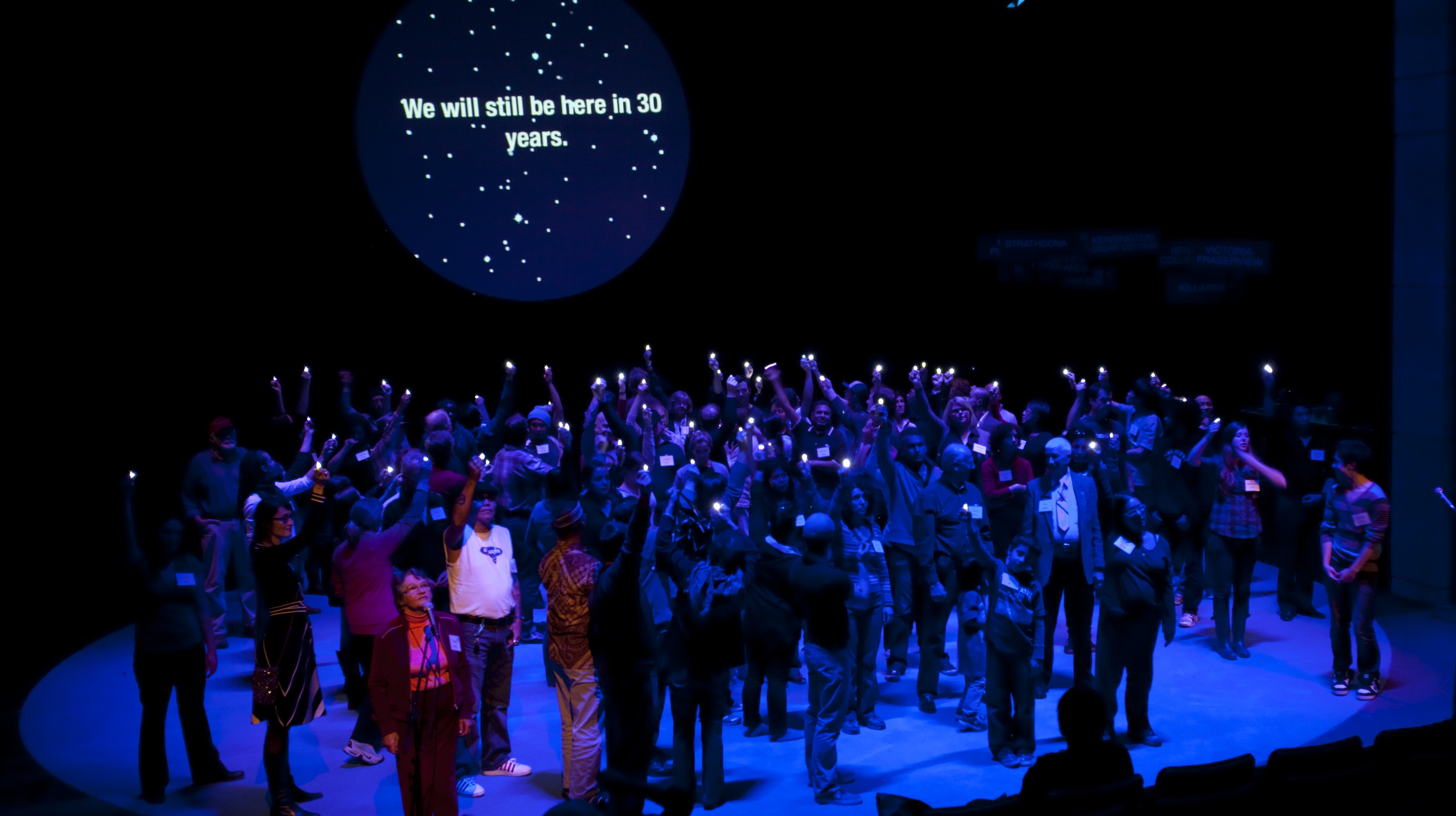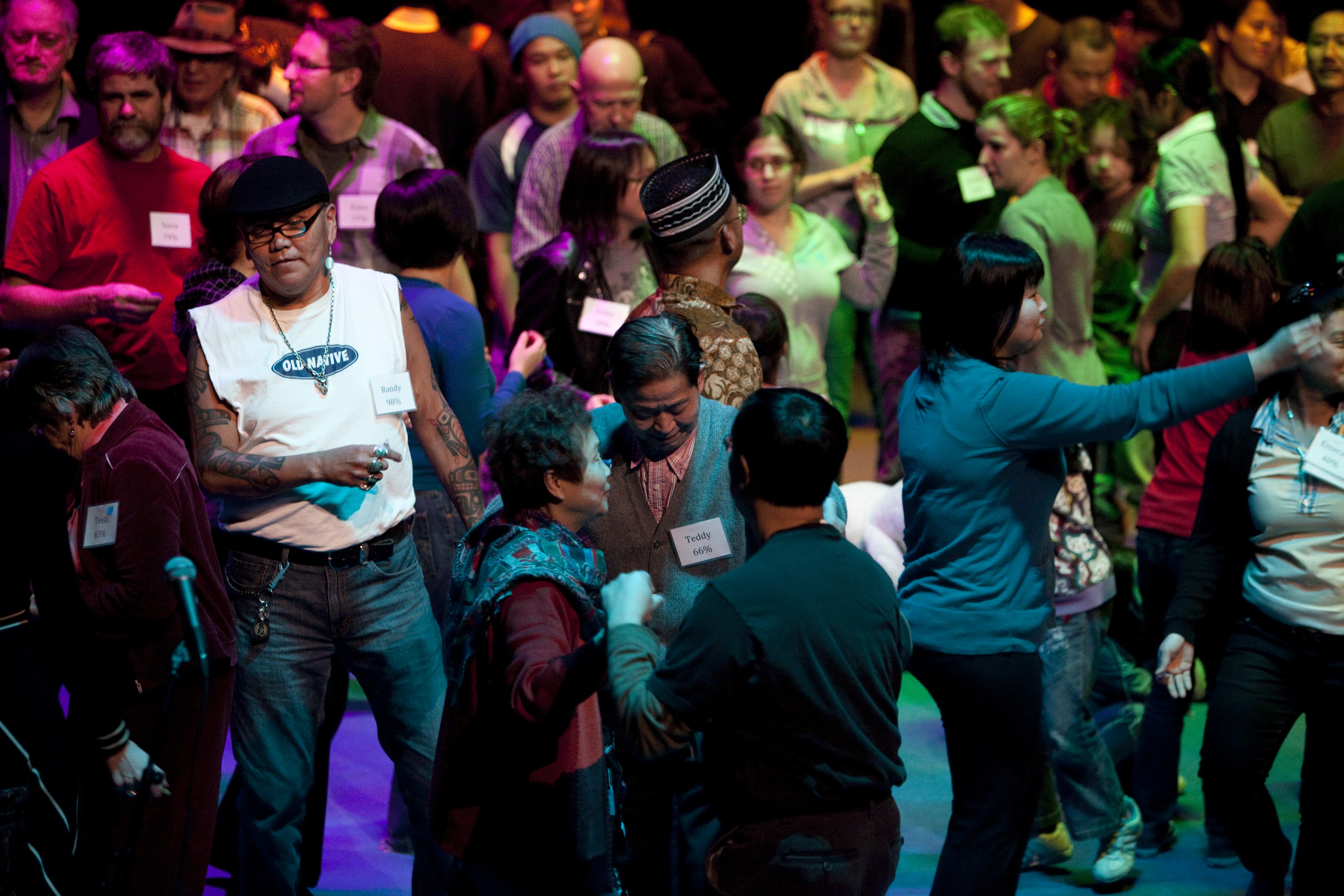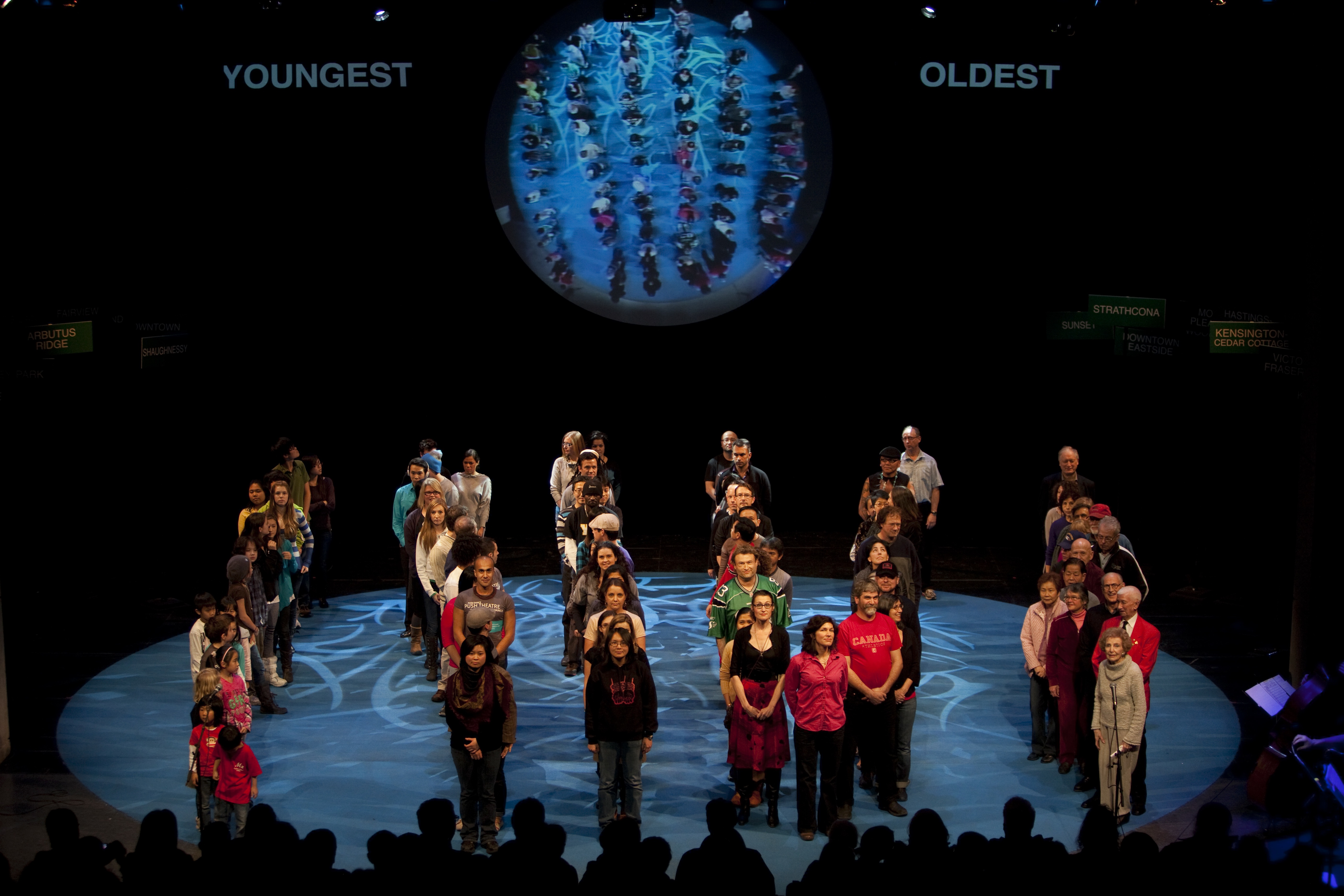 One by one, 100 people enter the stage. These are not trained actors. These are everyday Vancouverites. The demographics of a city brought to life, with the stories and individuals that make up Vancouver 125 years after its official beginning. As questions are posed, the participants sort themselves according to opinions and political leanings, where they're from, how they spend their time, car they drive, bus they take, peanut butter preference and so on. A living, breathing portrait of Vancouver emerges.