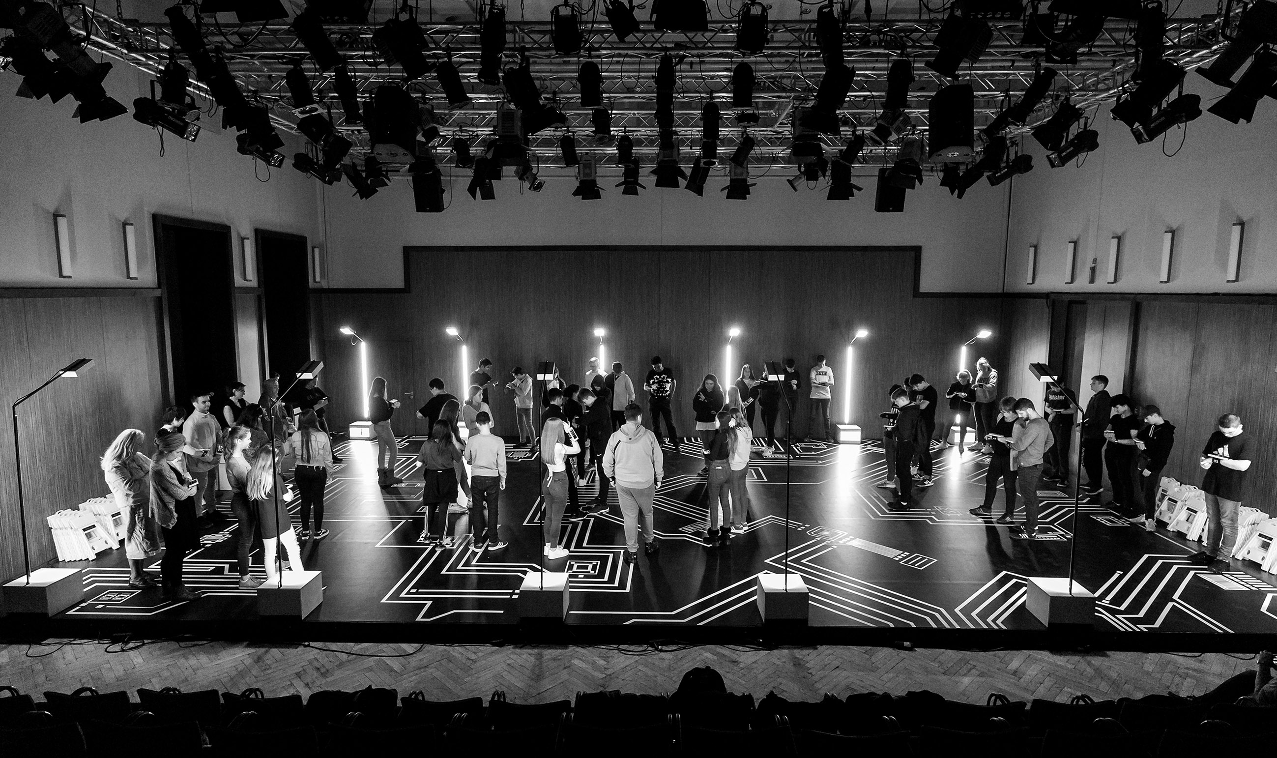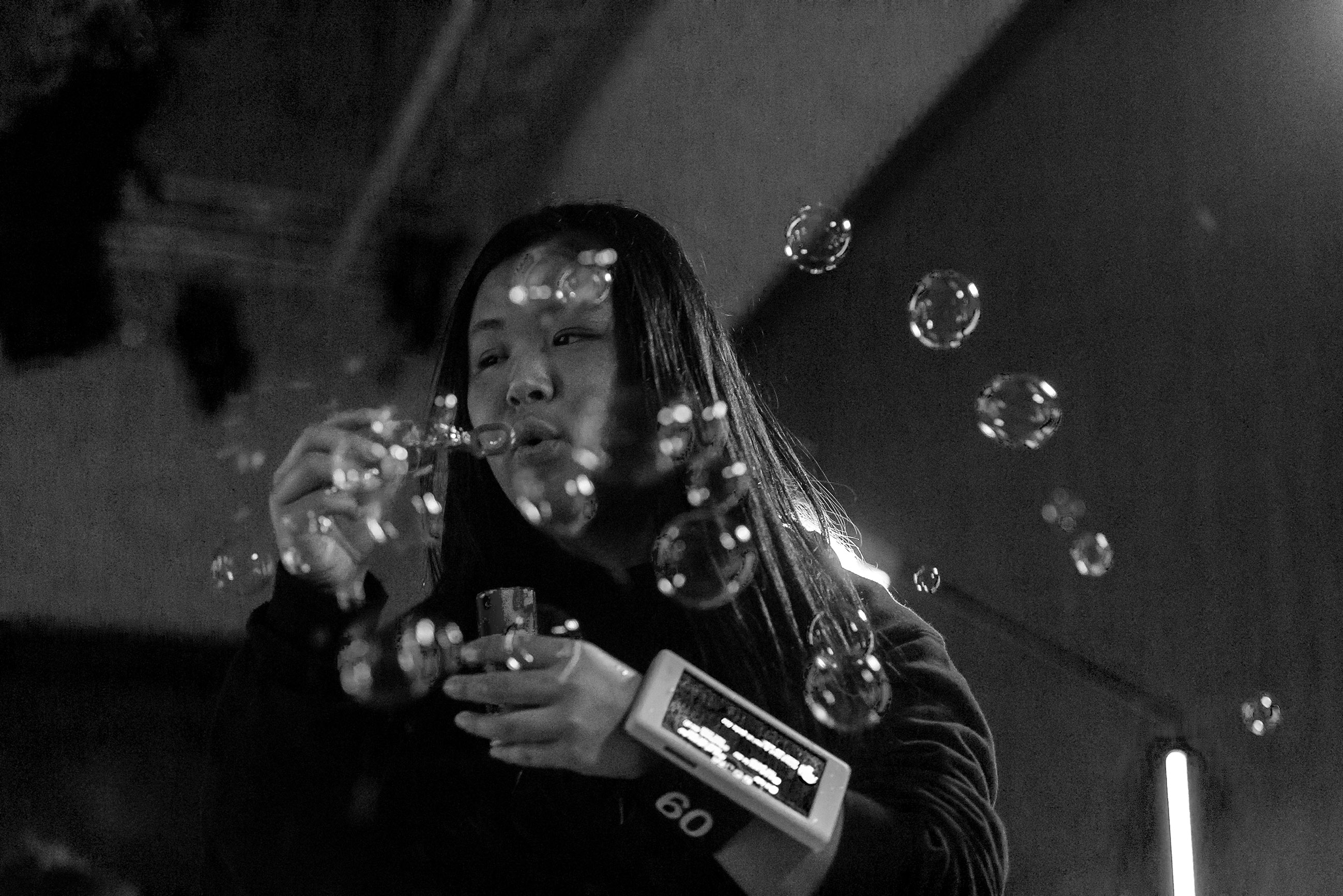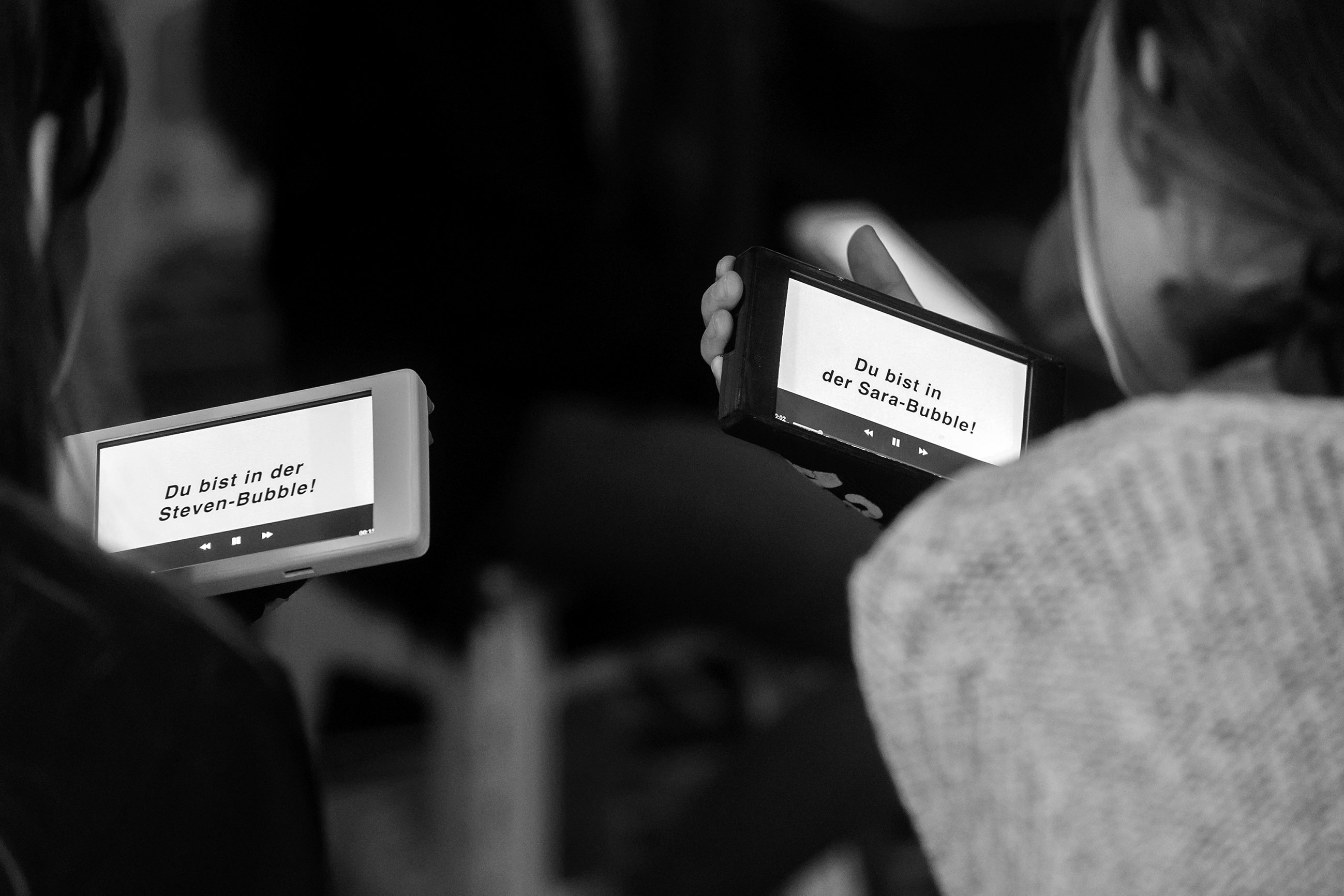 Bubble Jam is a game platform. Its servers connect test players (12 and up) via smartphones that they are supplied with. They follow the chat of developers, who are located elsewhere, and respond to their directions and questions to create a perfect round of Bubble Jam: What should it be about? Nightmares? Friends that you’ve never seen? Photos that suddenly emerge? About what “type” you are? Or about that fact that life goes on?