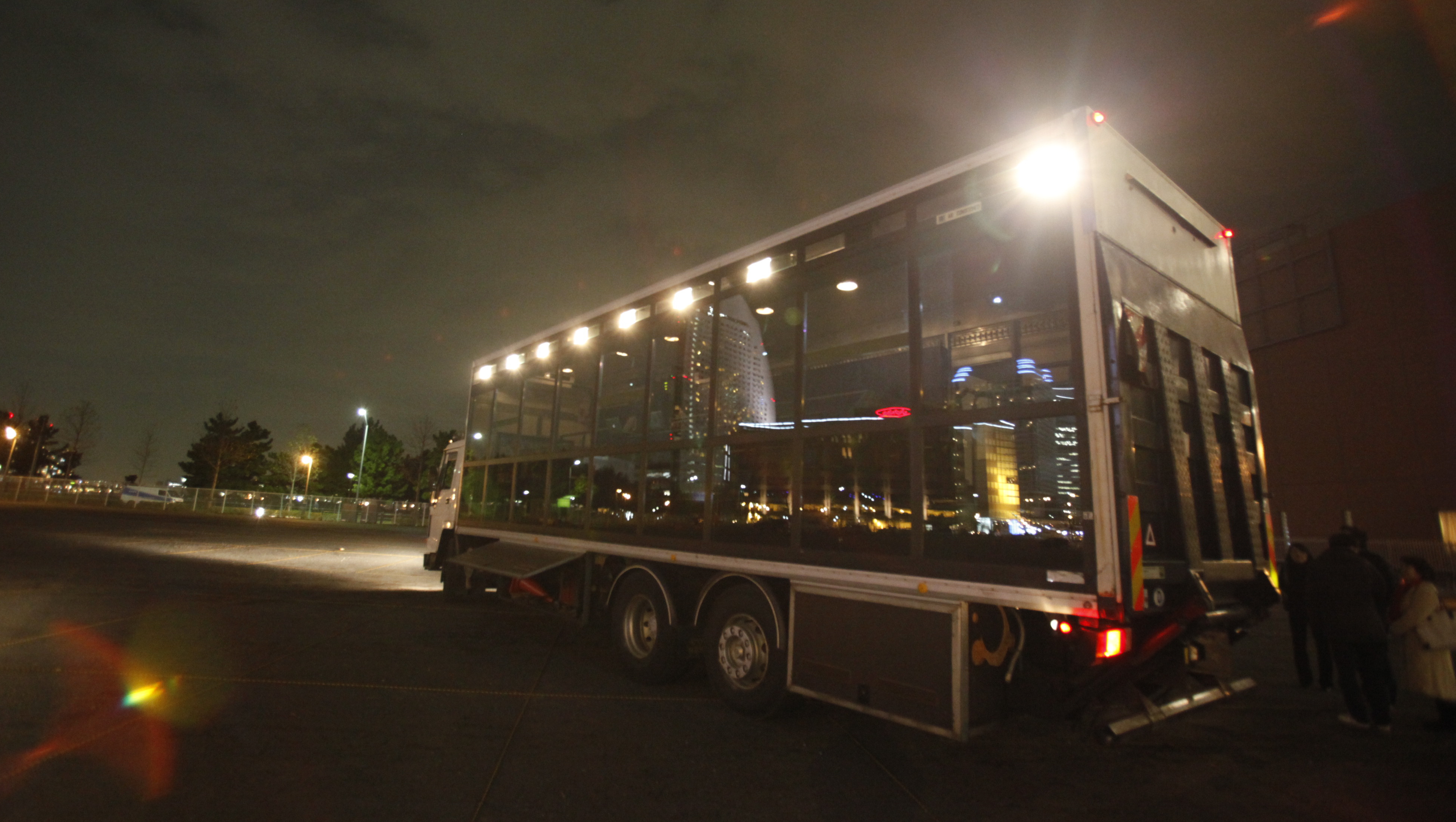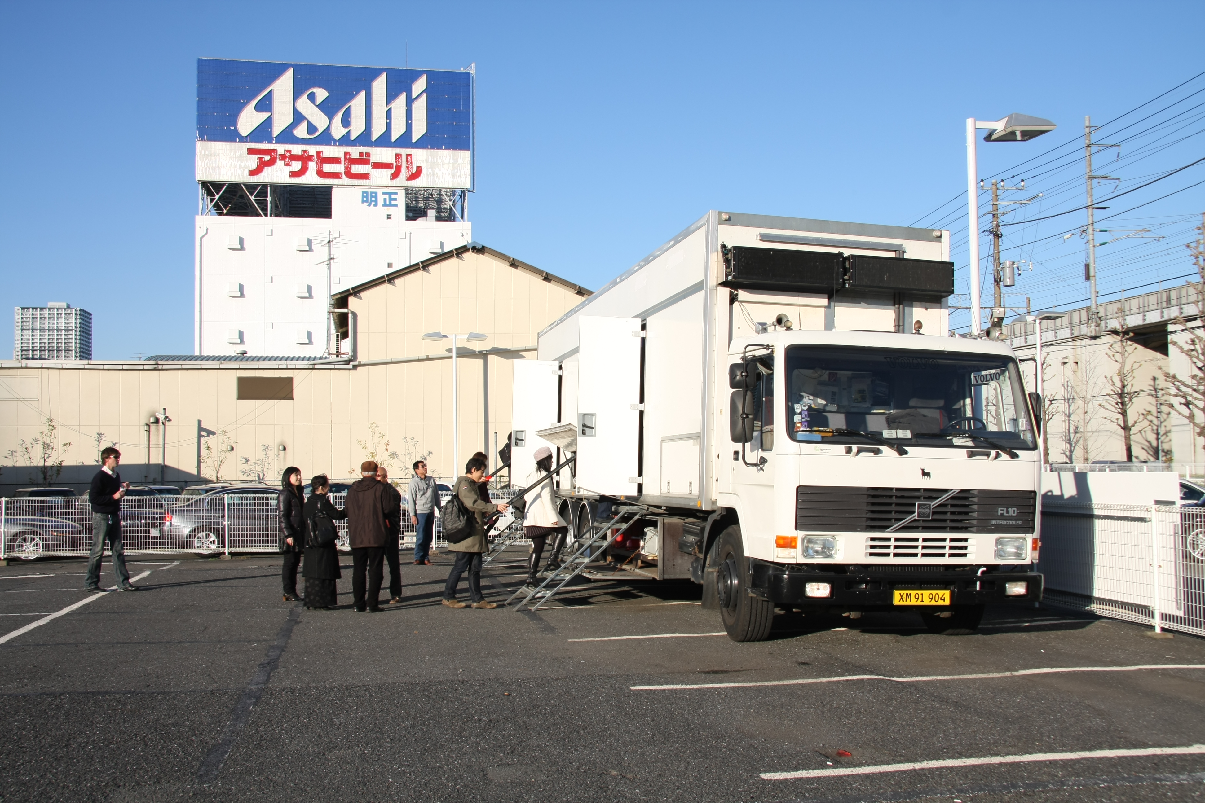 After two years on tour through Europe and Middle East with Stefan Kaegi's Cargo Sofia, Jörg Karrenbauer brings the converted truck to Asia and casted two japanese drivers. Their lives and music synchronize the transit - landscape to a 3d-Road-Movie. “Cargo Japan” invites the audience to take a seat in the back of a converted truck, and depart for a tour tracing the flow of goods. During the tour the two veteran drivers tell episodes from their trucker biographies.