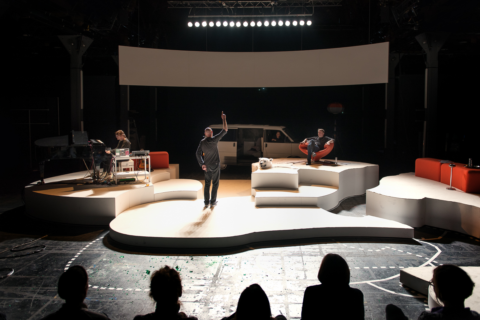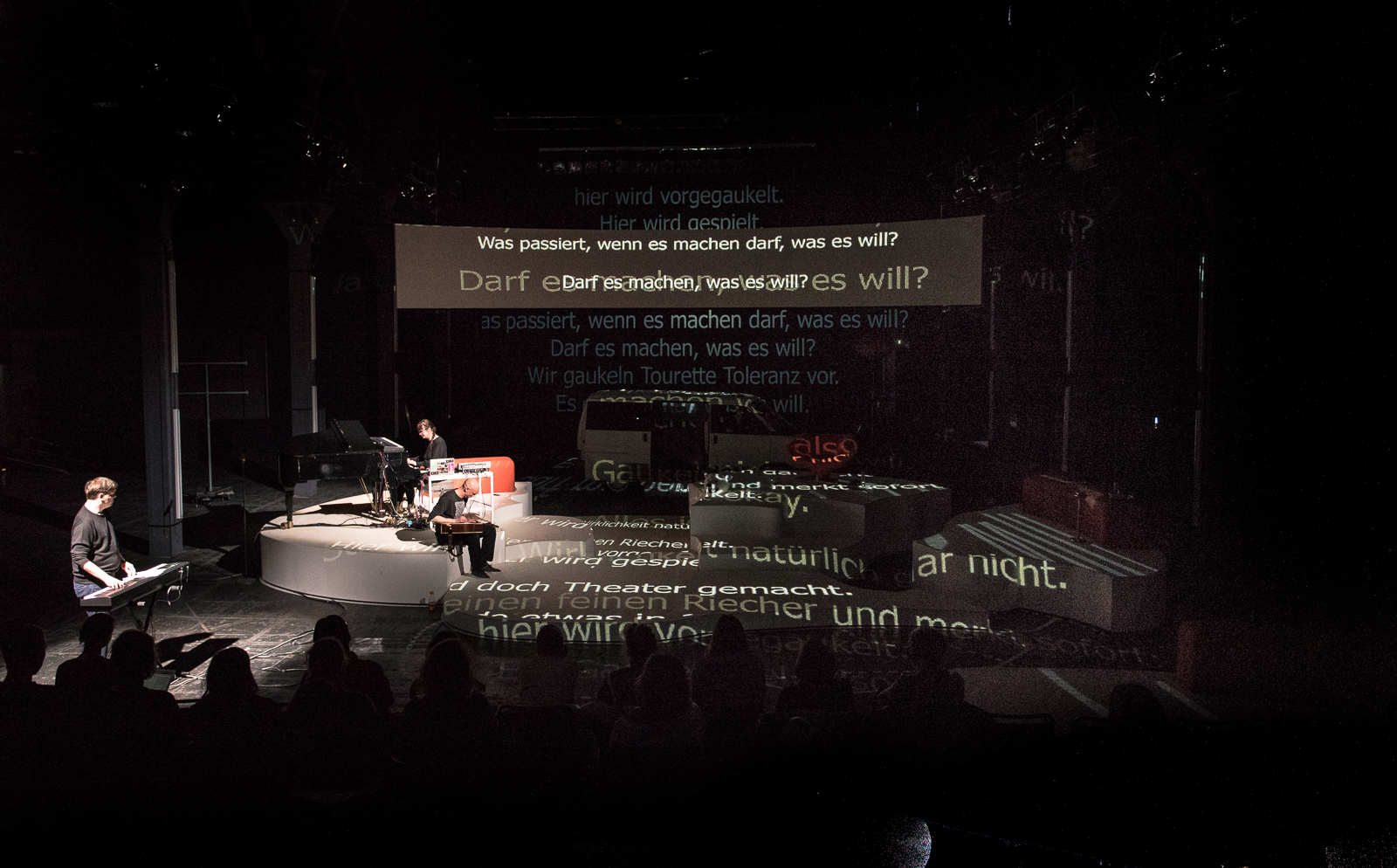 “No intension, it’s just Tourette”, is what Christian Hempel is quick to clarify from the onset, when he’s among people. He cannot control his rants, insults and motor tics. They are reactions to the world around him. The Tourette syndrome seeks attention. It craves confrontation and commotion. At first glance, it would seem impossible to create a theatre piece with Tourette: no text is safe; no movement can be repeated. Stage equipment has to be secured, special hotel rooms booked. In Rimini Protokoll’s new production, Christian Hempel steps onto the stage for the first time, together with musician and geriatric nurse Benjamin Jürgens and politician Bijan Kaffenberger. They also have Tourette. Collectively with musician Barbara Morgenstern, they put theatre to the test: to what degree can theatre tolerate an absence of intent? How much protection can theatre offer? And after the applause is over, it may become clear that this piece isn’t really about Tourette. It is actually about the audience, about theatre and about the fear of losing control.