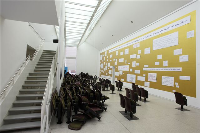 This theatrical intervention into every-day life is part of a collection of utopian ideas which have been installed in the hall and gallery of the art space Theaterlabels in Heidelberg: the handwriting of 80 Heidelberg citizens was “borrowed” for this. They were asked to write the pre-formulated ideas onto small pieces of paper. These were enlarged and pinned onto the big wall of the exhibition hall. Another piece of paper describes a court room scene in which the listeners are not interested in the verdict, but in the way it is staged. Other notes are about performances taking place underneath the tables of a gourmet restaurant. The most radical performance concept consists of a singular encounter. The pieces of paper are presented on a golden background together with 100 old chairs taken from the auditorium of the Heidelberg theatre. Some chairs are for sitting on, others lean against the wall. Some have been turned into swings, from which it is possible to take a closer look at the notes.