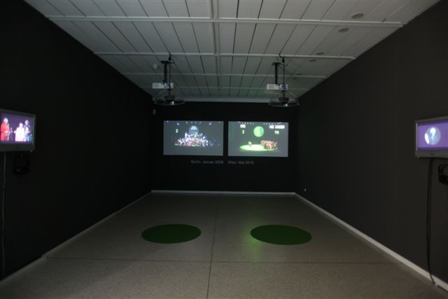 The exhibition focuses on the different and diverse Rimini productions of the past decade. Visitors are invited to discover the differences in answers given to the same questions by 100 people from Vienna and 100 people from Berlin, or meet an Indian call centre operator in a live telephone call. In the entrance area of the exhibition they may, by means of written documents and projections, re-experience the great theatrical spectacle of a board meeting staged under the strict direction of the Daimler AG Department for Investor Relations at the ICC Berlin in 2009.