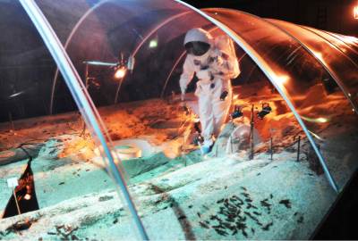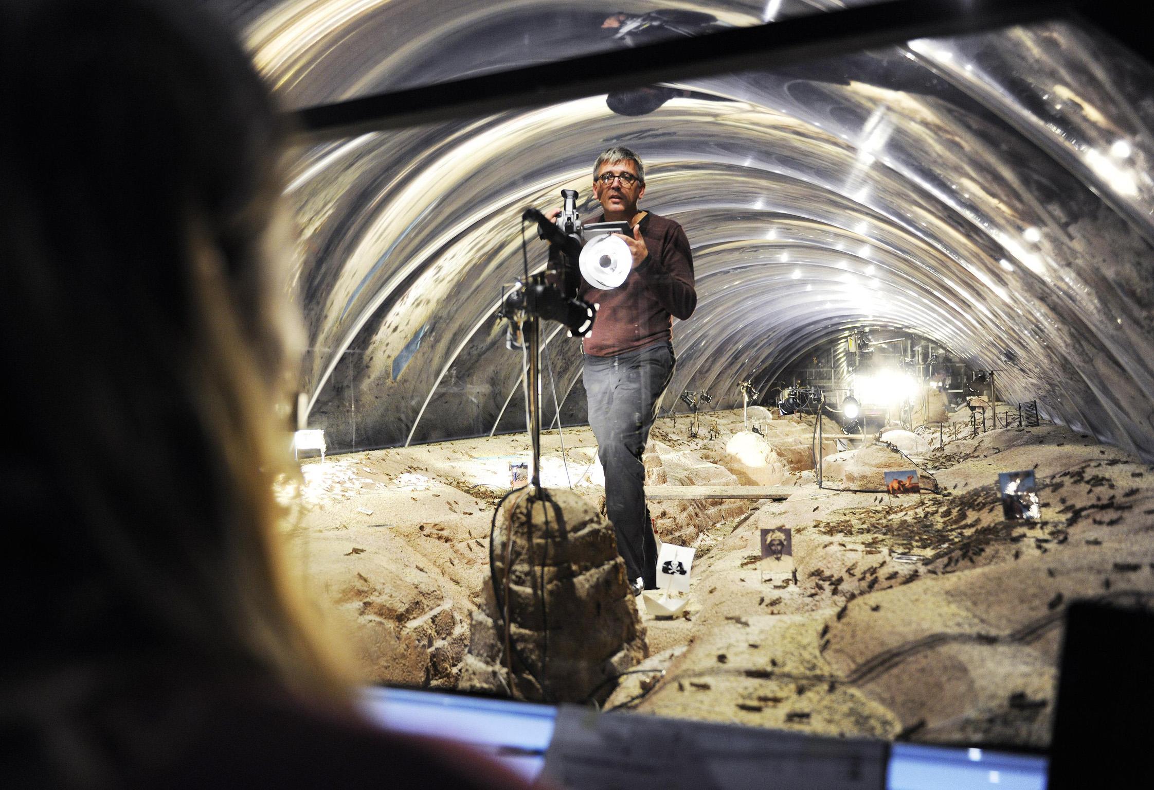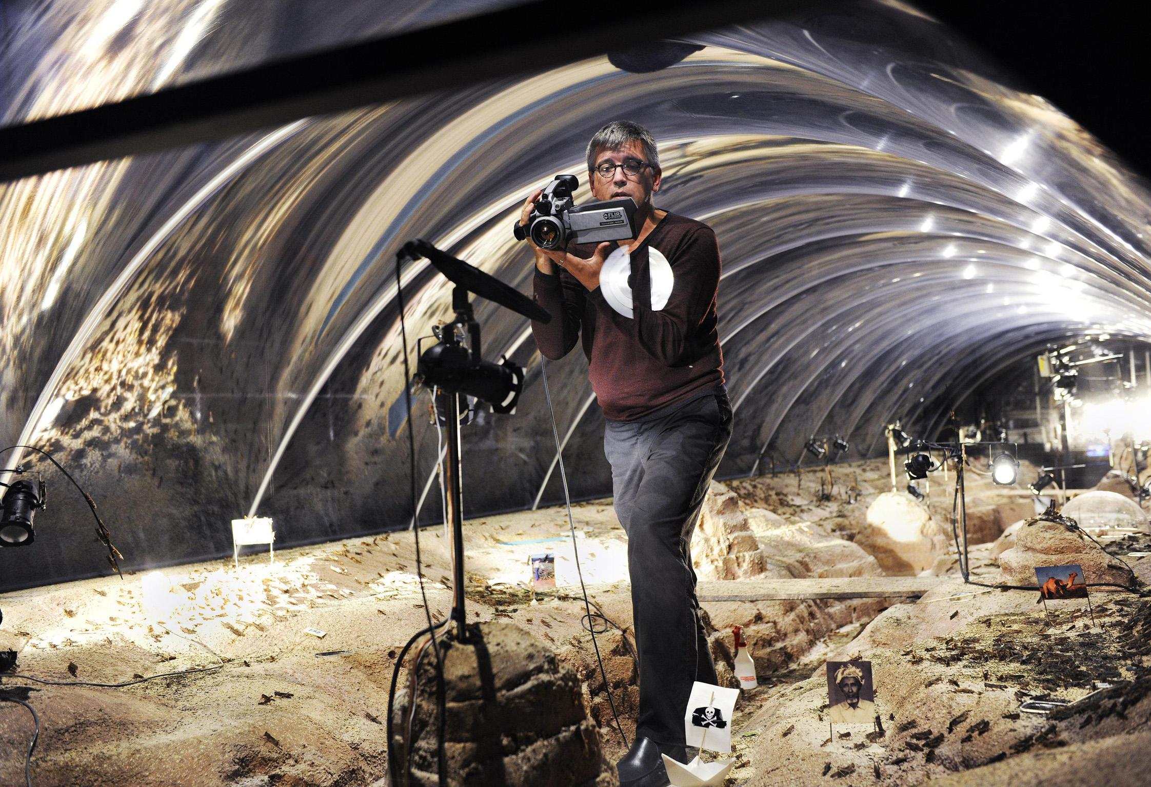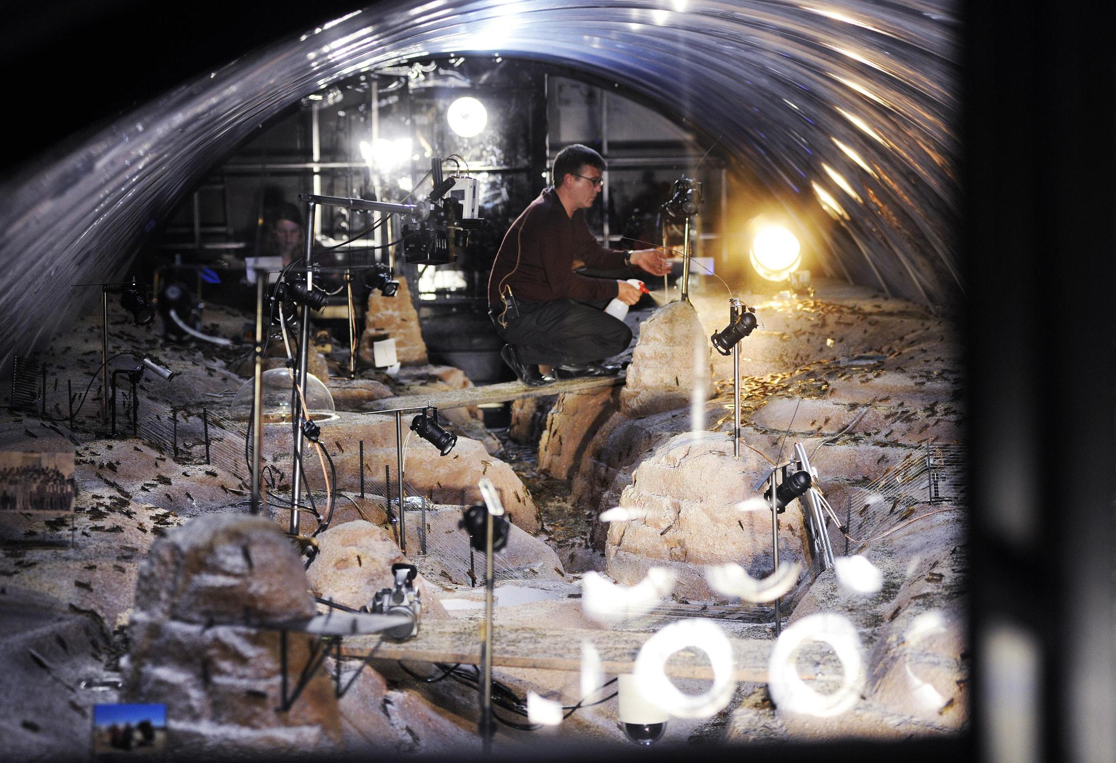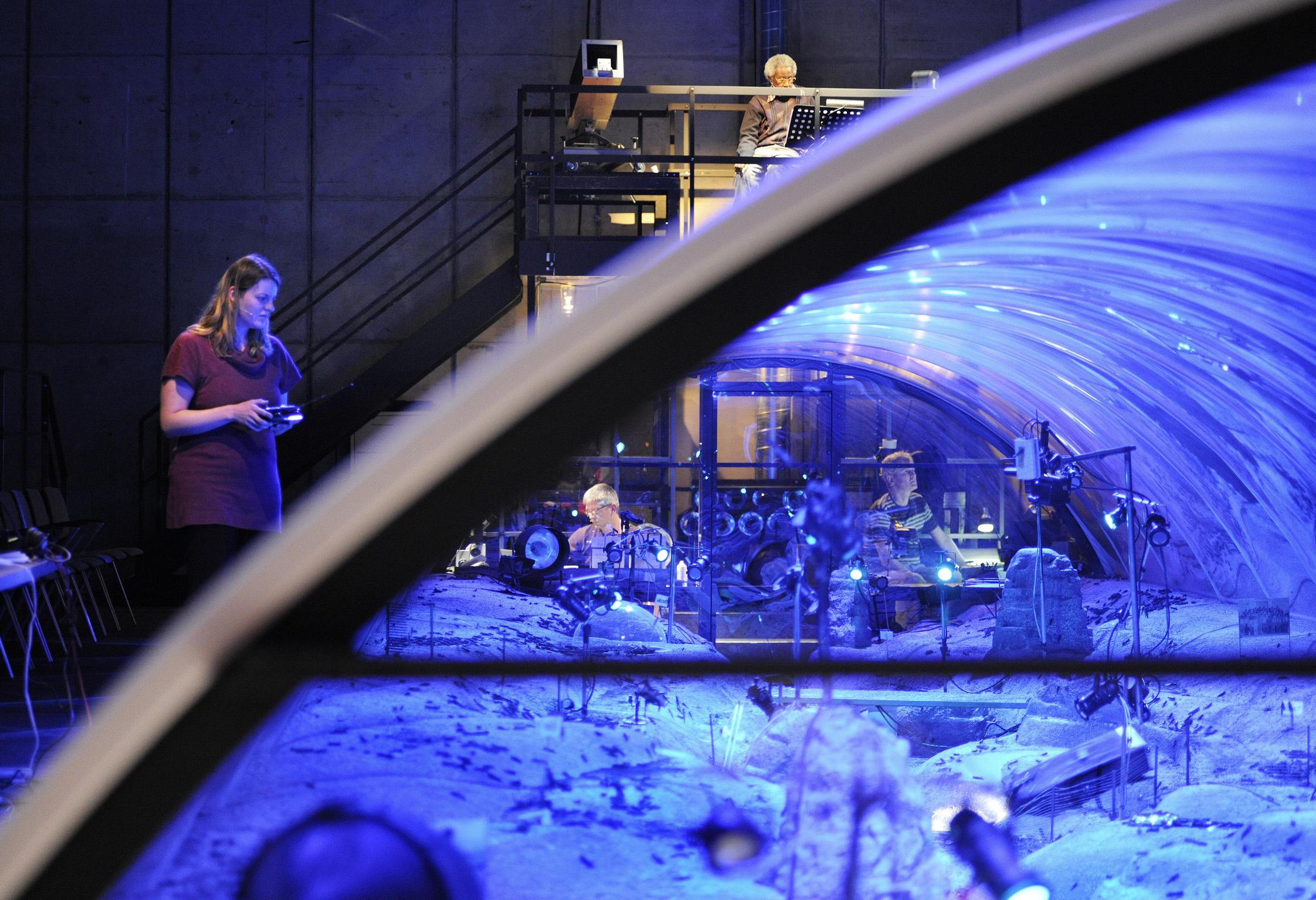 In a production in which the performers outnumber the viewers, Stefan Kaegi has developed a terrarium as a parallel universe at Schauspielhaus Zurich. Thousands of locusts populate a set built of sand and wheat: a natural habitat in exile. Observed through cameras and binoculars, the staged process is set to music. Migration researchers, food engineers, astronomers and insectologists embark on an expedition into an alien insect world measuring 50 square metres, deepening their exploration from day to day.
