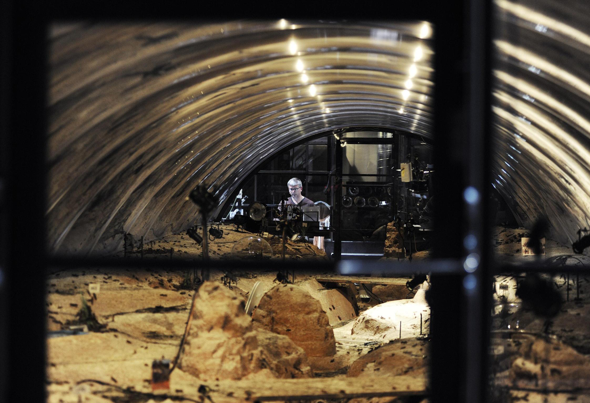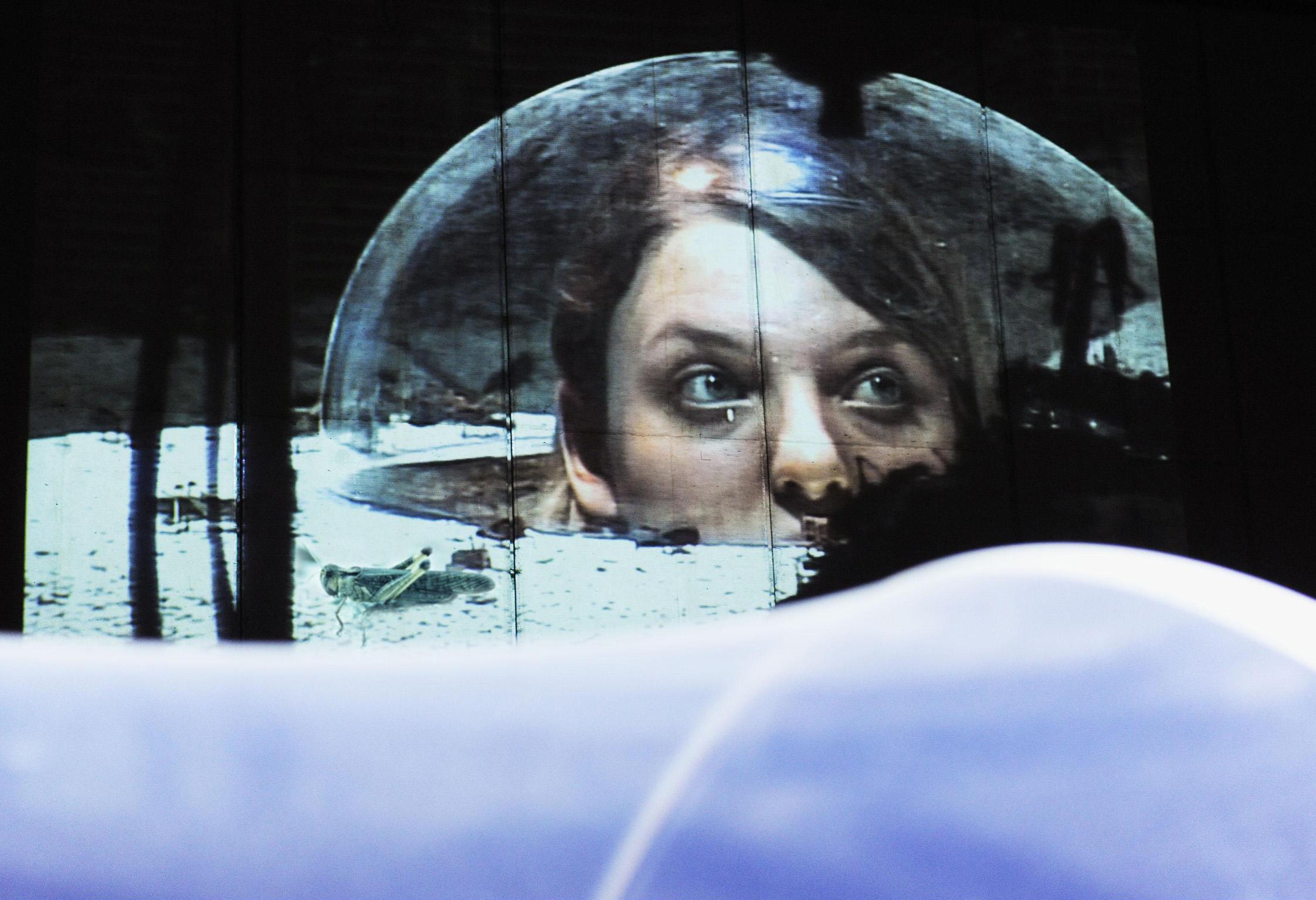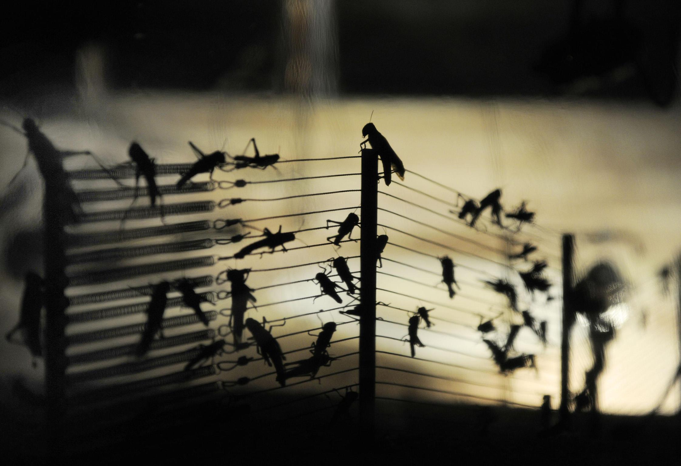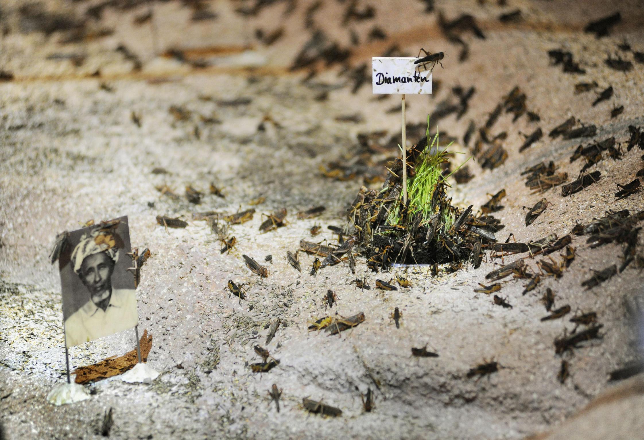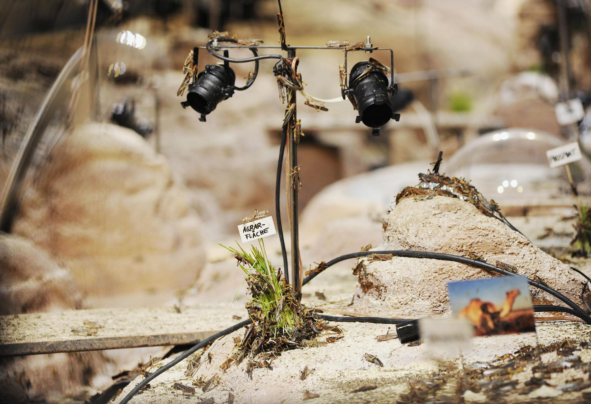 Ultimately, the on-stage biosphere becomes a model of future life after climate change. Who eats the most, and what happens if there's not enough for everyone? How does life function without water? How does the locust population self-organize, what are the effects of changes in their habitat? According to Canetti, every time we look at an animal we see a disguised human being laughing at us. But how do we look 8,000 locusts straight in the eye?