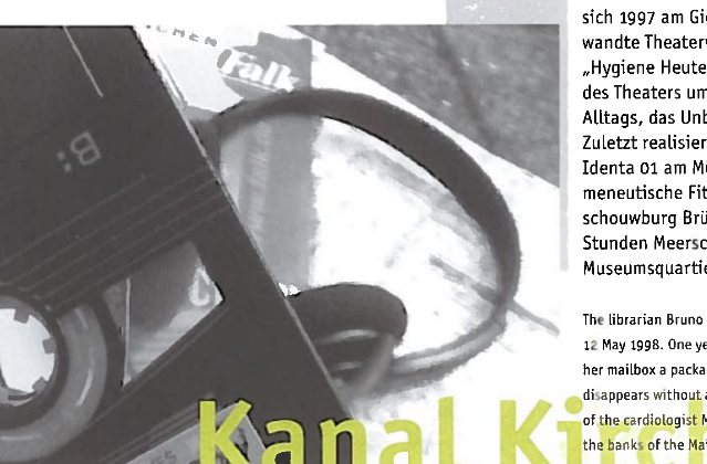 “On May 25th, 2001 Simone S. is given an envelope in a massage salon in Munich. In it, she finds a Walkman. She follows the voice step by step through Munich and is never seen again. Bernd Ernst and Stefan Kaegi have developed a concept for an audio theatre play in which the viewers/listeners embark upon a twofold journey: following the instructions on the tape, they walk through both the real Munich and the fragmentary story prescribed by the author. The audio experience and real visual impressions combine to form a private experience within the public space of Munich.” This is how the SPIELART 2001 programme advertised KANAL KIRCHNER. The dystopian audio walk draws the audience deep into a society characterised by surveillance and manipulation. 18 years after the play first appeared, public space and its rules have changed in such a way that KANAL KIRCHNER’s saturnine, trashy visions appear almost tame.