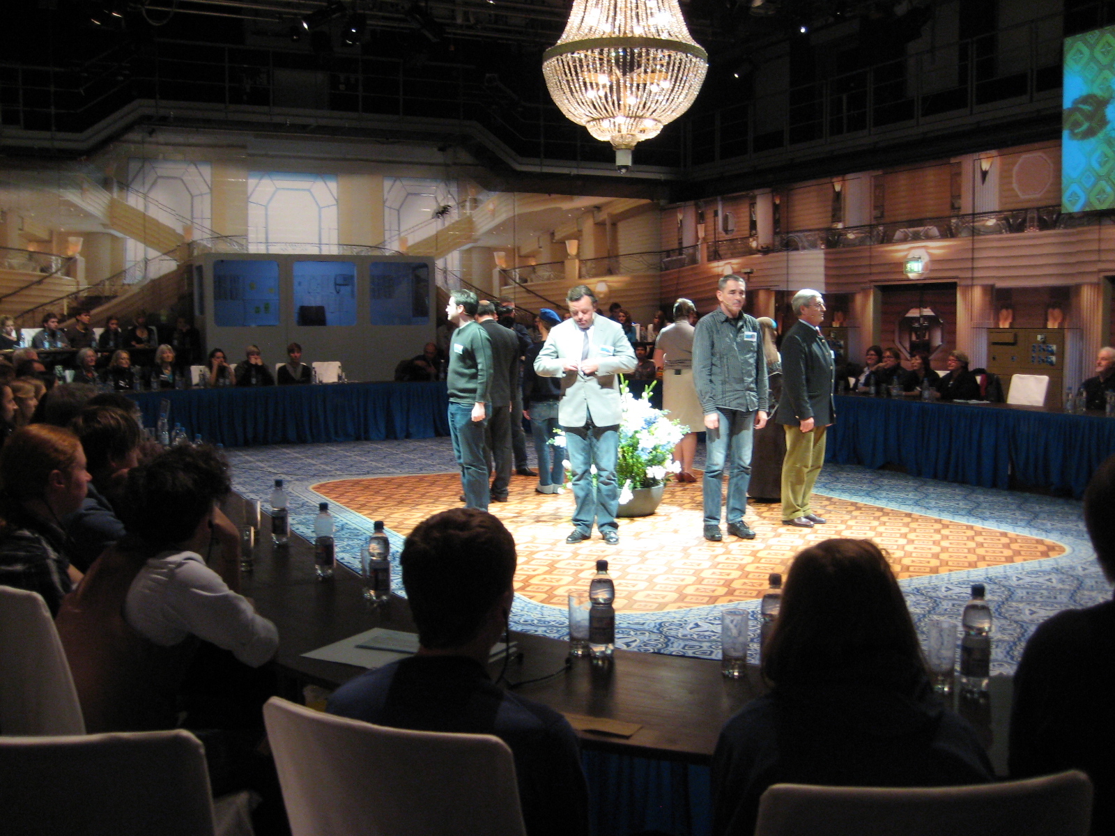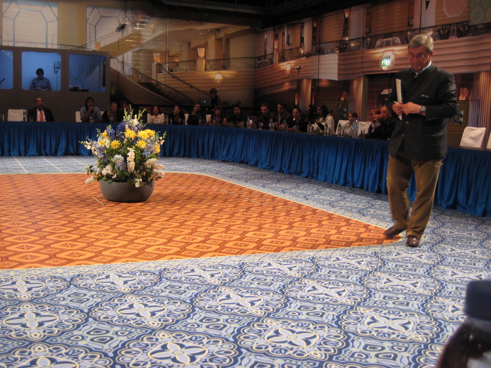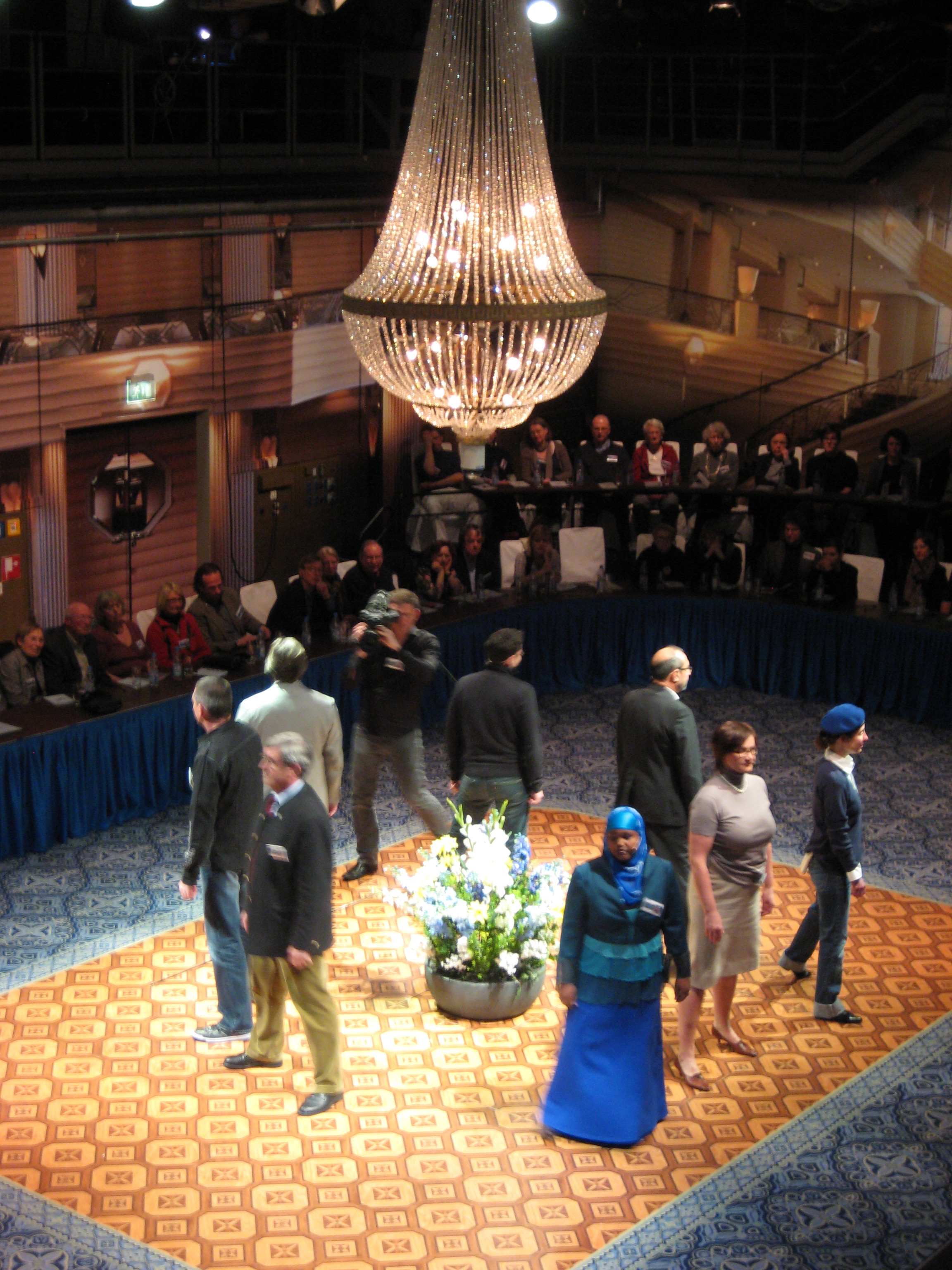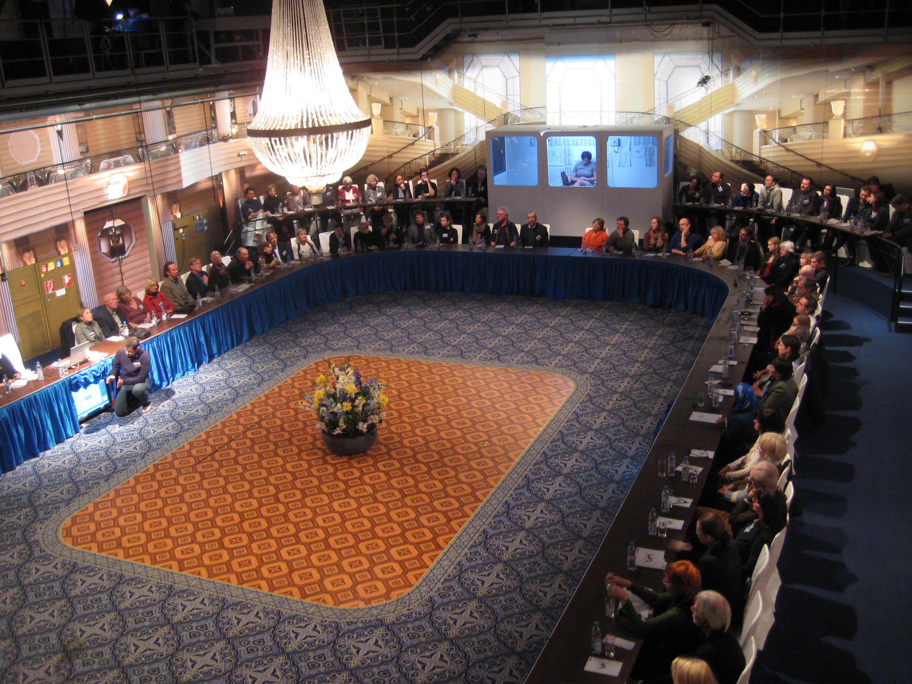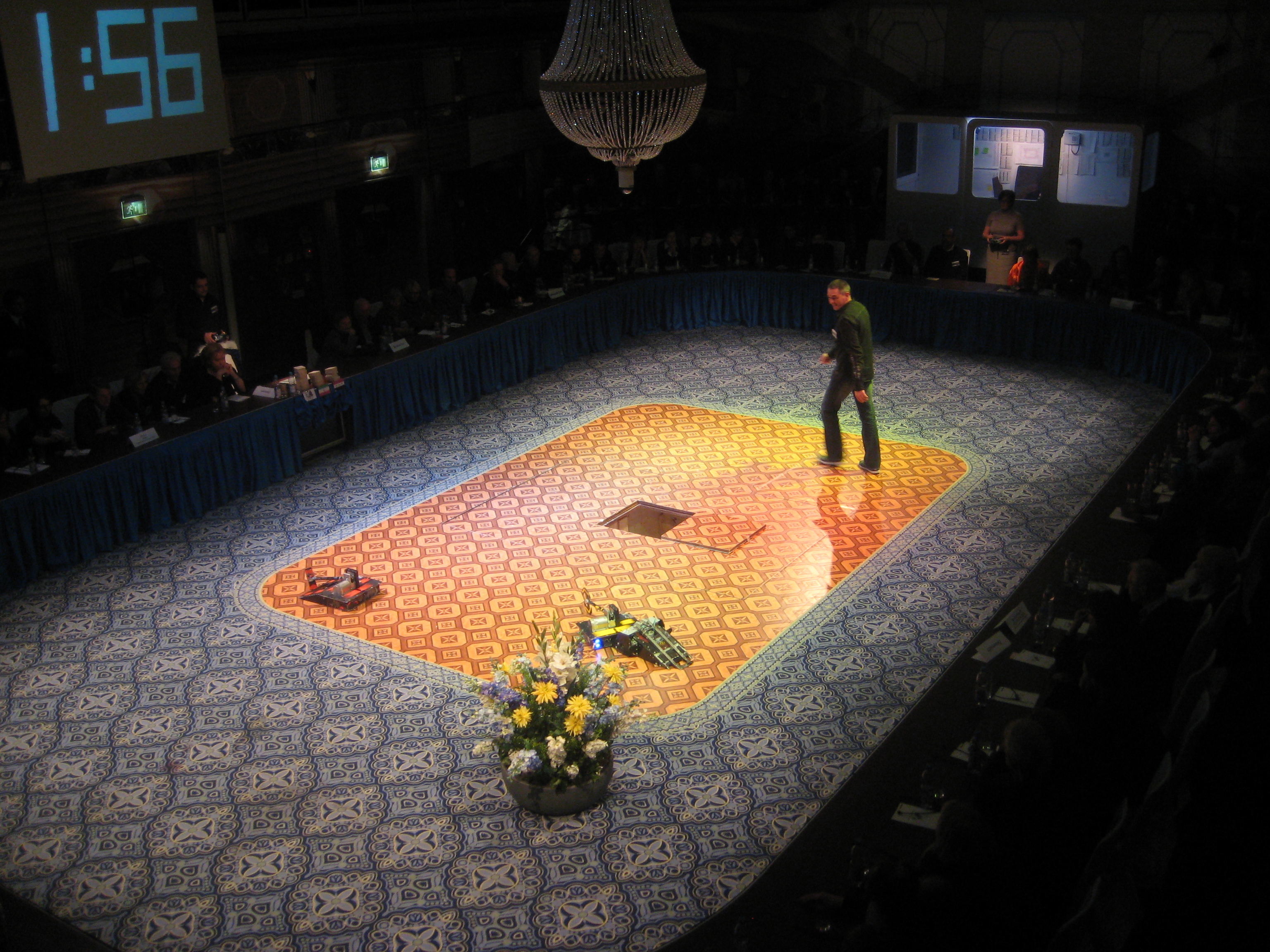 At Kammerspiele, Stefan Kaegi stages a meta-conference at a vast roundtable. In confrontation with asymmetric and privatized warfare, experts in security technology and fun robotics are brought together with people whose lives were changed by foreign-policy decisions. All the spectators wear headphones transmitting voices that cause them to constantly change their perspective – from the viewfinder of a frontline cameraman to the booth of a conference interpreter, from a young woman suffering the loss of half her family in Somalia to the photo-albums of a former Chief of Protocol, from the strategic wargames of a political scientist to the Afghanistan of a German soldier and the Munich of an Afghani organizing the resistance in his home country.