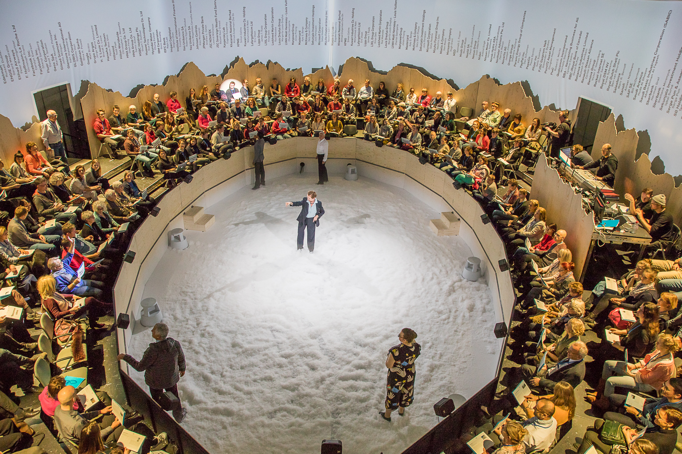 After Top Secret International (State 1) about global intelligence services, Society under Construction / Gesellschaftsmodell Großbaustelle (State 2) about mega-construction sites as a model for the current social structure and Dreaming Collectives. Tapping Sheep / Träumende Kollektive. Tastende Schafe (State 3) where the importance of digital space for democratic processes is explored, the final part of the tetralogy uses the example of the World Economic Forum in Davos to look at a series of recurring, privately organized, global meetings of the world’s elite who, in their intense and select gatherings, aim to control the fates of the future as well as relationships of ownership and power.