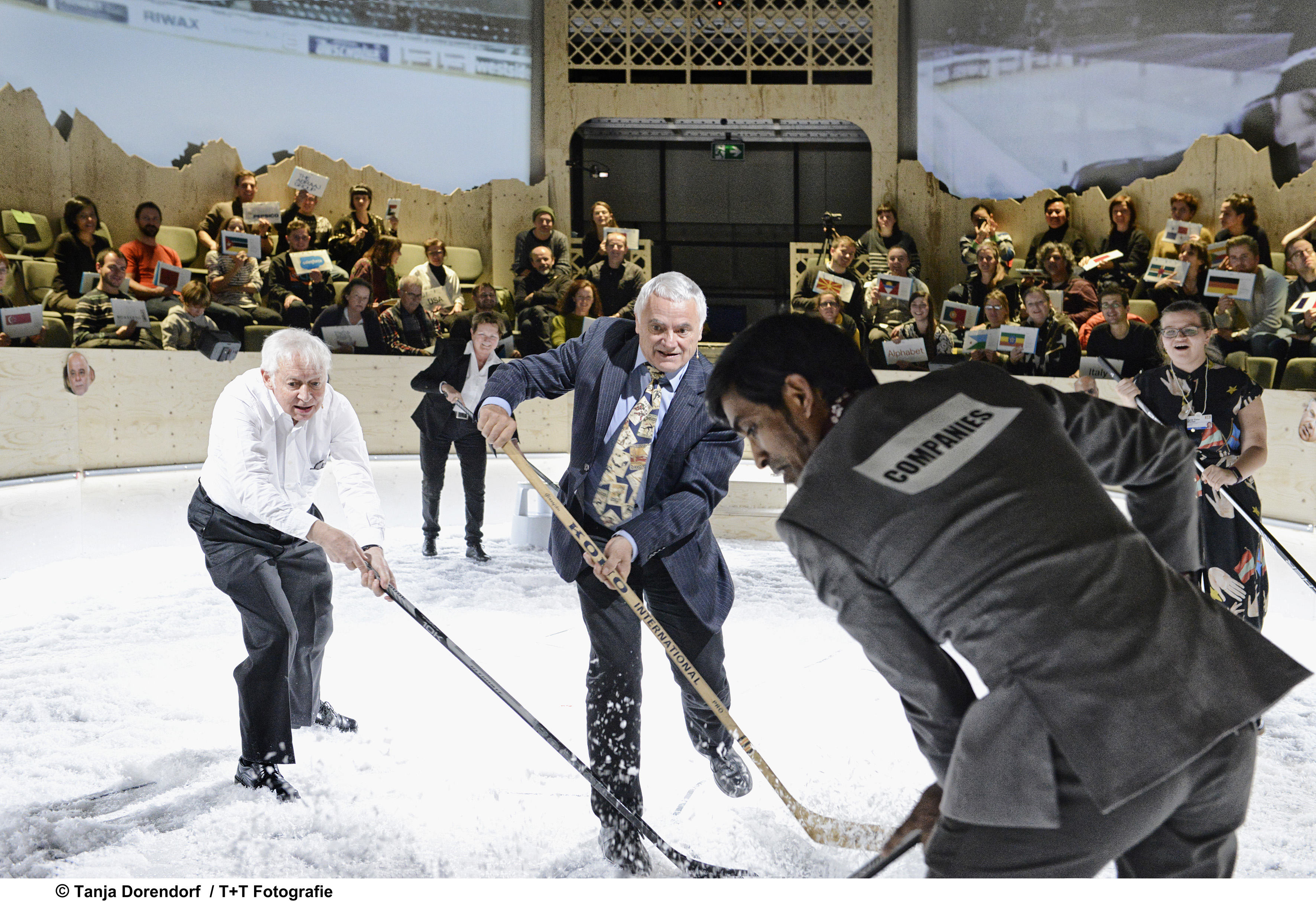 Weltzustand Davos (State 4) is part of the series State 1-4, a cooperation between Haus der Kulturen der Welt, Münchner Kammerspiele, Düsseldorfer Schauspielhaus, Staatsschauspiel Dresden, Schauspielhaus Zürich, and Rimini Apparat, as part of 100 Years of Now, funded by the Federal Government Commissioner for Culture and the Media due to a ruling of the German Bundestag. State 1 was co-initiated by the Goethe-Institut.